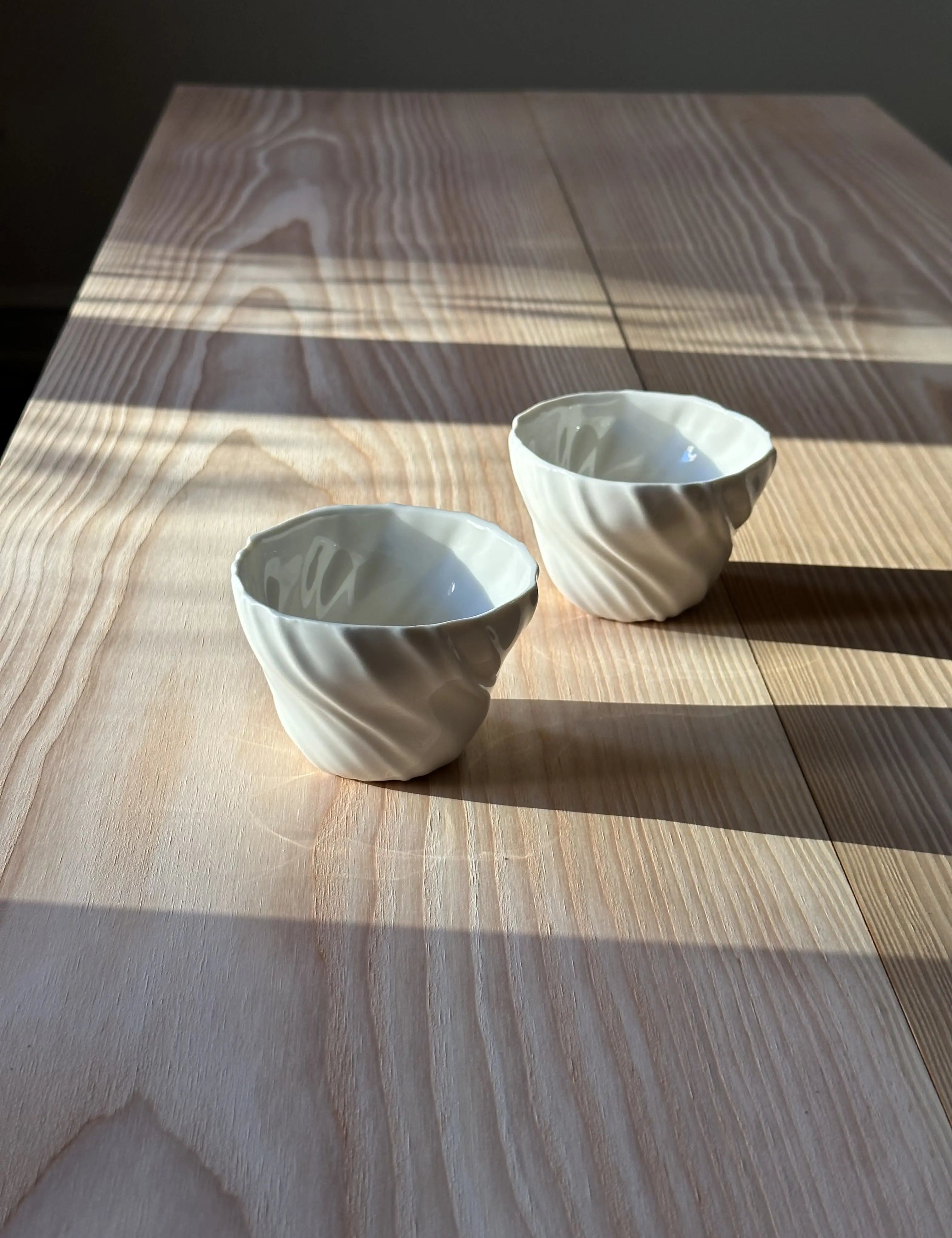 Unique Springtide Cup with handle from Danish Atelier Marée, handmade in Aarhus from fine white porcelain. The design is inspired by the rippled seabed revealed when the tide pulls back and uncovers the sand – a beautiful expression of nature’s transformations.