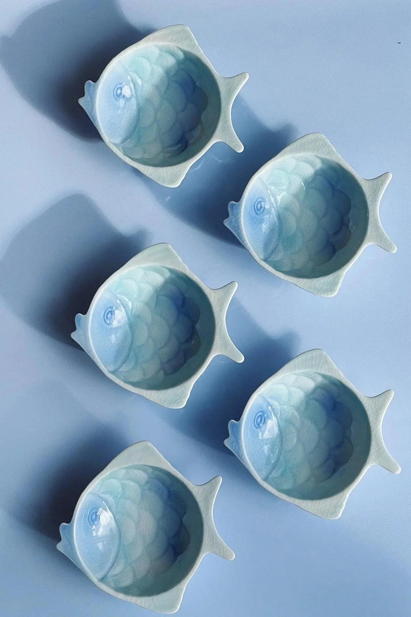 Japanese, hand-painted bowl shaped like a fish in the most beautiful shades of blue.