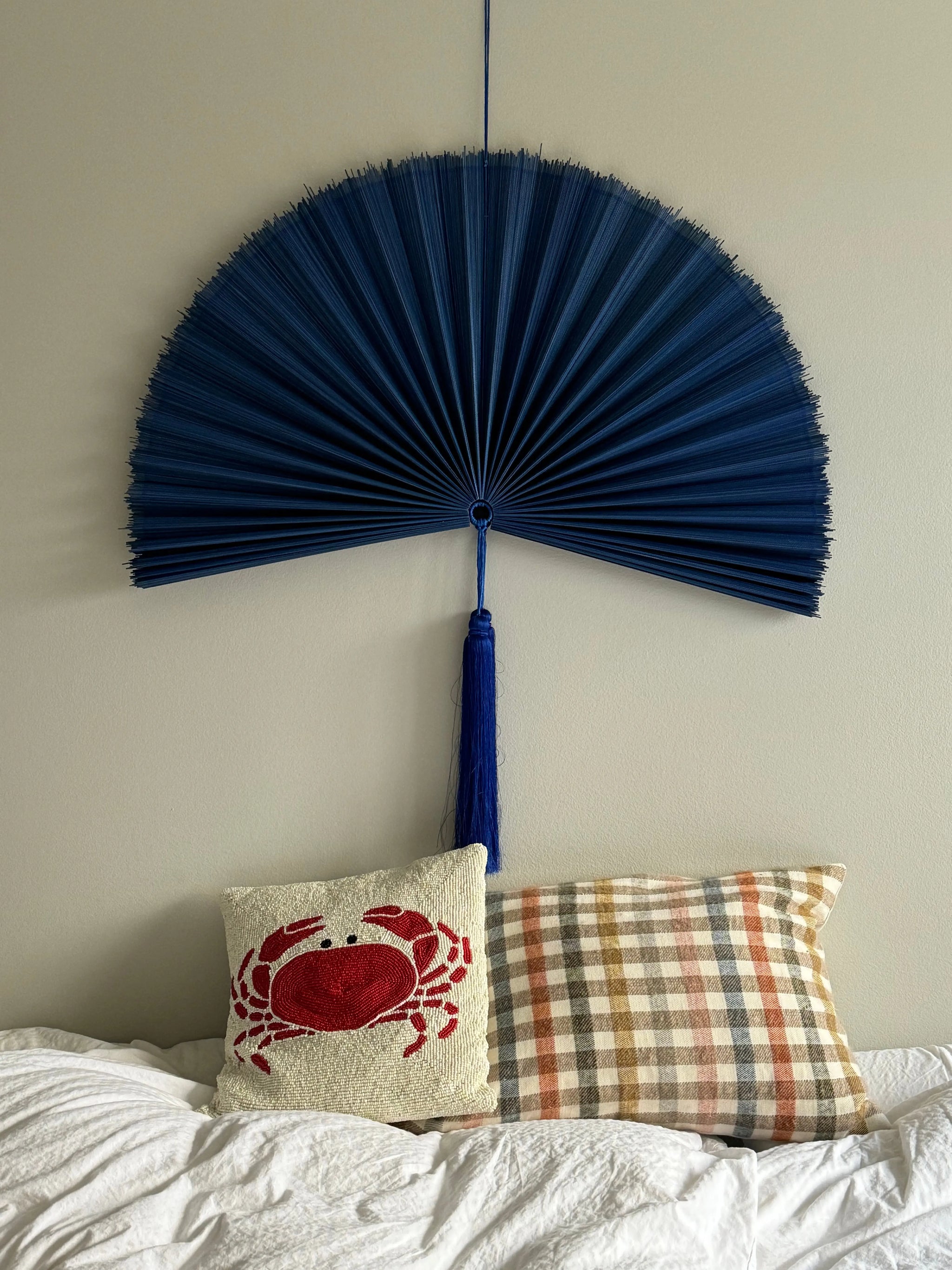 Discover our unique handmade bamboo fan from Vietnam in a beautiful dark blue shade, designed with two knobs and a practical hanger for easy mounting. The fan is available in two sizes and is available in several colors, so you can find the perfect match for your decor.
