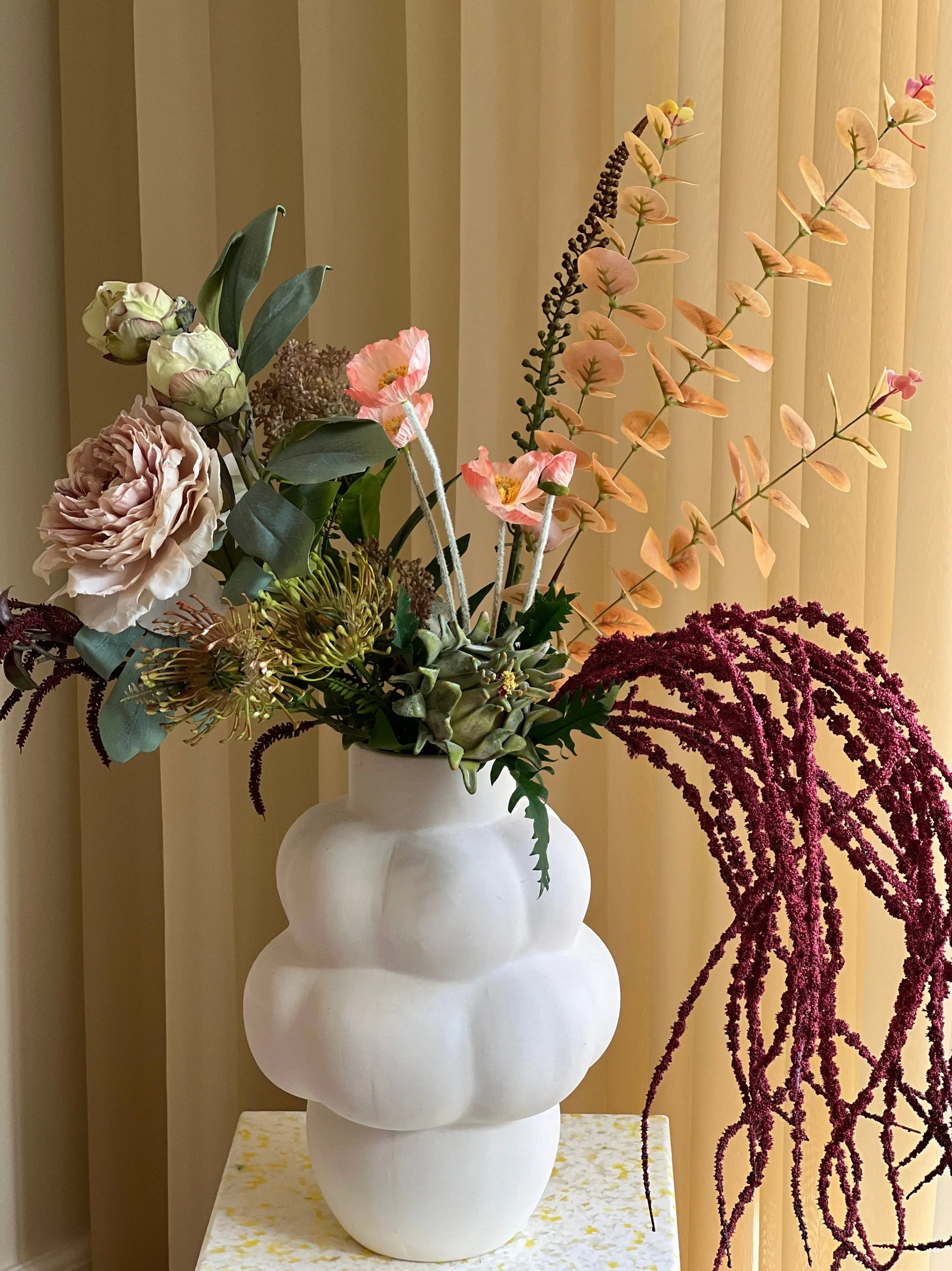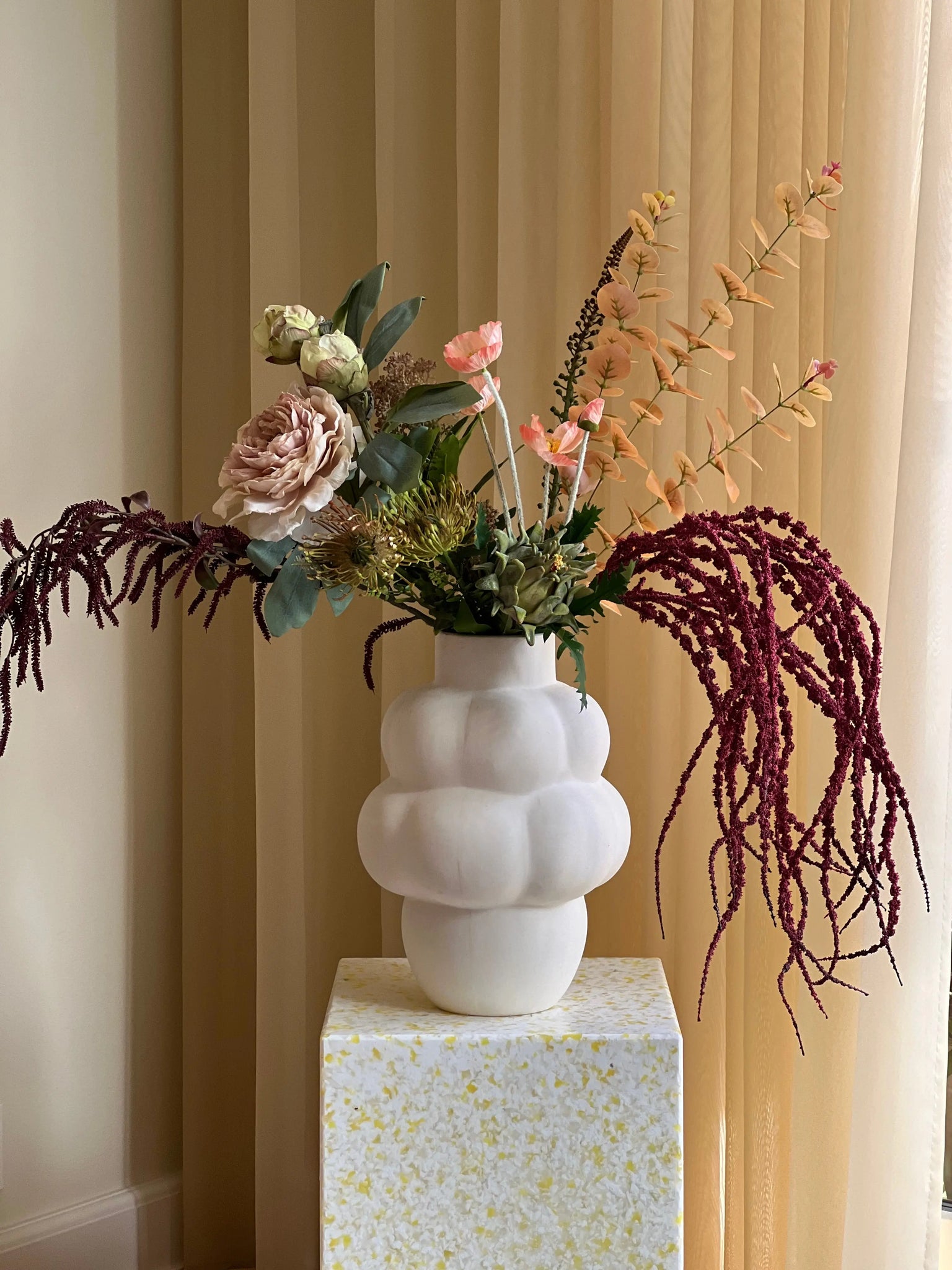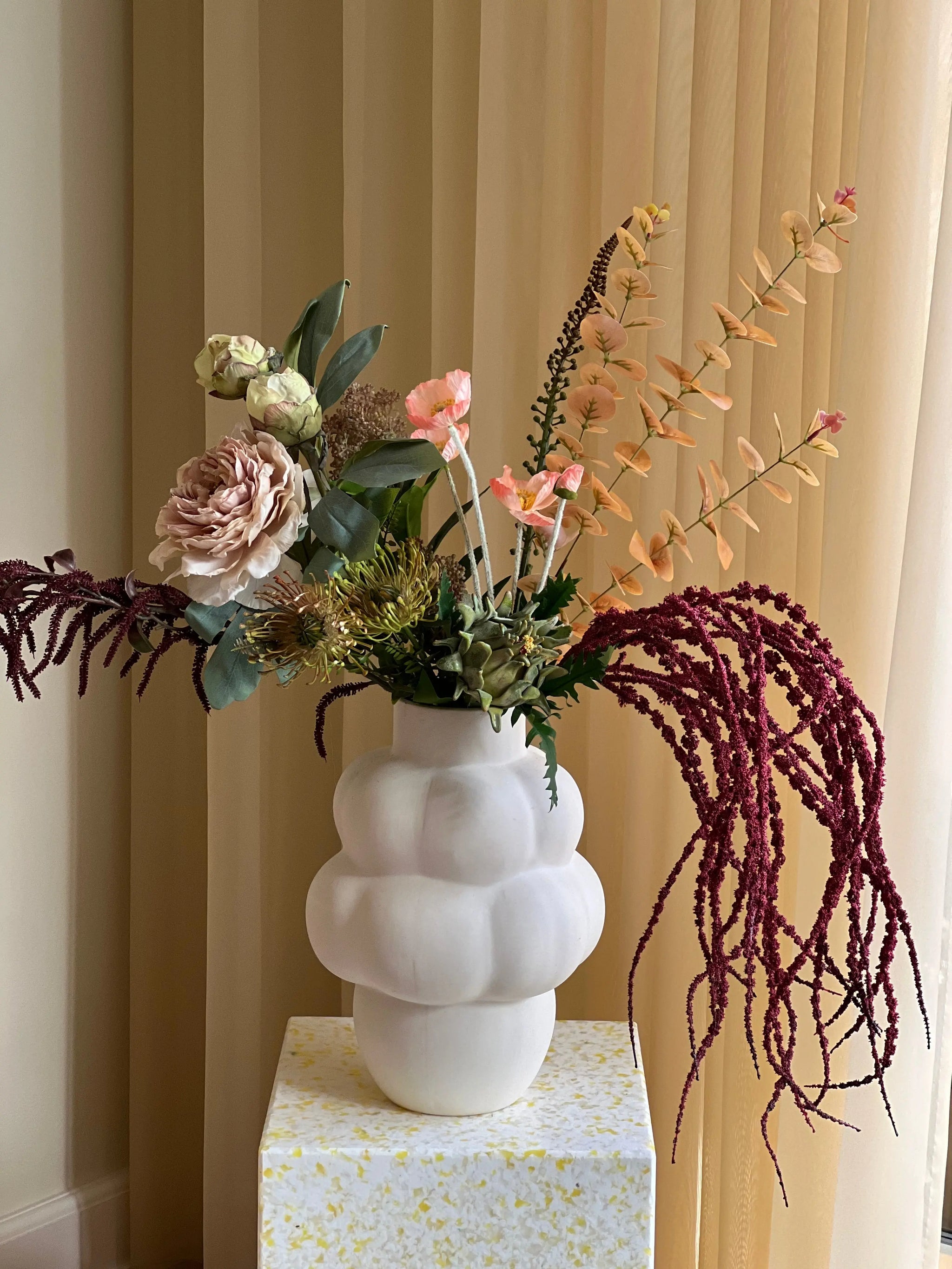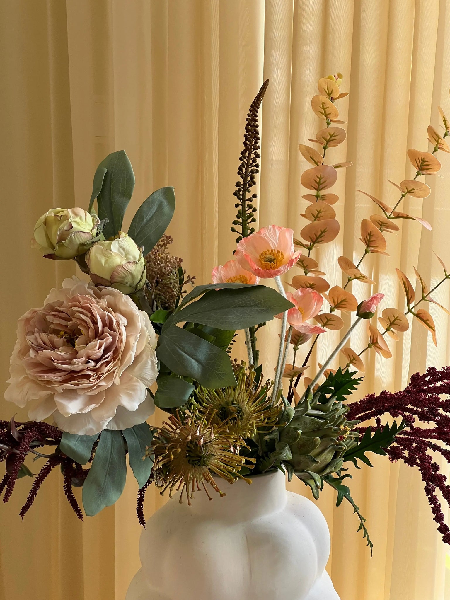 Our Eternity Bouquet is created with lifelike artificial flowers that can be bent and shaped as needed, so you can add your personal style. If you want to recreate the arrangement from the picture or add a unique twist, it is possible. You can also easily shorten the stems to adapt the bouquet to a smaller vase.