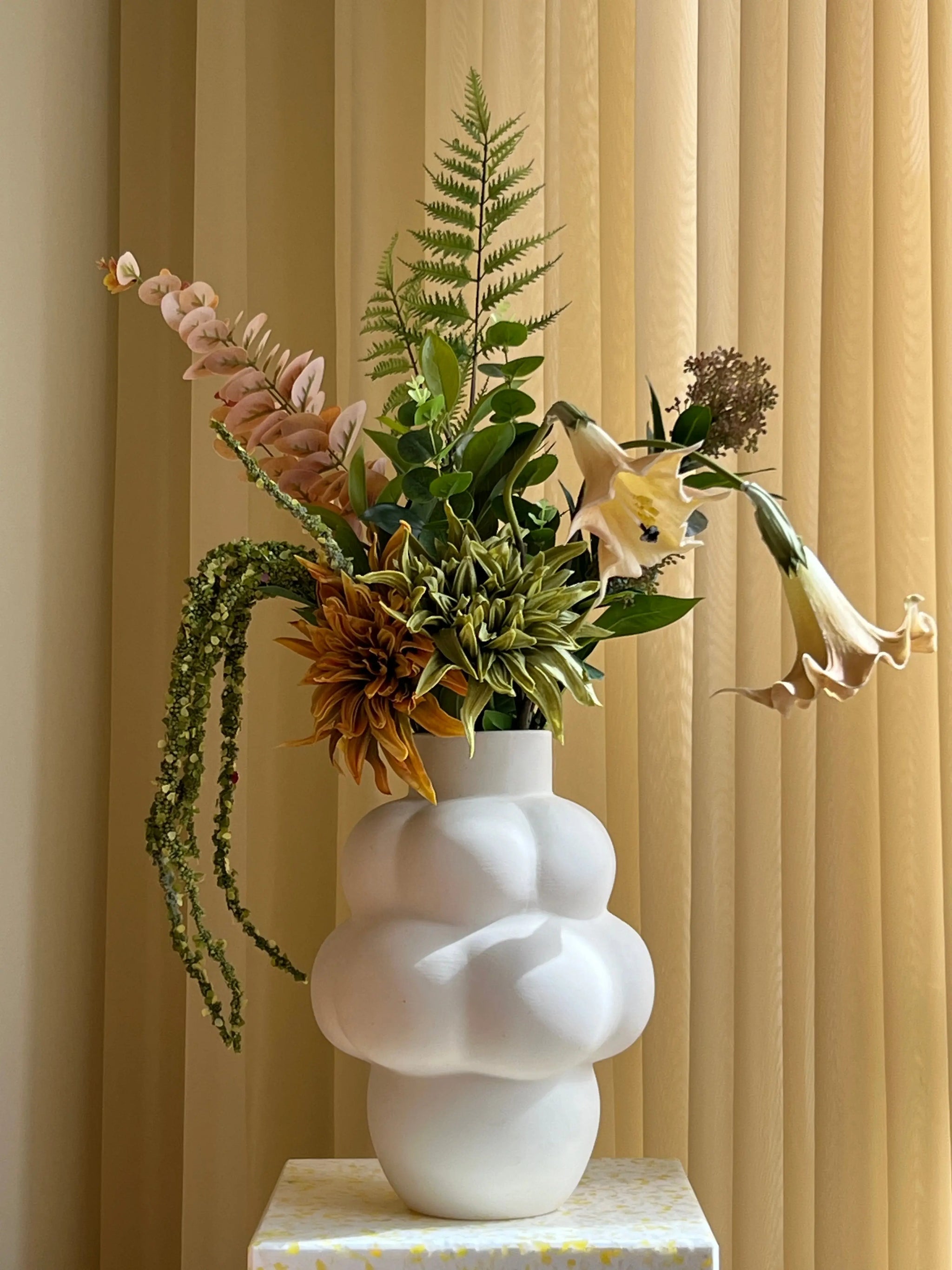 Let your home decor shine with our Eternity bouquet. This magnificent bouquet combines a range of beautiful artificial flowers including orange and green dahlias, green amaranth, fern leaves, burnt eucalyptus leaves and mandala flowers. Each element is carefully selected to create a harmonious and unique bouquet of everlasting flowers that will add elegance and warmth to any room.
