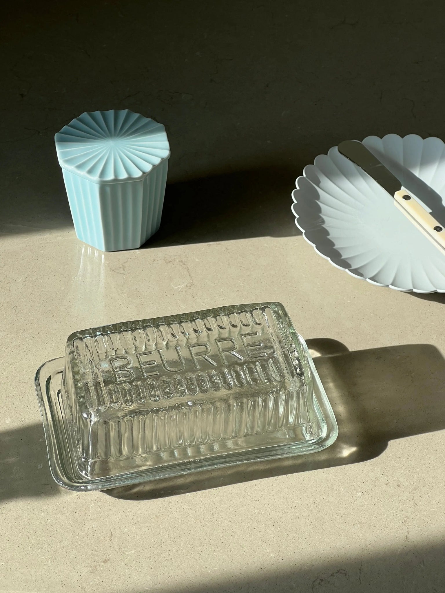 Indulge yourself with our fluted glass butter box with lid. This beautiful butter box adds a touch of charm to your servings of butter and creates an atmosphere of luxury and elegance at the dining table. Made from durable glass and with an integrated lid to keep the butter fresh and protected. On the top of the lid is written "Beurre", which adds an extra detail to the design. Perfect for a luxurious breakfast or as a decorative item in your home. The butter box can also be used for things other than butter, e.g. cakes or the like.