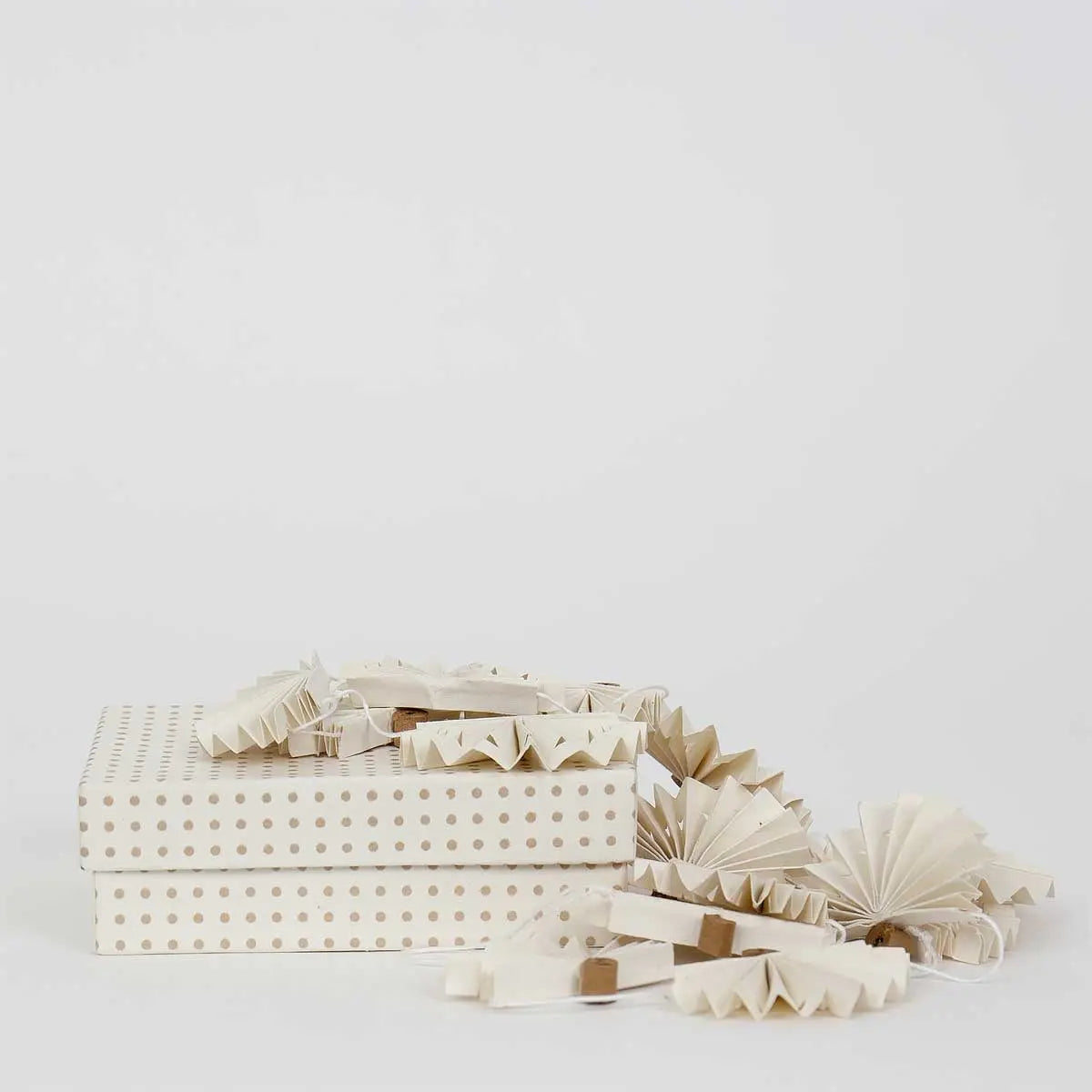 A poetic, handmade garland featuring folded paper shapes and small wooden beads, bringing warmth and calm to any interior. The garland measures approx. 1.5 meters and can be hung as wall decor, over a doorway, or along a shelf. Each piece is fair trade and carefully crafted by hand – with attention to balance and form.