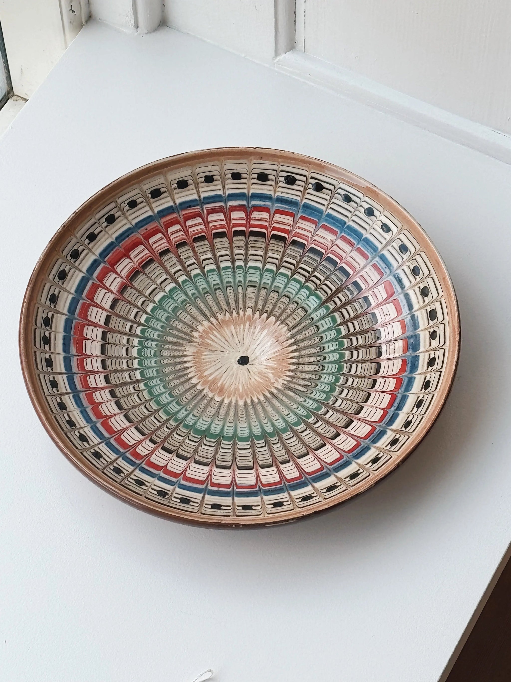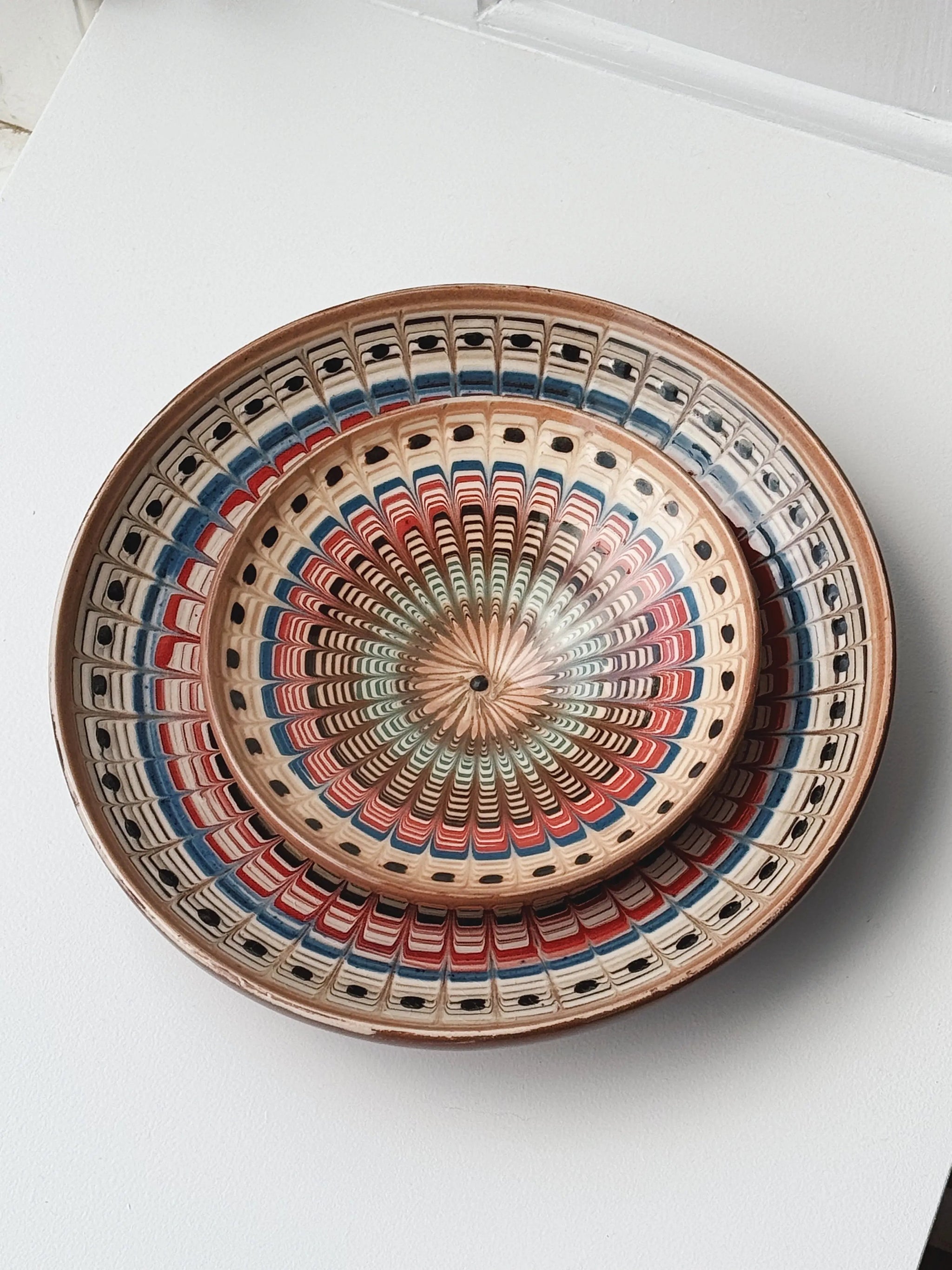 Beautiful and decorative ceramic plate/dish from the Romanian town of Horezu. Crafted by skilled local artisans, each plate is carefully wheel-thrown and hand-painted, giving it a unique character and beauty. No two plates are exactly alike, and the technique is so exceptional that it has been recognized as part of UNESCO’s cultural heritage.