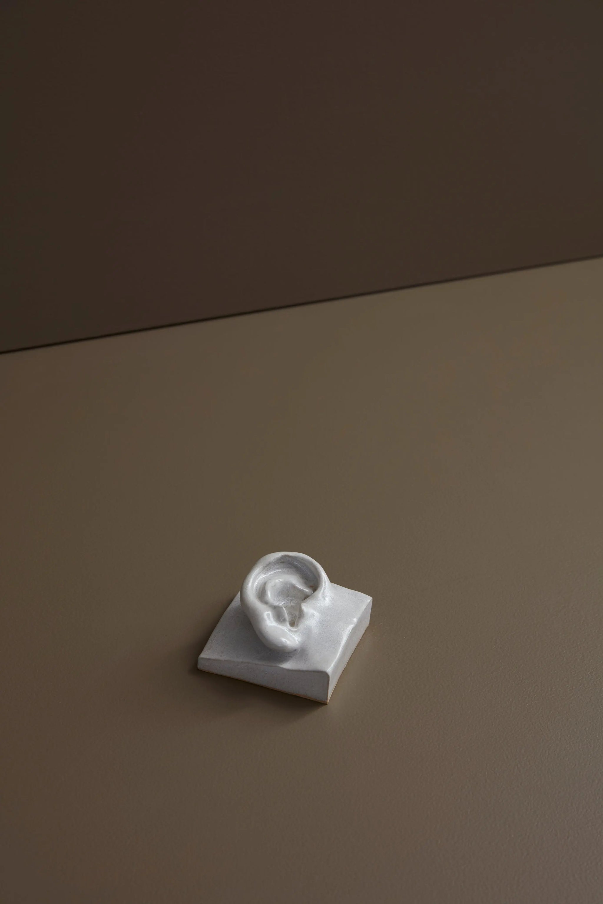 Made from glazed white stoneware in the color AntiqueWhite, this ear is designed to be hung on the wall and works equally well on its own as it does alongside other face fragments.