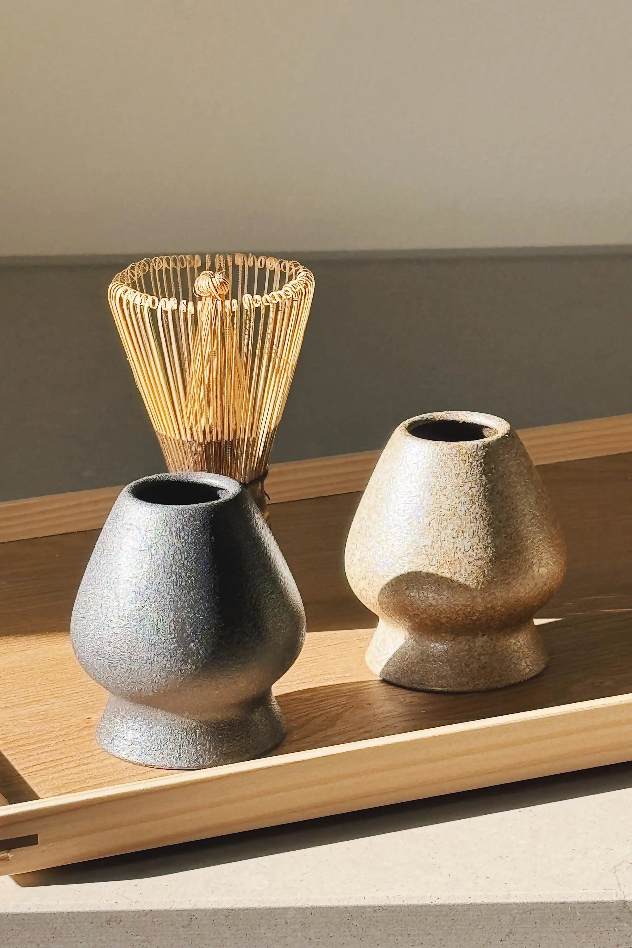 This elegant matcha holder is available in a beautiful matte black or grey/brown glaze that highlights its simple, minimalist aesthetic. Its functional shape ensures your matcha whisk is stored safely, while the refined color adds a calm and harmonious feel to your matcha set.