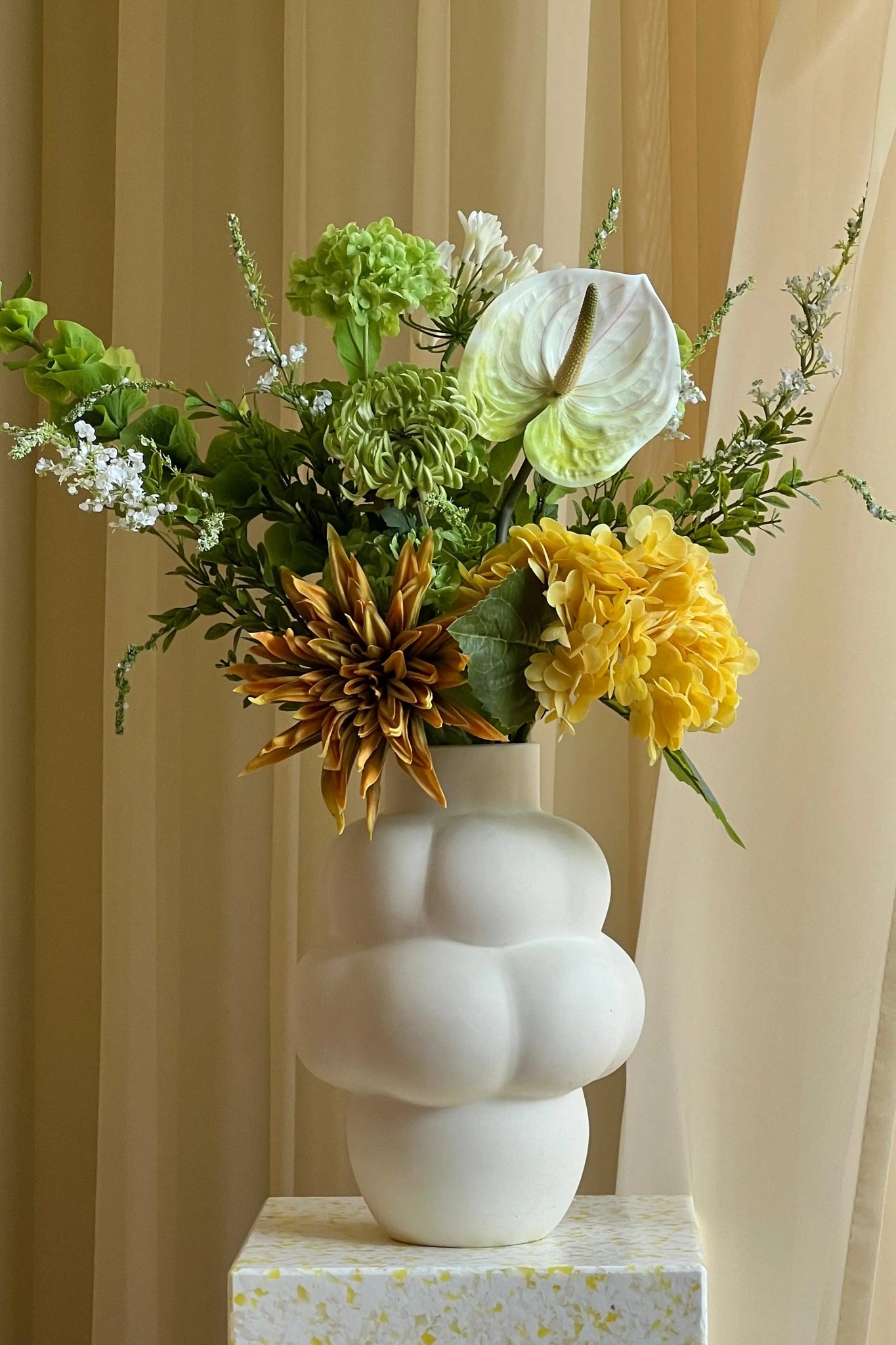 Our 'Summer Meadow Bliss' is created with lifelike artificial flowers that can be customized as needed. Shape the stems as desired to add your personal style and create the perfect arrangement. Because the stems can be bent, they also fit vases of several sizes. Let this bouquet be a beautiful addition to your home and bring the joy of summer into your life all year round.