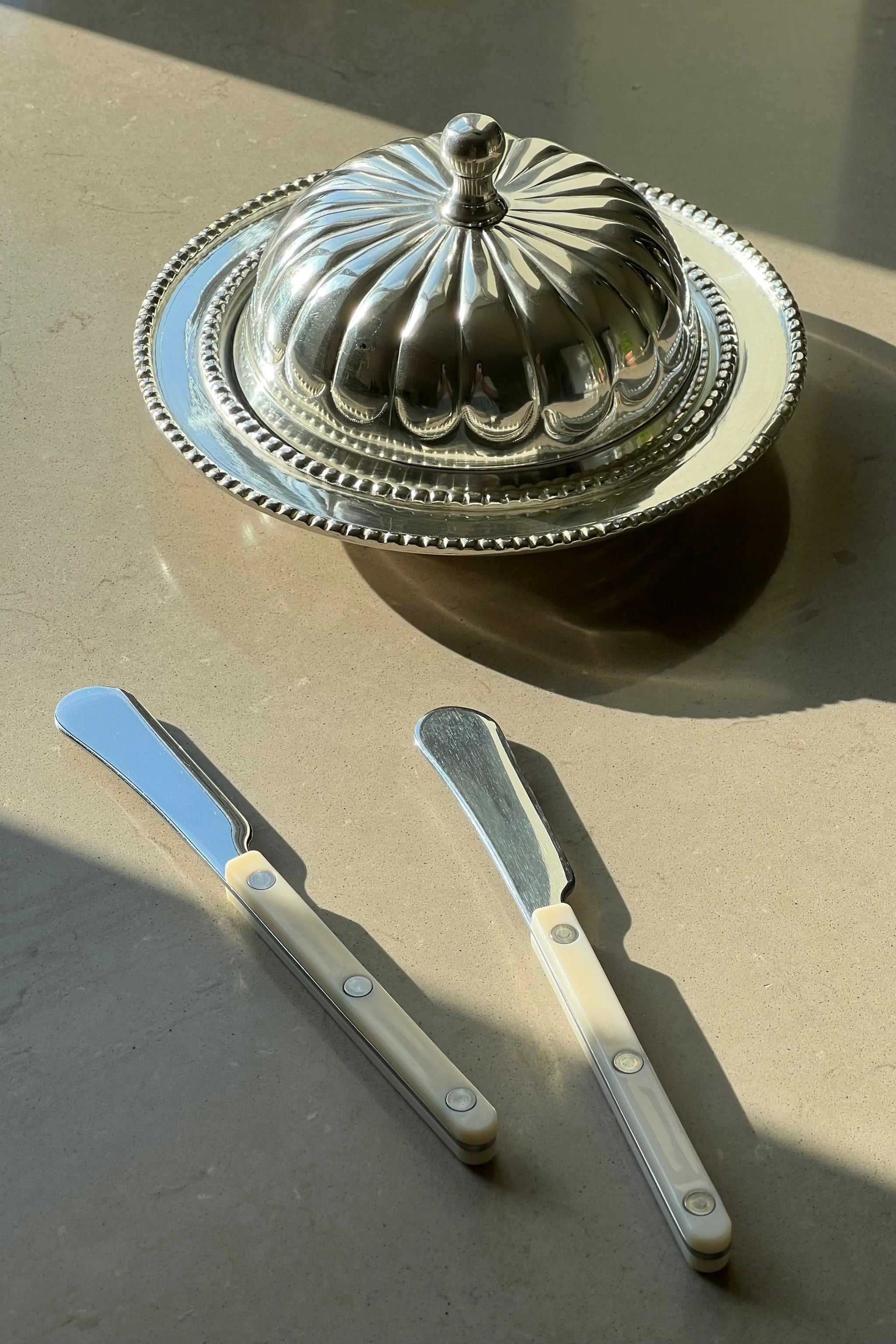 Antique-inspired butter bowl with lid in silver-plated steel