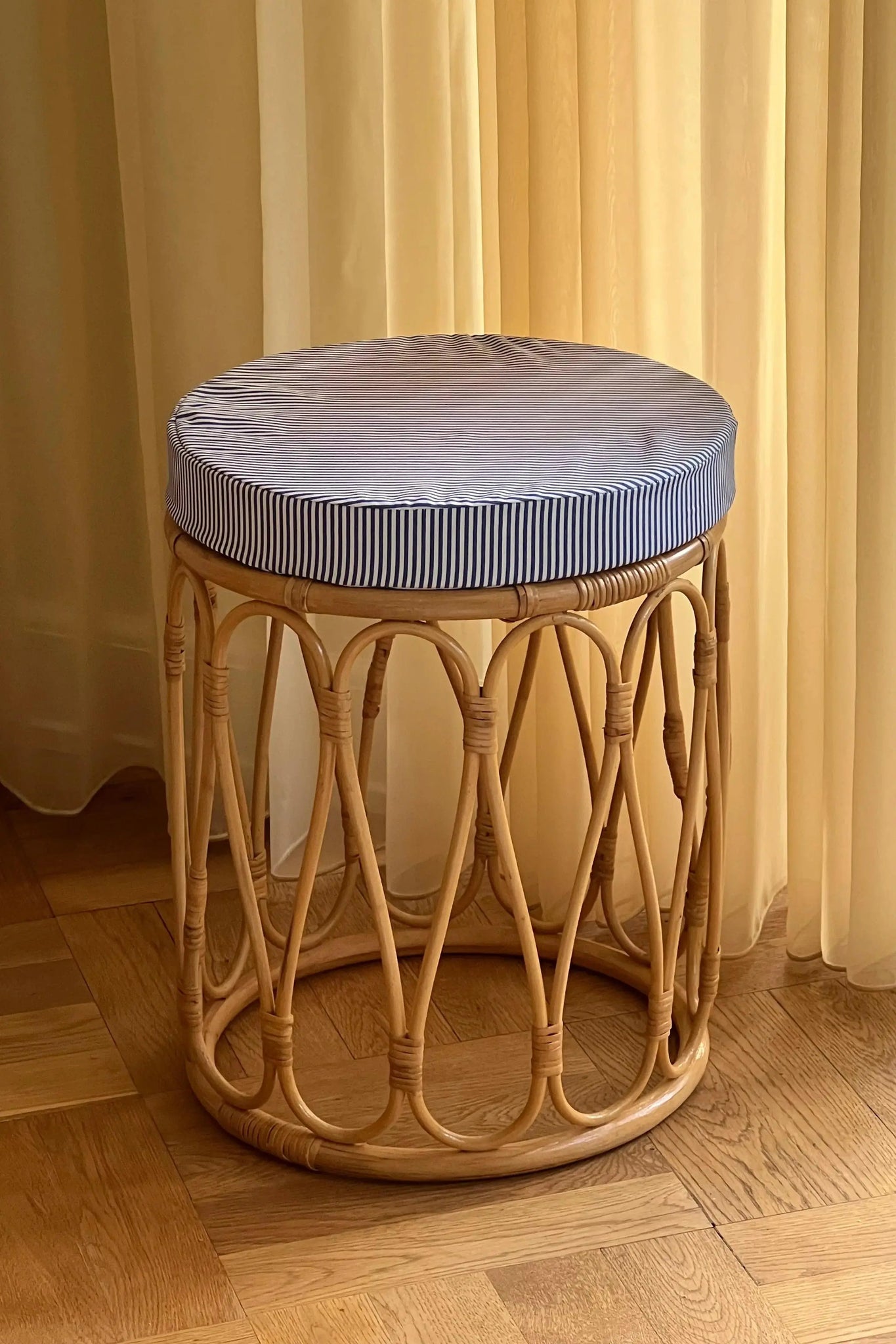 Handmade stool in rattan with cushion in blue/white striped fabric
