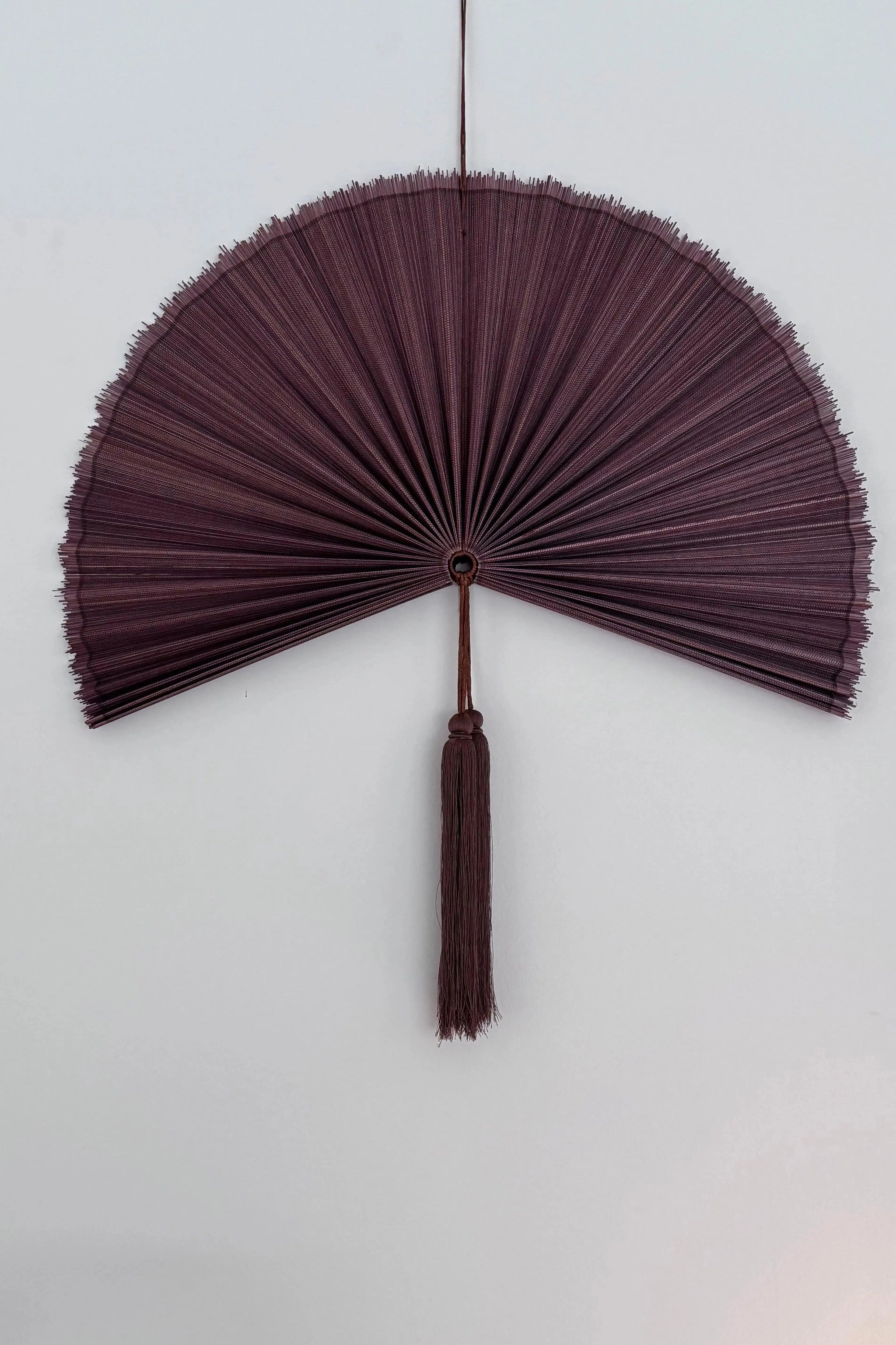 Unique handmade bamboo fan from Vietnam in a deep, dark chocolate brown with natural bamboo markings. The fan comes with a practical hanging loop, making it easy to display on your wall.