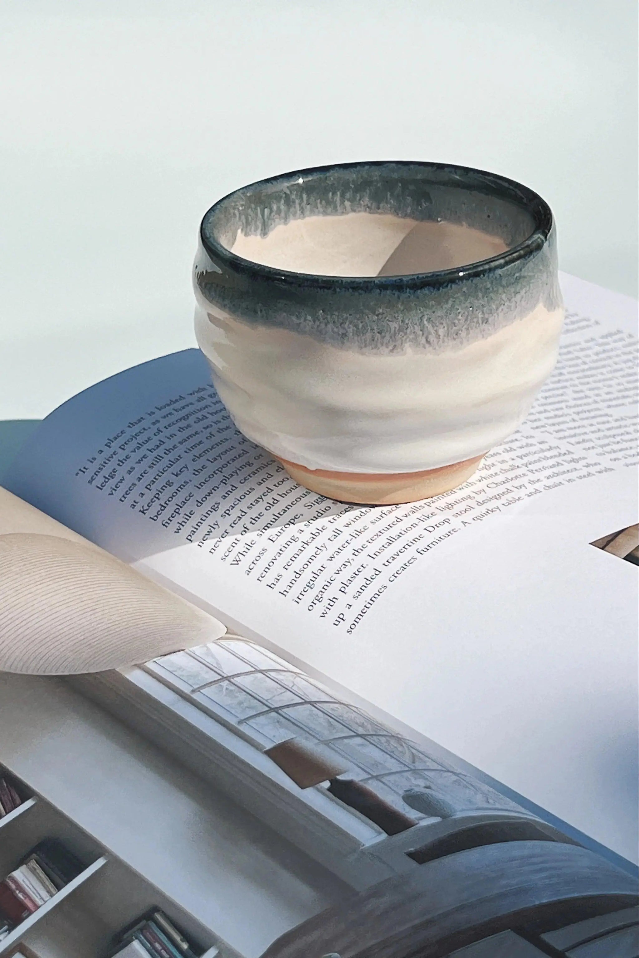 White and blue/grey mug from Japan in a beautiful shape. The mug is a good size for tea and coffee, and is really nice to hold.