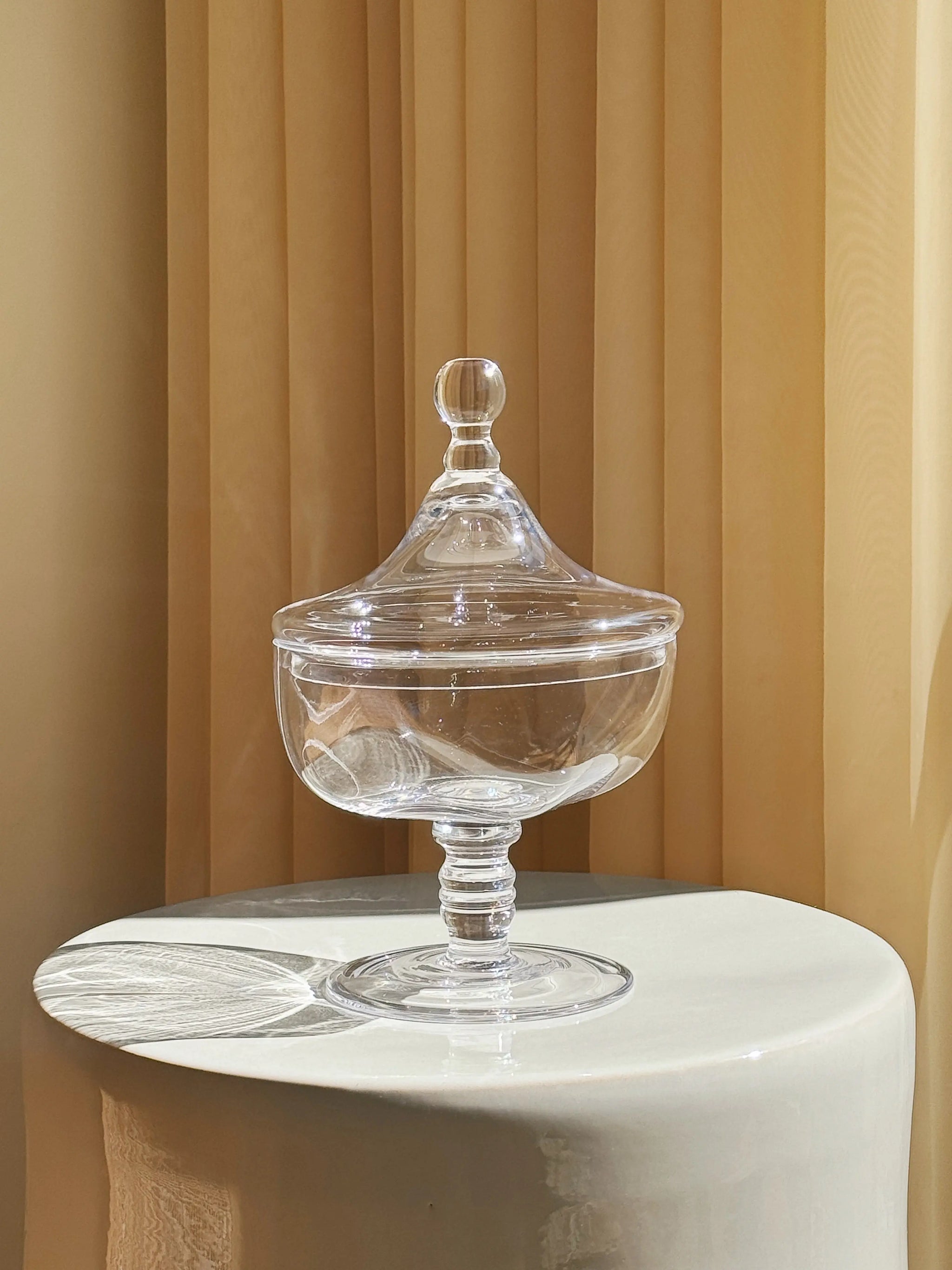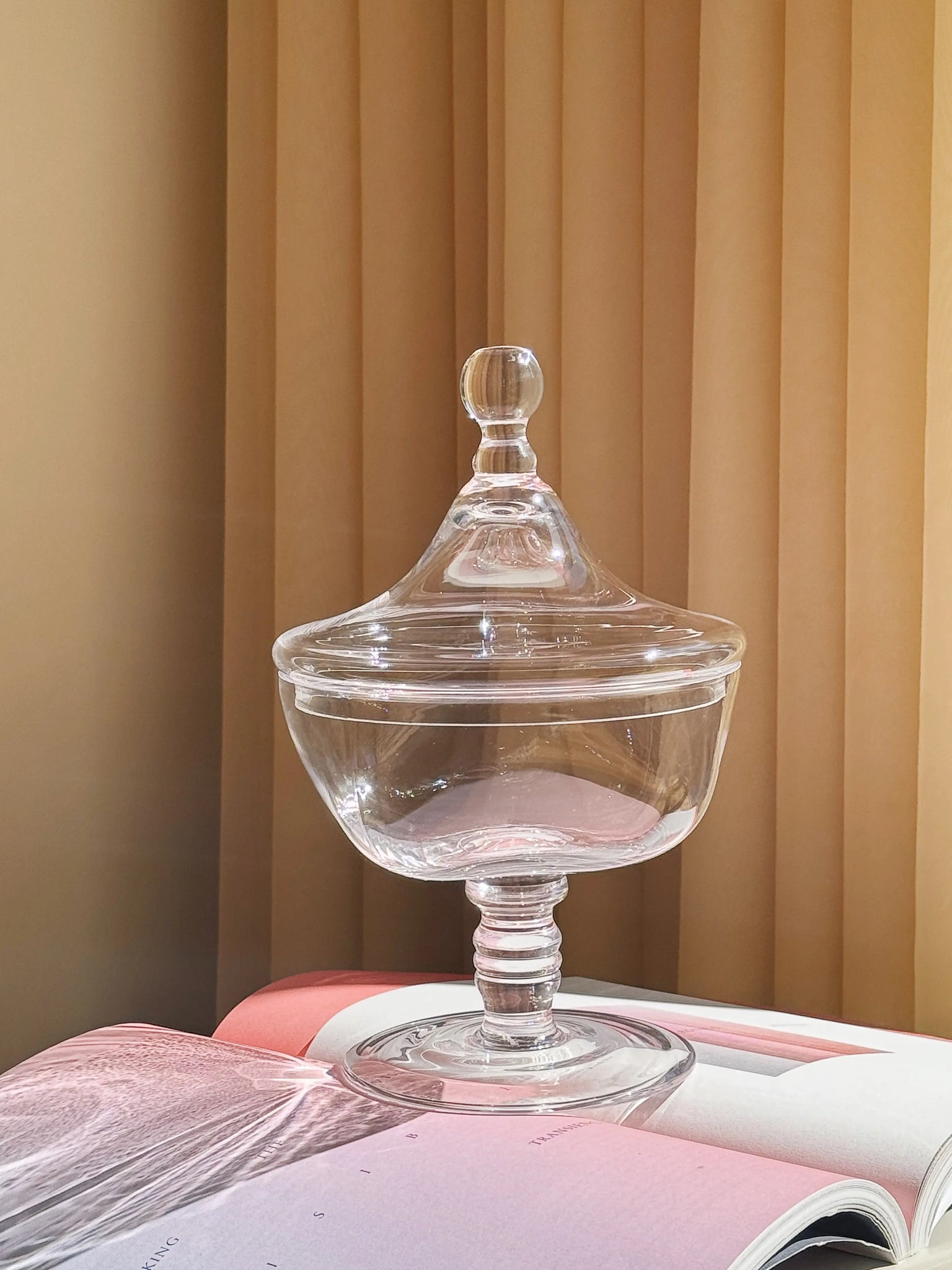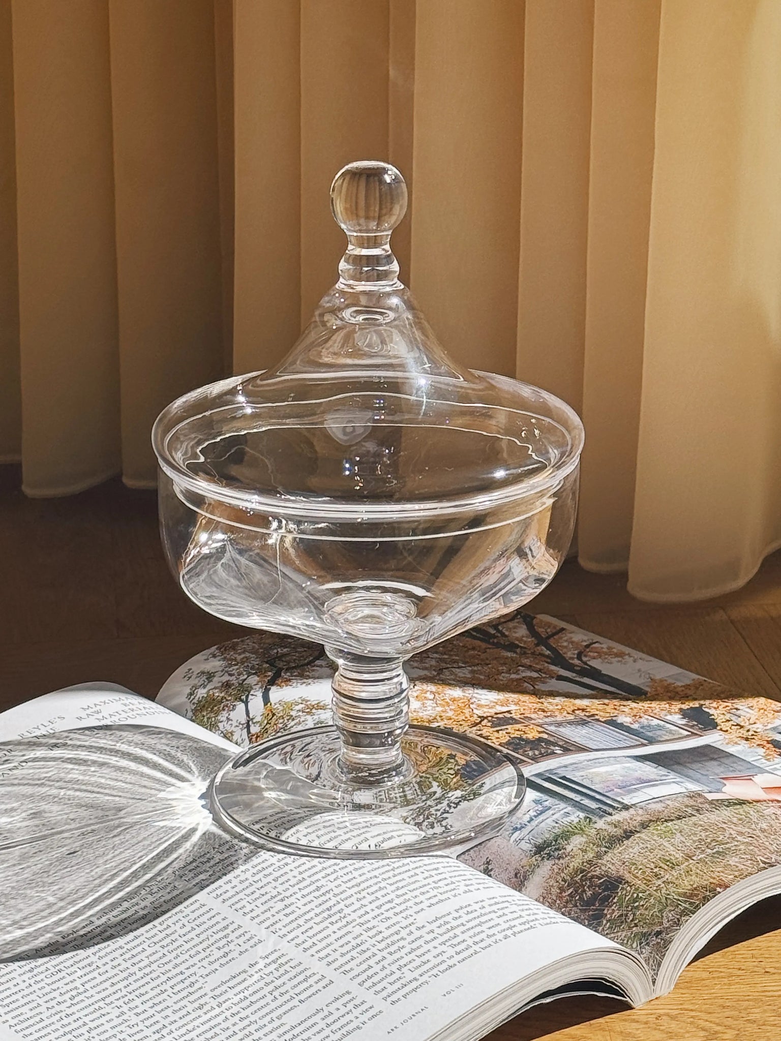 Made of transparent glass and resting on a distinctive rectangular base, the piece combines modern minimalism with timeless elegance. It’s perfect for storing sweets, jewellery, or cherished keepsakes – or simply as a sculptural design object in your home.