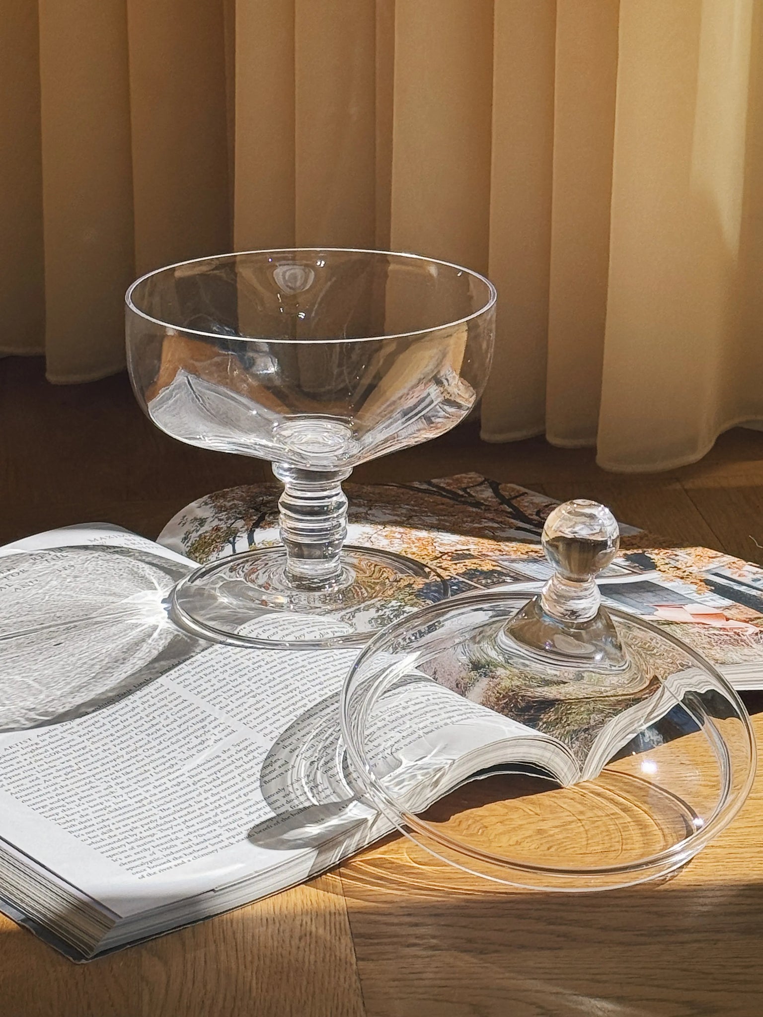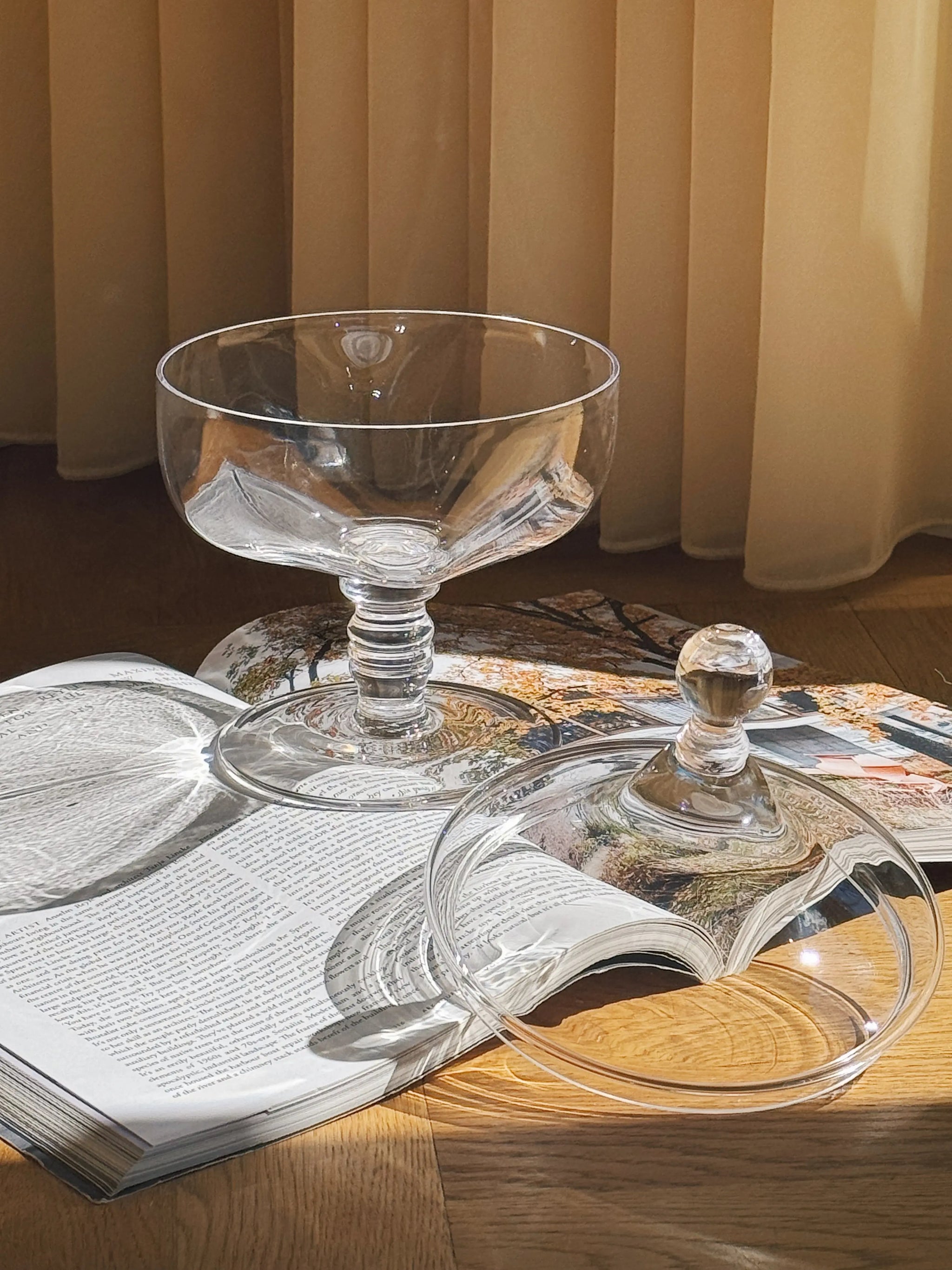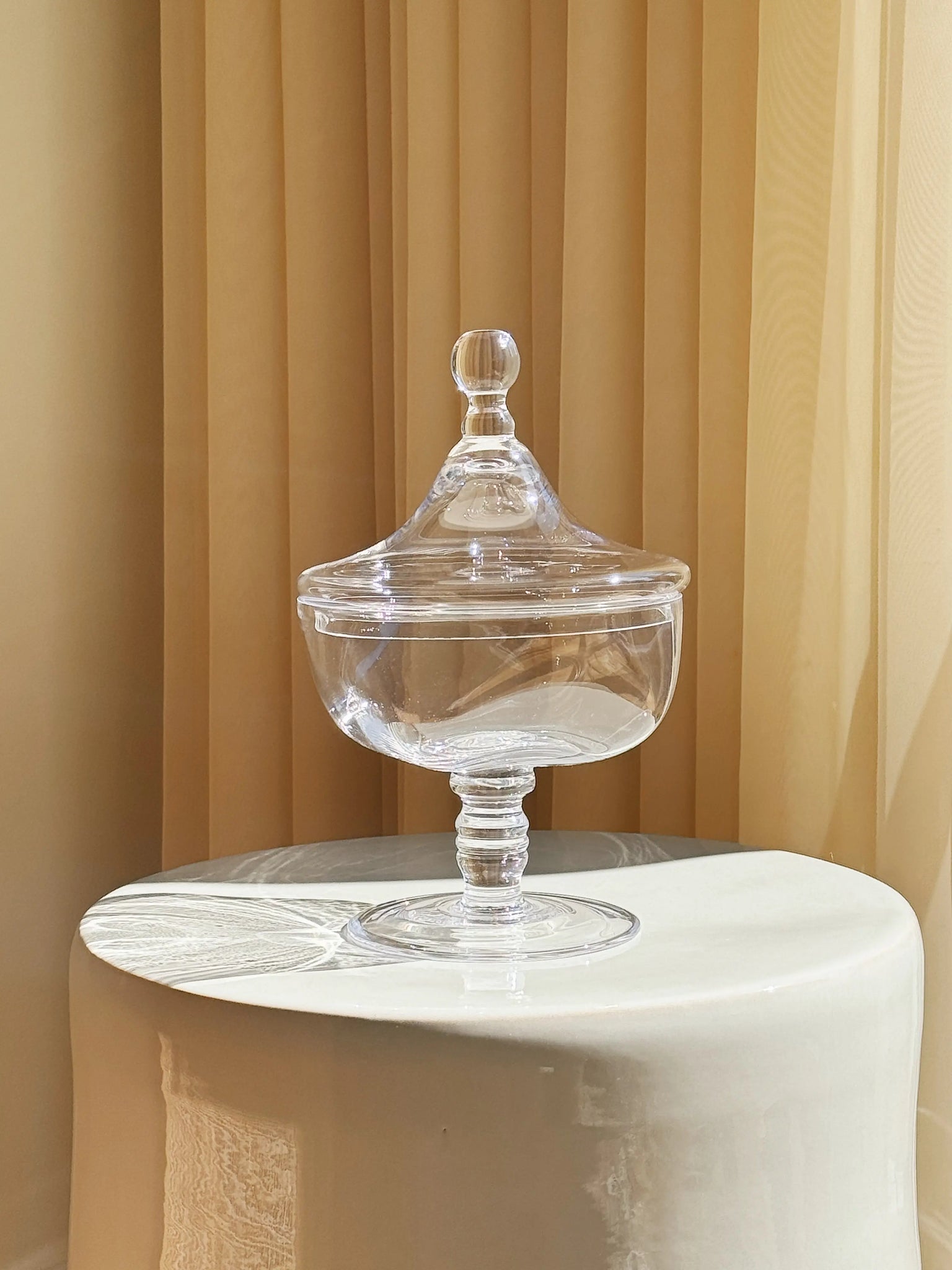 Made of transparent glass and resting on a distinctive rectangular base, the piece combines modern minimalism with timeless elegance. It’s perfect for storing sweets, jewellery, or cherished keepsakes – or simply as a sculptural design object in your home.