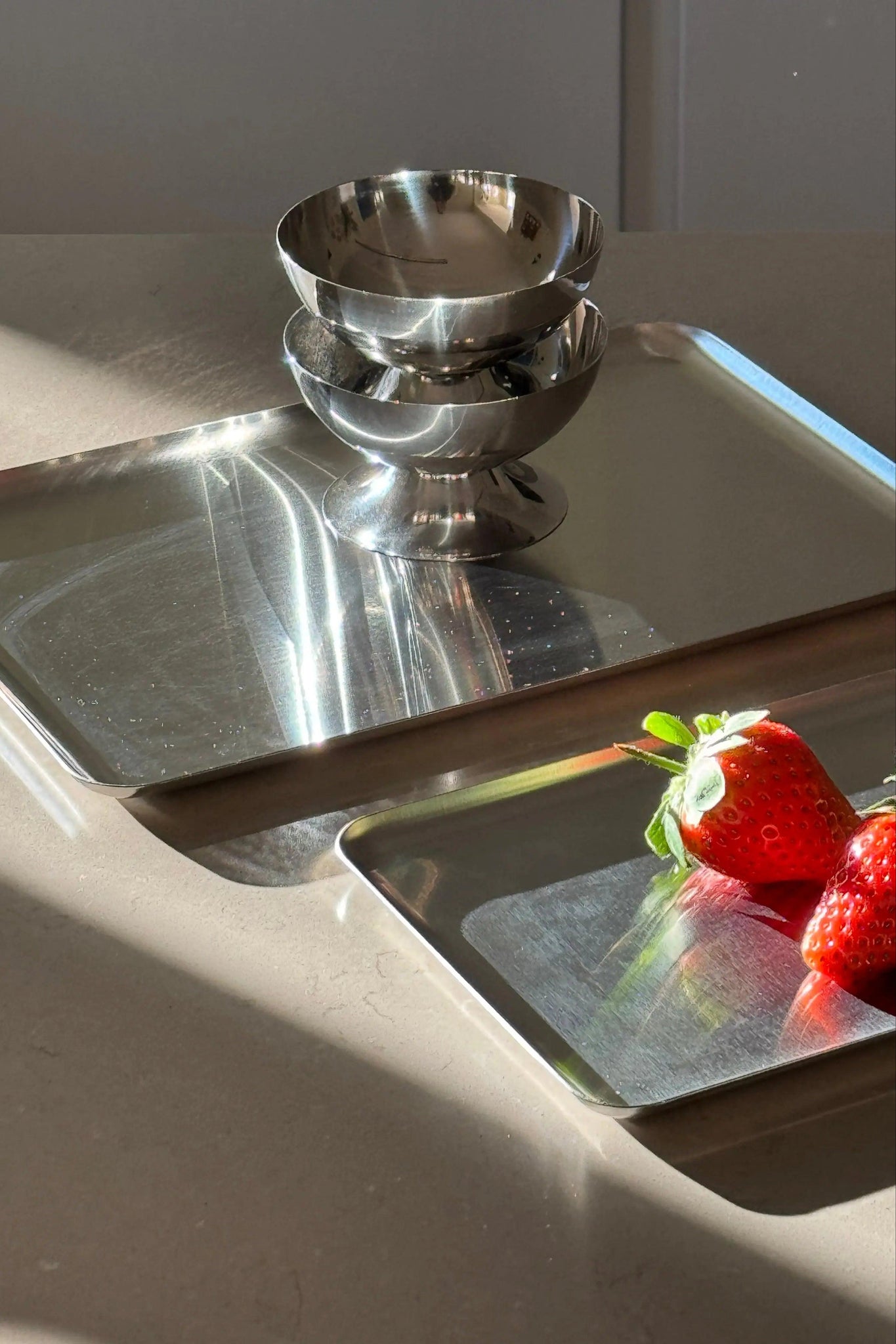 The smooth and shiny surface of the plate beautifully reflects light, highlighting its simple and timeless design. The stainless steel makes the plate both durable and practical, suitable for everyday use and special occasions. Also available in a smaller version (20 x 15.5 x 1 cm) and a larger version (40.5 x 30.5 x 1 cm), which perfectly complements this medium-sized version.