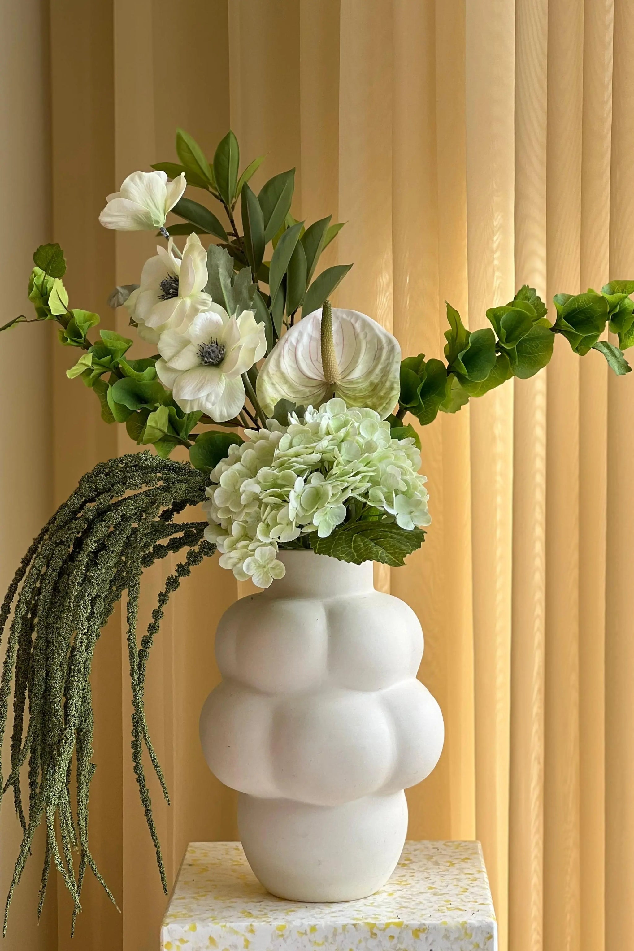 Invite the freshness of spring into your home with our Spring-fresh White Lotus Bouquet in white and light green shades. This enchanting bouquet combines a beautiful mix of artificial flowers including pale green hydrangea, white anemone flowers, green amaranth and white anthurium lilies. Each element is carefully selected to create a harmonious and inviting bouquet that will bring spring joy to any room.