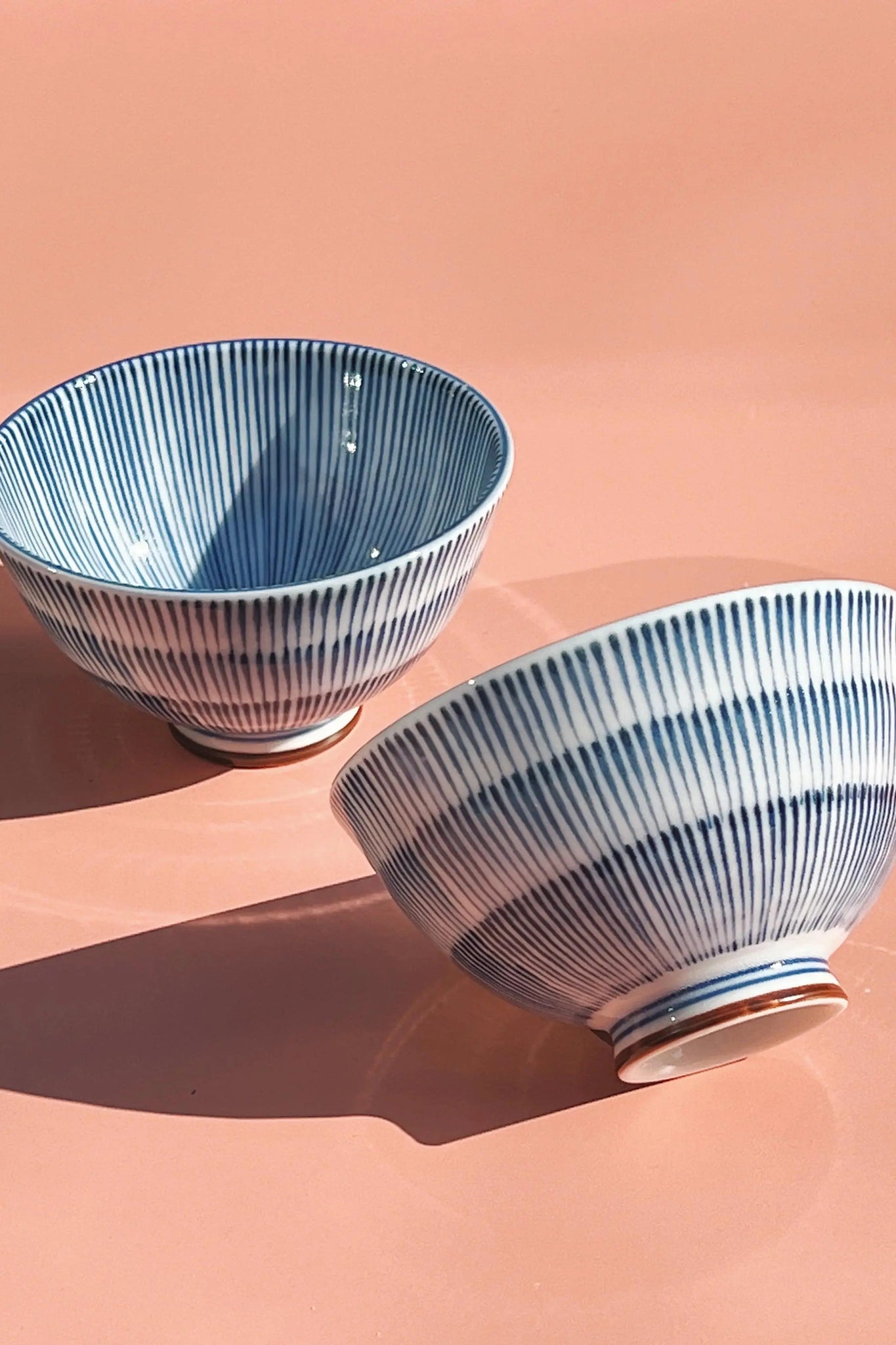 Beautiful Japanese bowl with narrow blue/white stripes. The bowl is perfect for rice, snacks, and small dishes.