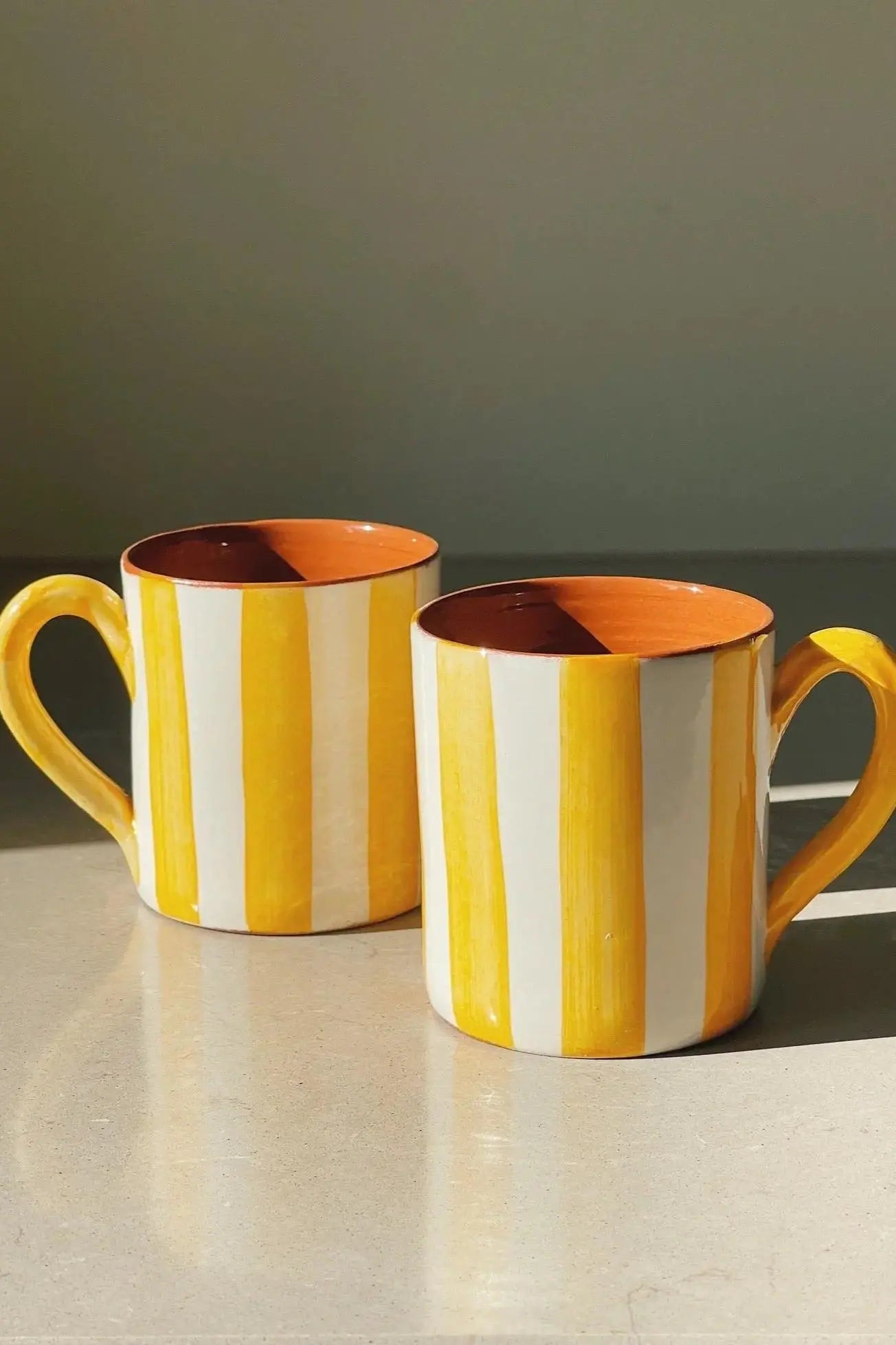 Unique, hand-turned and hand-painted mug with white and yellow stripes from Portuguese Casa Cubista. The mug also comes with white and green stripes and with white and blue stripes . The mug is the perfect size for hot drinks - such as coffee, tea and cocoa.