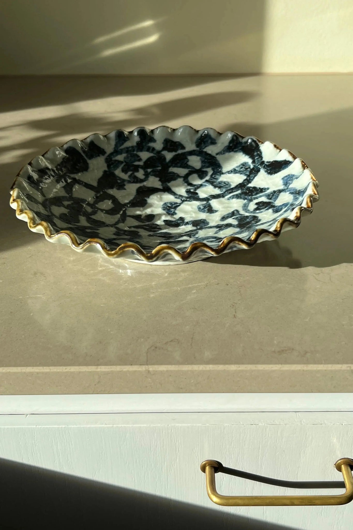 Unique, hand-painted dish in ceramic from Japan. The dish is white with a dark blue pattern and a brown edge, and it has a ruffled edge. The pattern depicts small leaves. This Japanese dish is the perfect size for fruit, vegetables, small appetizers, and similar items, and it also looks beautiful as a decorative piece.