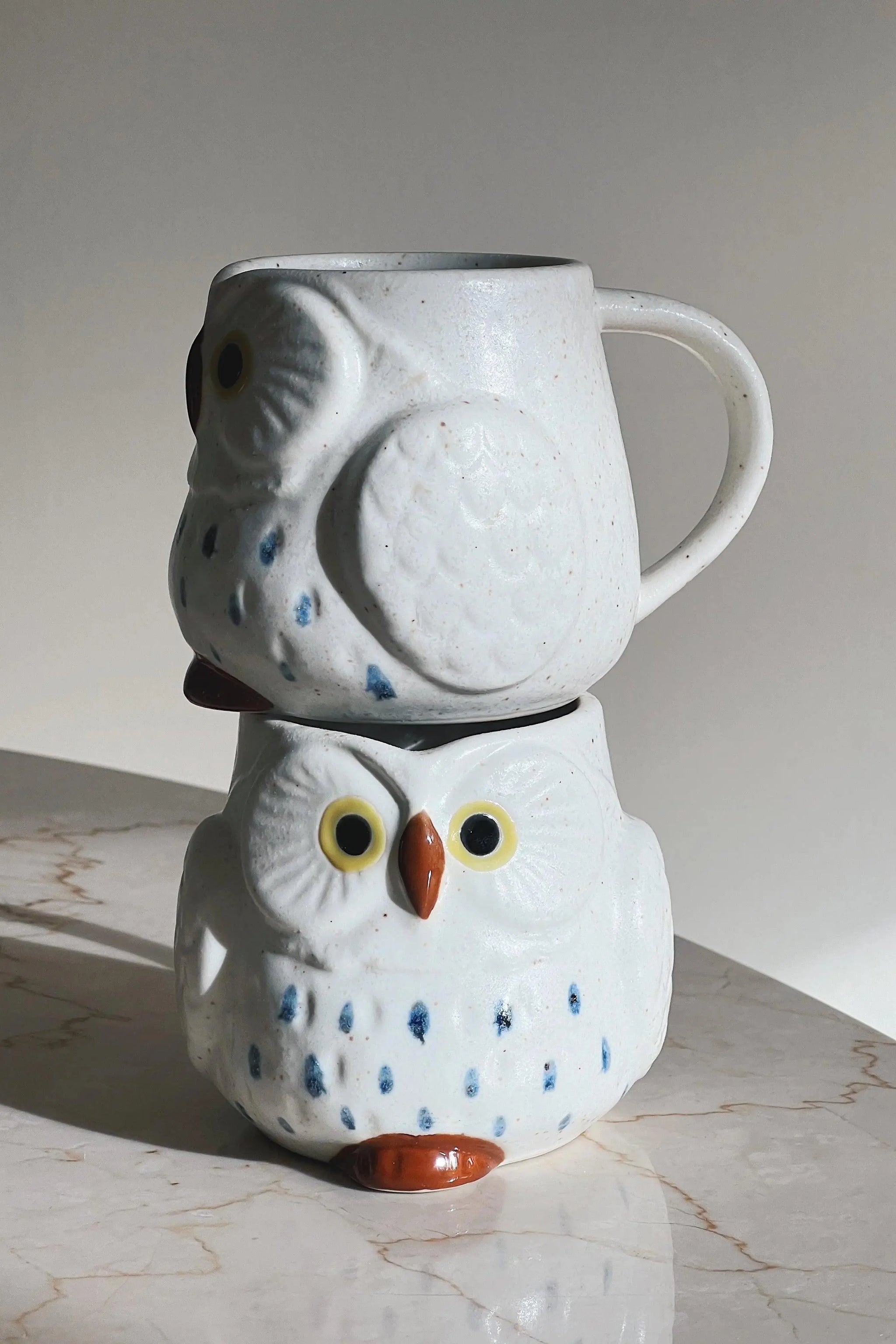 Unique, hand-painted owl mug in white ceramic with handle from Japan. The mug is the perfect size for a good cup of coffee, tea, cocoa, etc., just like the owl mug is incredibly cute to use as a decoration or to store pens and pencils in the children's room or the office. The mug also comes without a handle .
