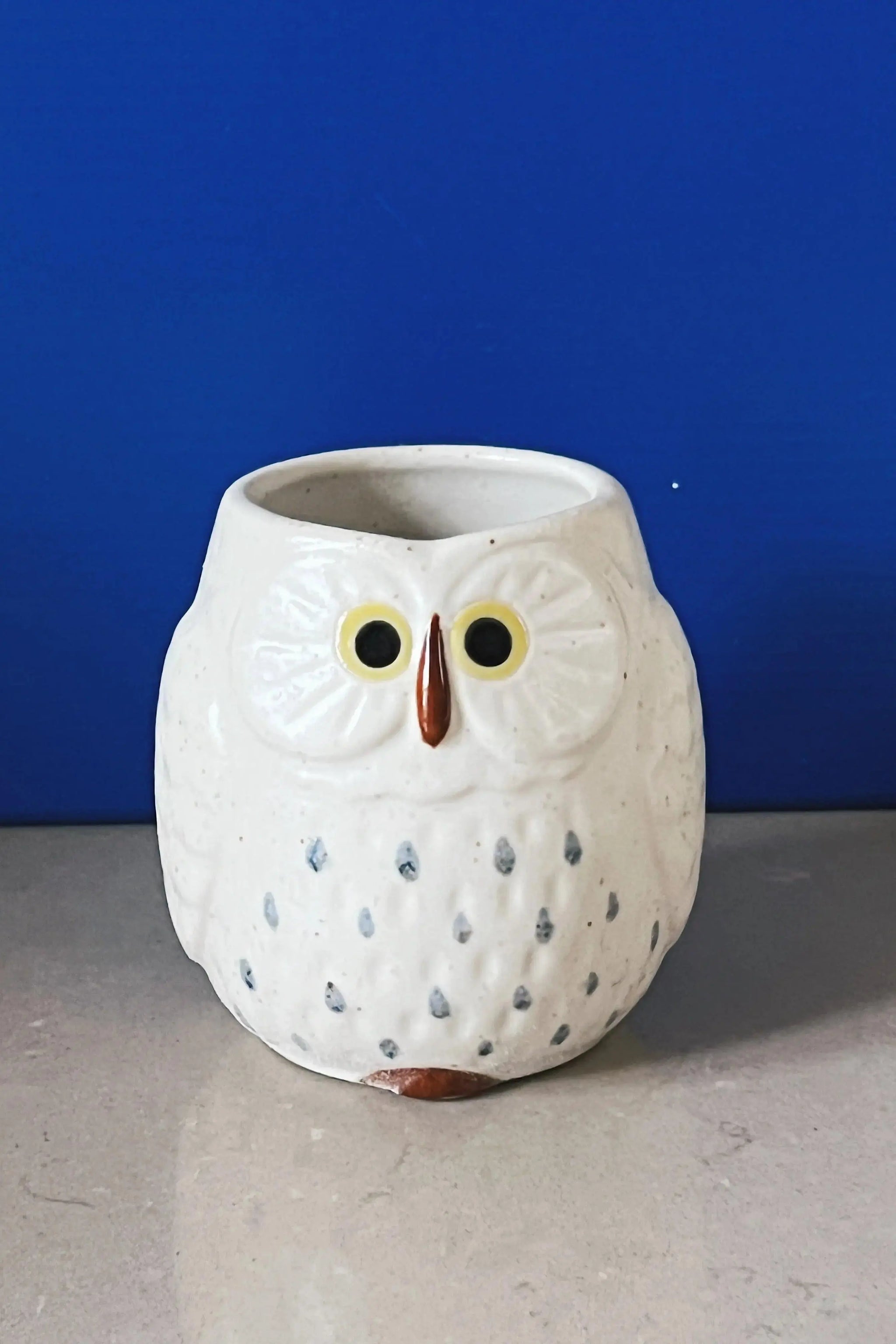 Unique, hand-painted owl mug in white ceramic without handle from Japan. The mug is the perfect size for a good cup of coffee, tea, cocoa etc., just like the owl mug is incredibly cute to use as a decorative object or to store pens and pencils in the children's room or the office. The mug also comes without a handle.