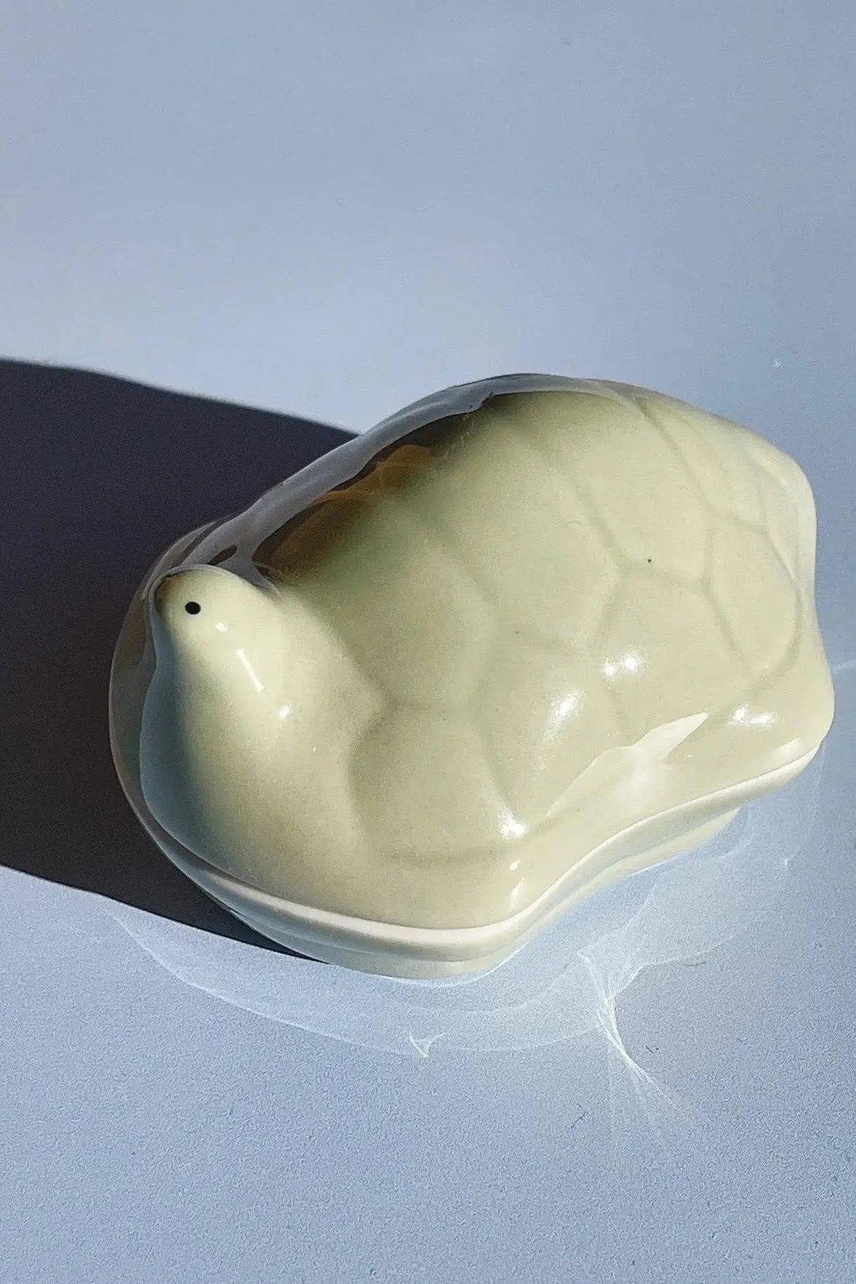 Decorative and functional lidded jar from Japan shaped like a turtle in the finest, pastel green colour.