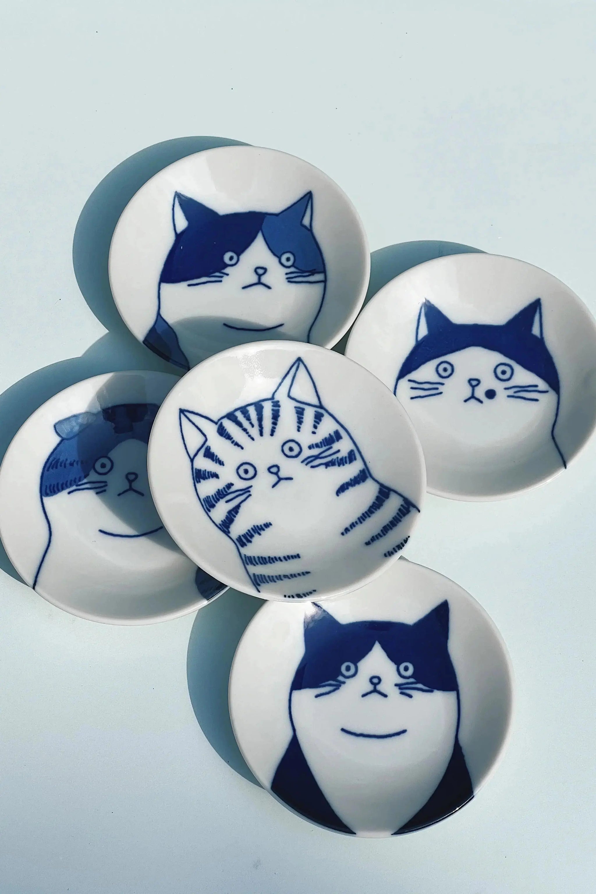 Japanese plate with blue cat | Set of 5 different ones in gift box | 9 cm