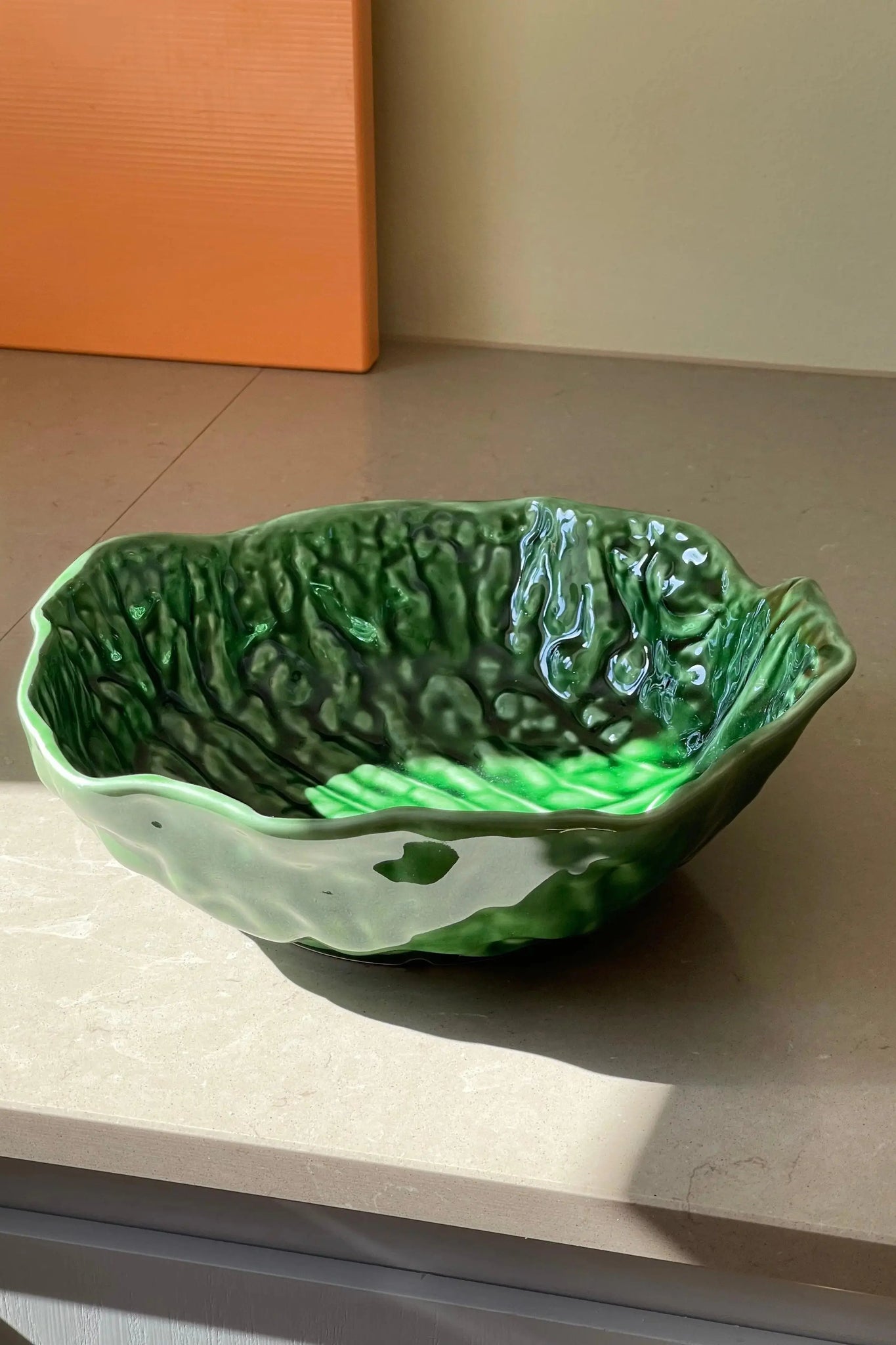 Beautiful, Portuguese hand-painted bowl shaped like a salad leaf in a lovely green hue. Perfect for serving vegetables, salads, and other side dishes. The bowl is also available in a larger size and as a platter.