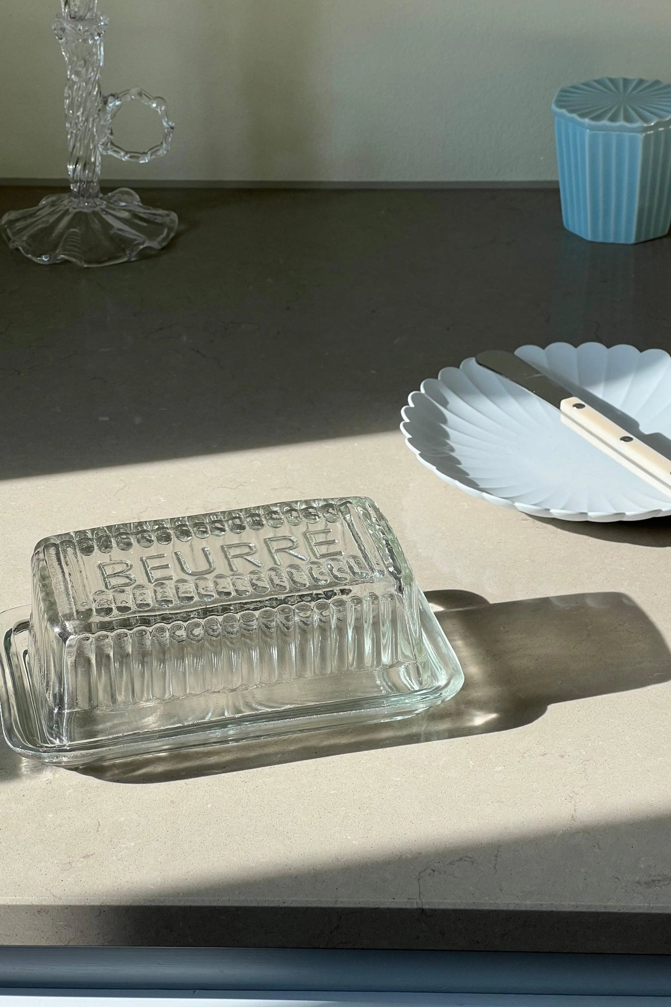 Indulge yourself with our fluted glass butter box with lid. This beautiful butter box adds a touch of charm to your servings of butter and creates an atmosphere of luxury and elegance at the dining table. Made from durable glass and with an integrated lid to keep the butter fresh and protected. On the top of the lid is written "Beurre", which adds an extra detail to the design. Perfect for a luxurious breakfast or as a decorative item in your home. The butter box can also be used for things other than butter, e.g. cakes or the like.