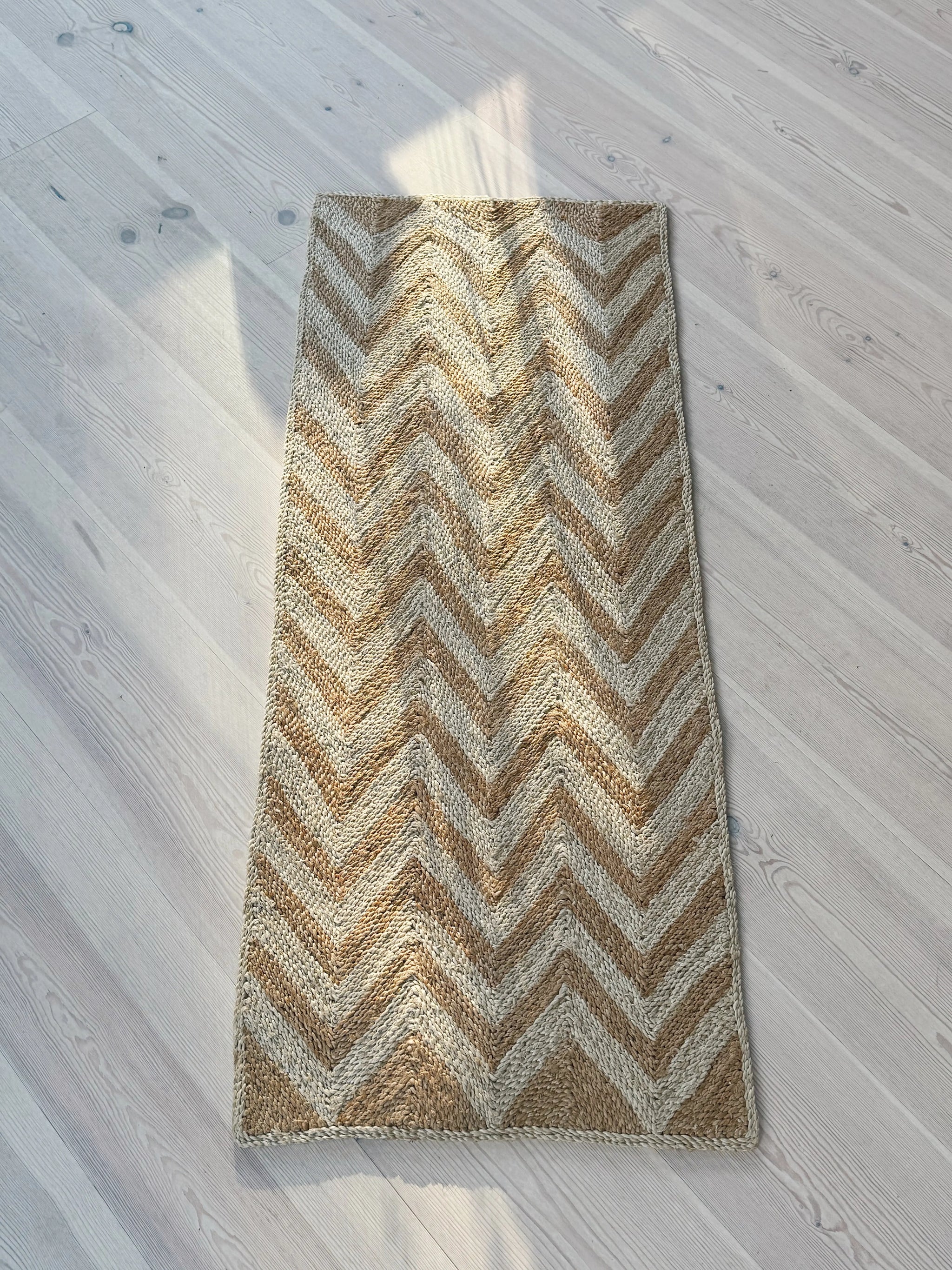 Unique, handwoven rug/mat in jute with a beautiful chevron pattern in brown and natural tones. The rug is perfect for placing in front of the door, in the hallway, entrance or even in the bedroom. The elegant zigzag rug is of high quality and comes in a practical size.