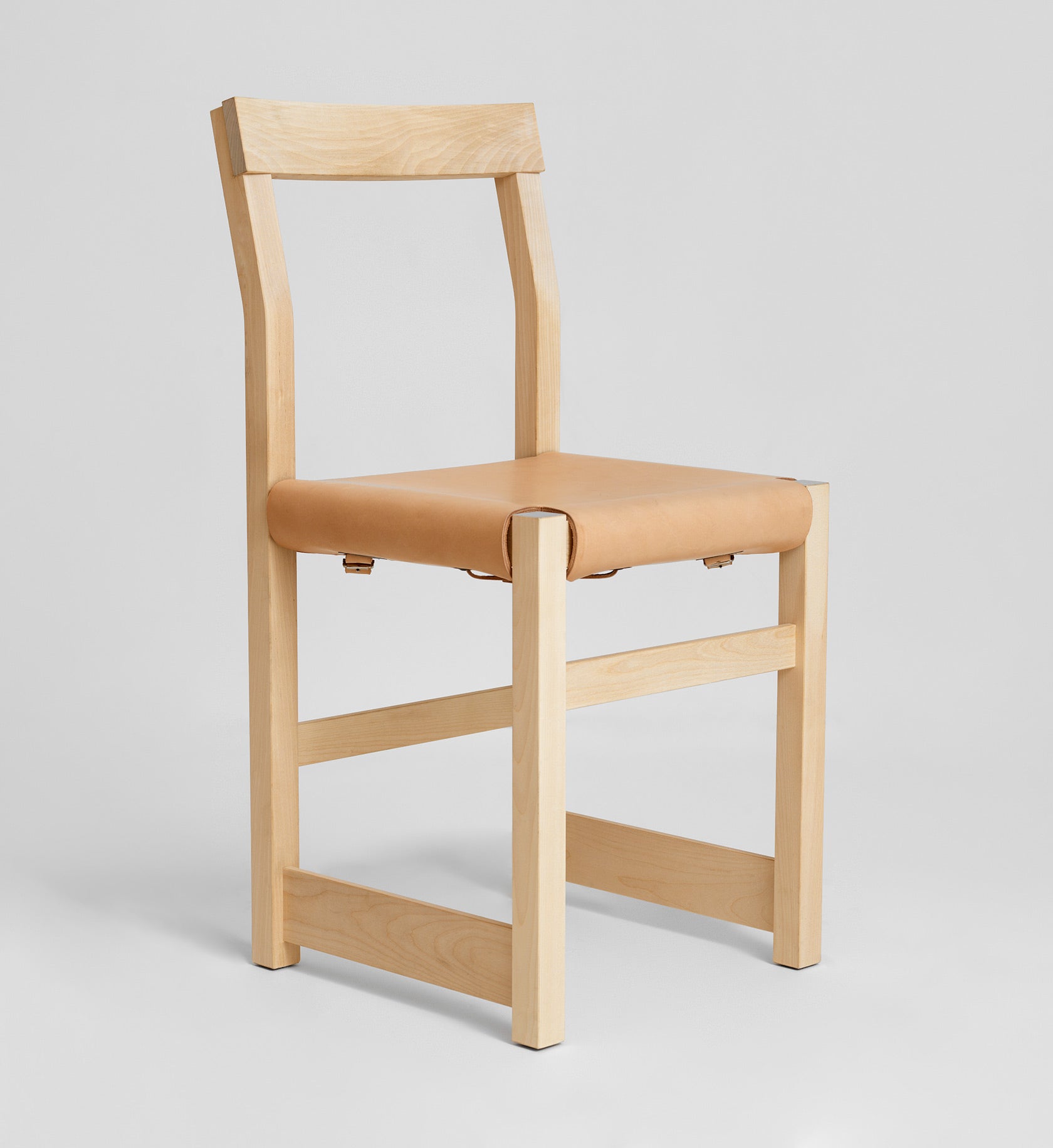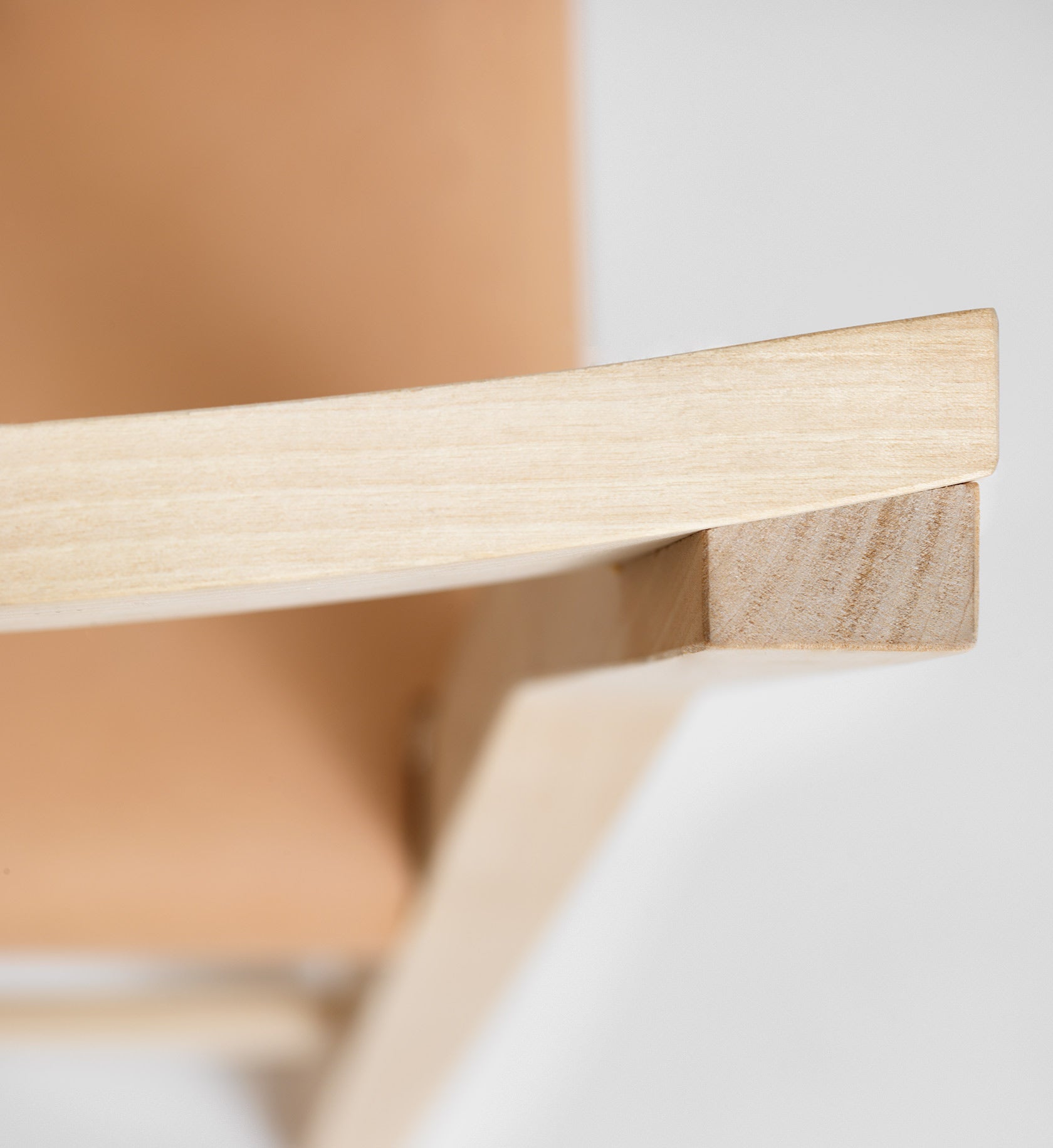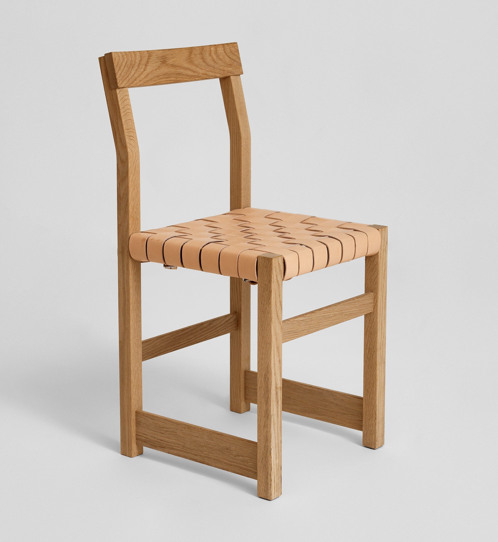 The chair is available with three different seat options: a seat in solid wood, a smooth leather seat or a braided leather seat – both made from vegetable-tanned Swedish leather. The leather seats are self-supporting, replaceable and can be gradually tightened over time, extending the chair’s lifespan and maintaining comfort.