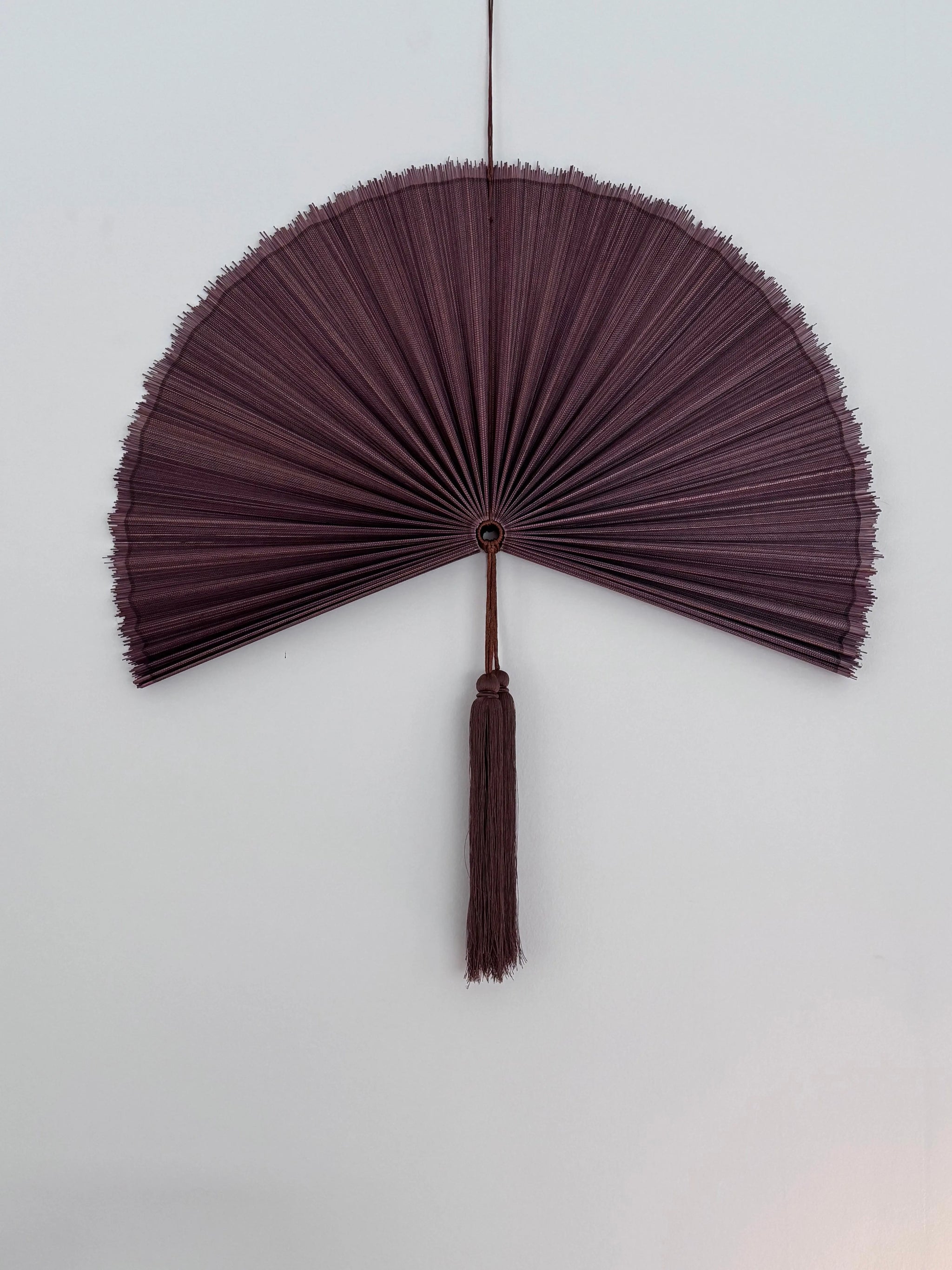 Unique handmade bamboo fan from Vietnam in a deep, dark chocolate brown with natural bamboo markings. The fan comes with a practical hanging loop, making it easy to display on your wall.