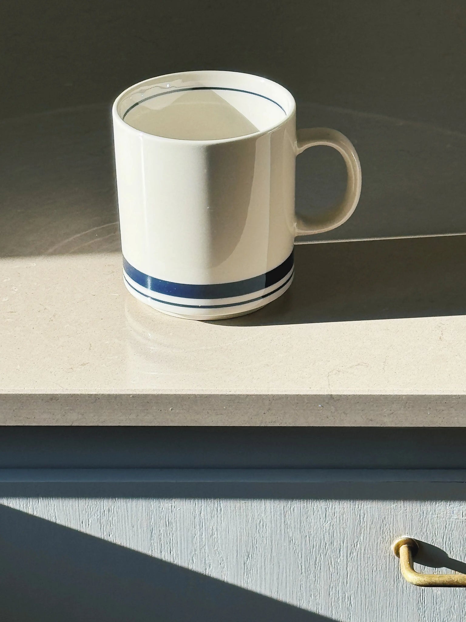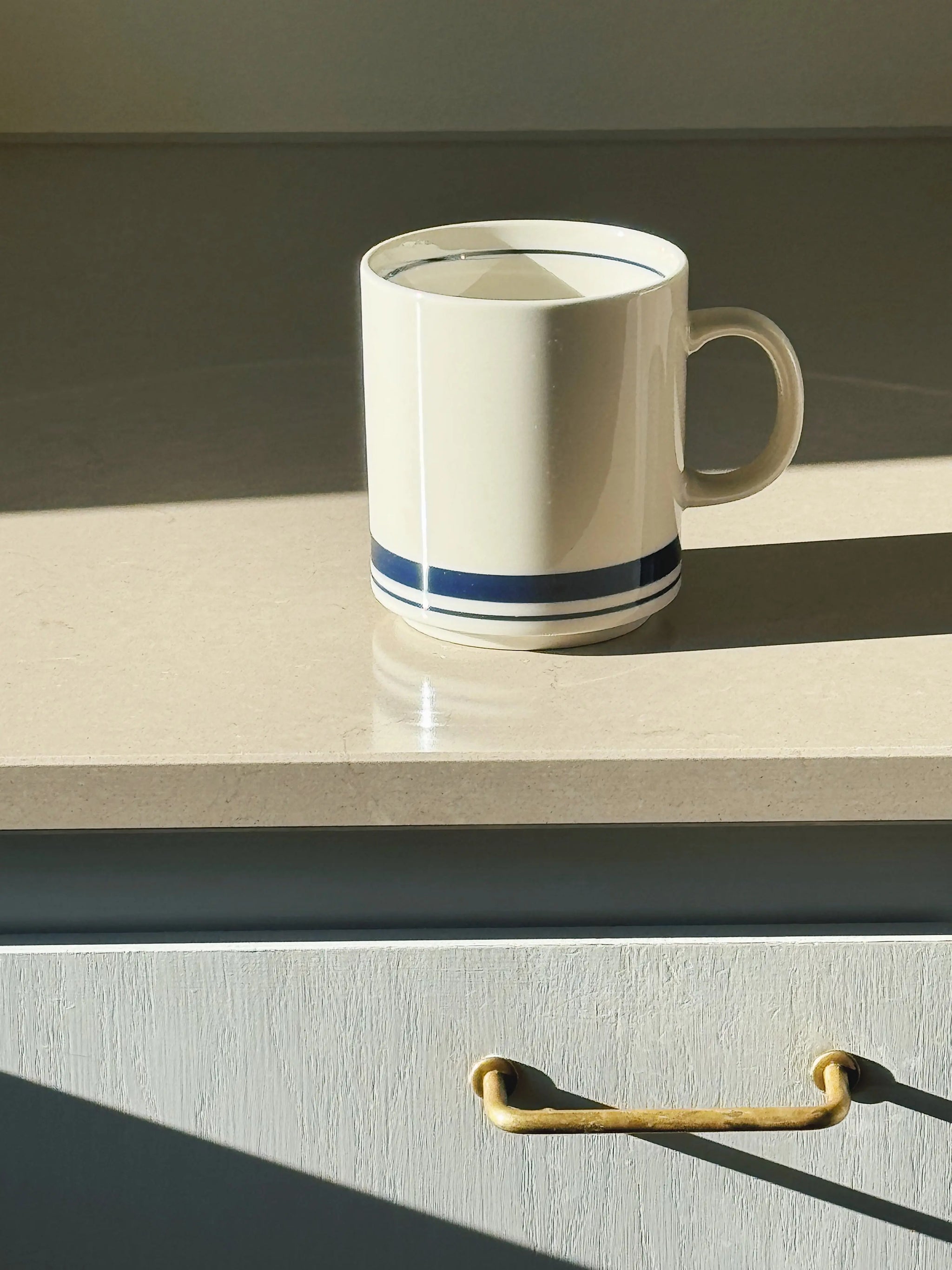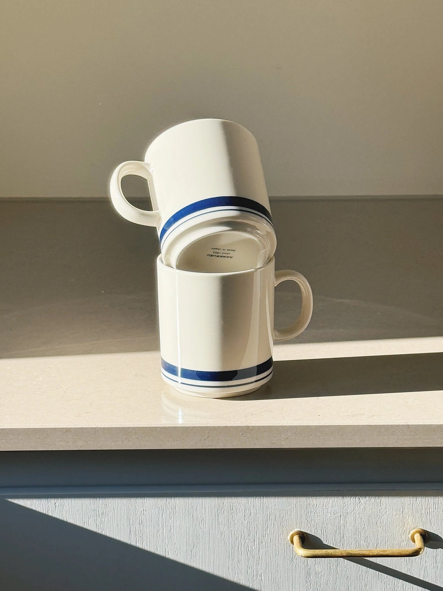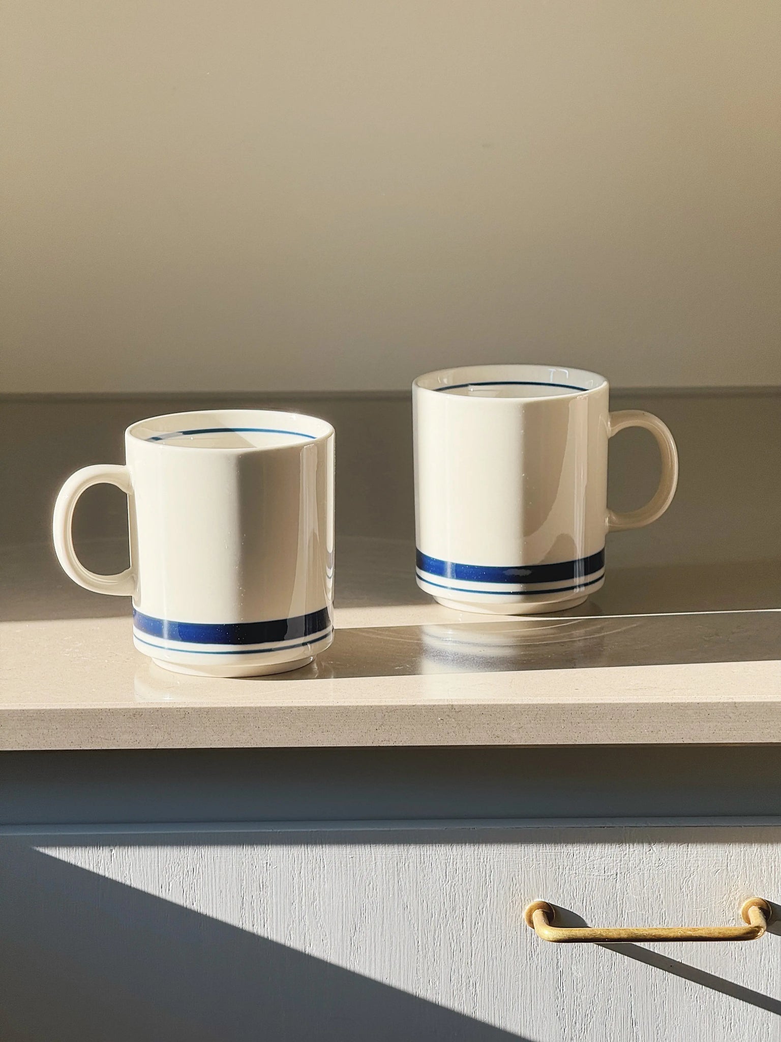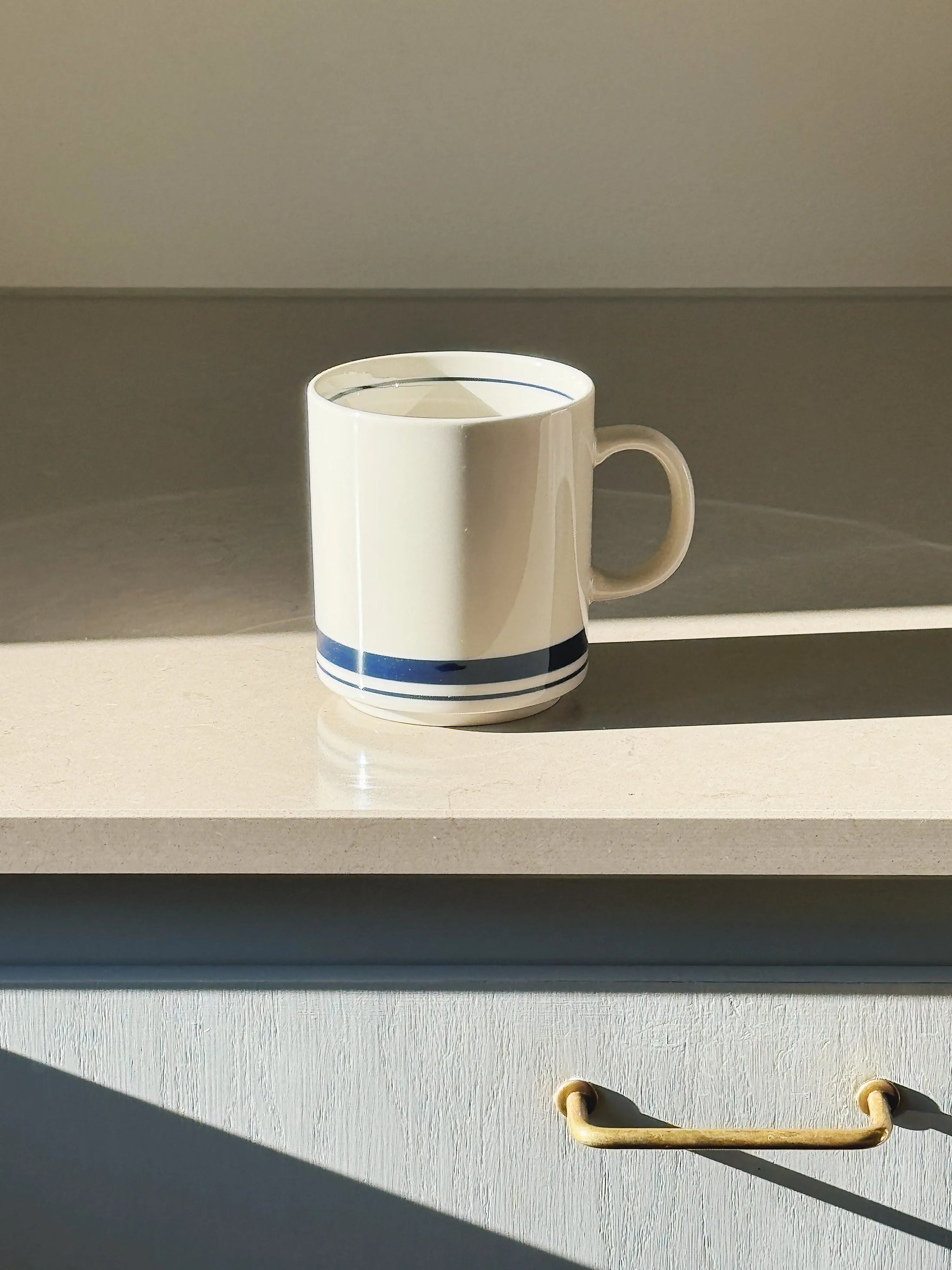 A clean and timeless Japanese ceramic mug with hand-painted blue stripes – part of the retro-inspired series that includes bowls, plates, and serving dishes. The mug fits comfortably in the hand and has a classic shape, making it ideal for enjoying coffee, tea, hot chocolate, or any warm beverage. Its simple and elegant design complements both modern and nostalgic kitchens.
