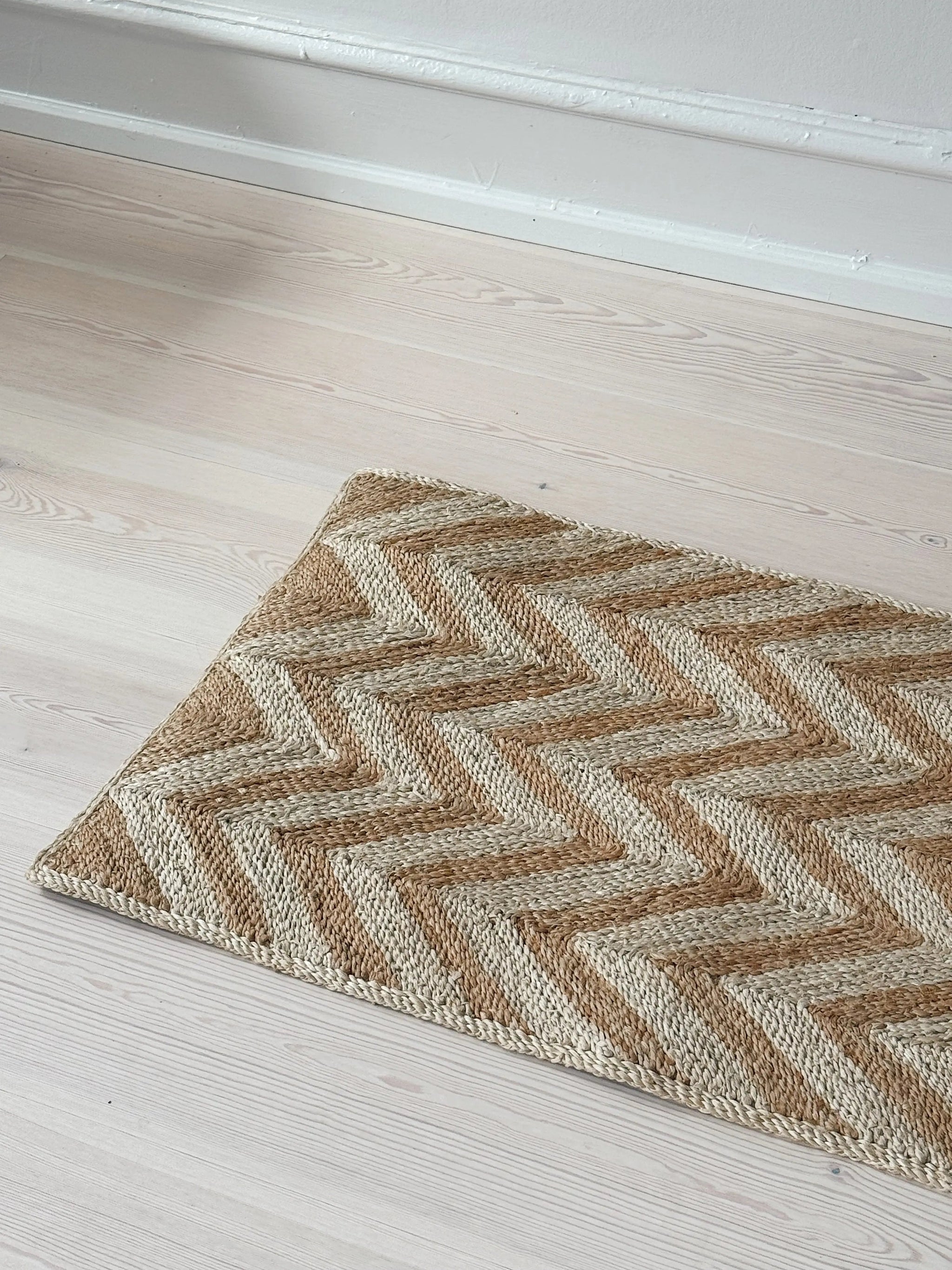 Unique, handwoven rug/mat in jute with a beautiful chevron pattern in brown and natural tones. The rug is perfect for placing in front of the door, in the hallway, entrance or even in the bedroom. The elegant zigzag rug is of high quality and comes in a practical size.