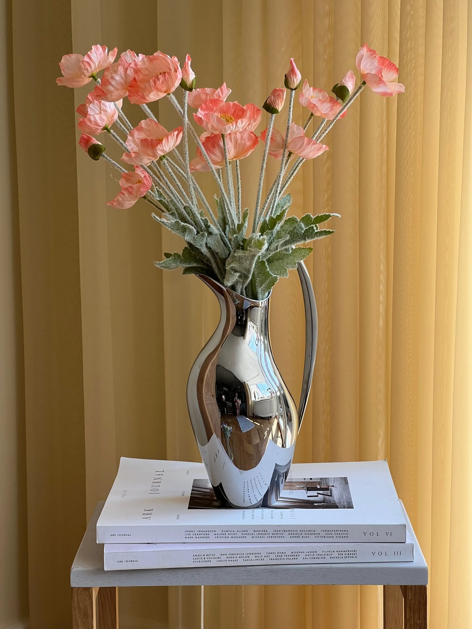 Experience the fine charm and radiant beauty of poppies with our artificial poppy bouquet in a delicate peach colour. The bouquet consists of 5 stems, each with 3 open flowers and 1 closed flower. It has been carefully designed to capture the subtle shades of light orange and pink, adding a touch of natural elegance to any room.