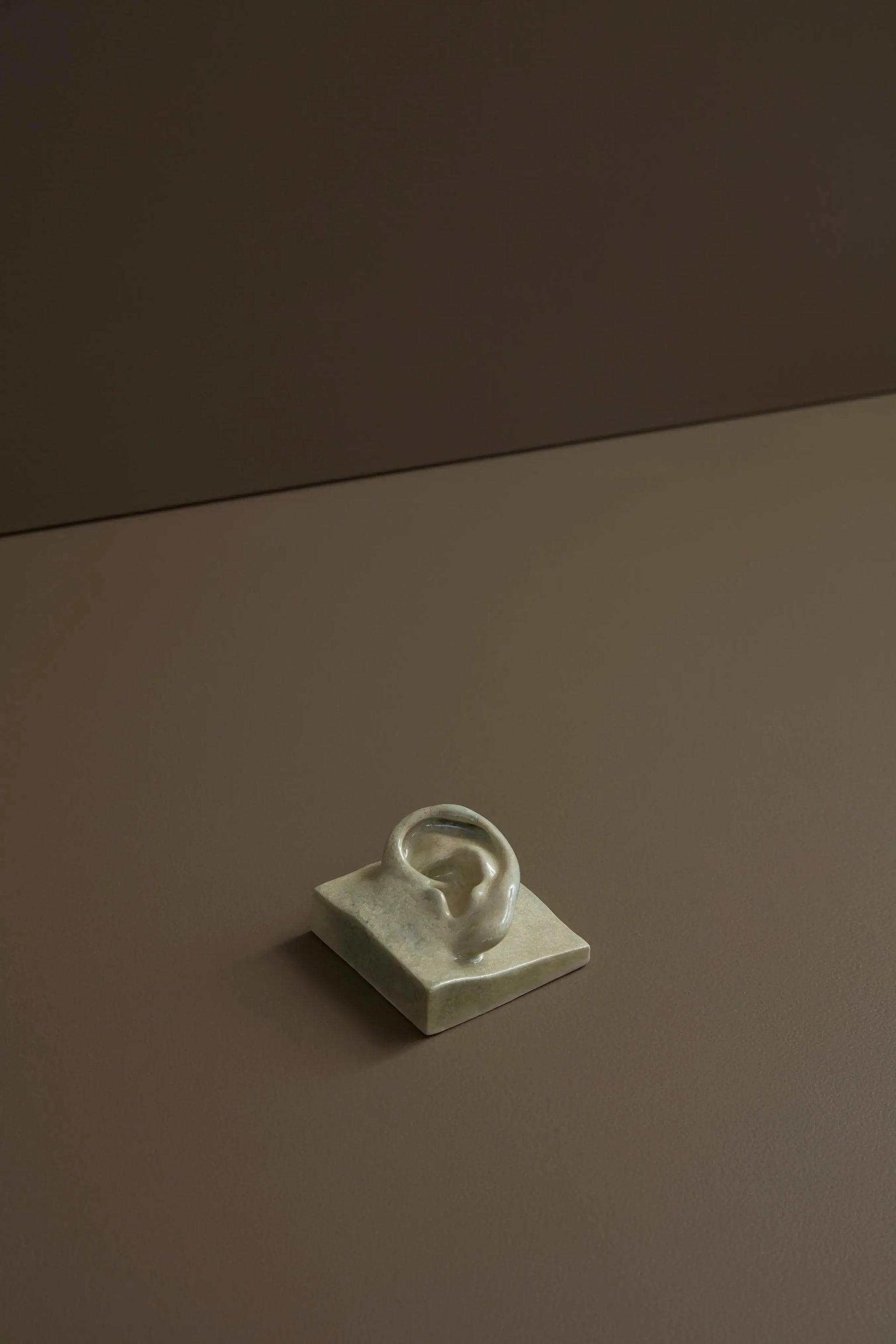 Fremstillet af glaseret hvid stentøjsler i farven CrystalGreen, er dette øre designet til at blive ophængt på væggen og fungerer lige så godt alene som det gør sammen med andre ansigtsfragmenter.
