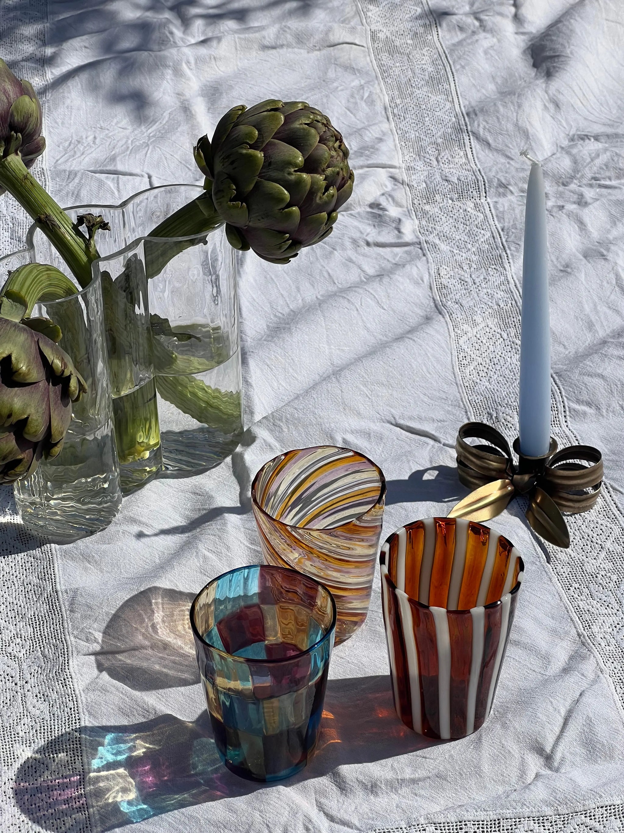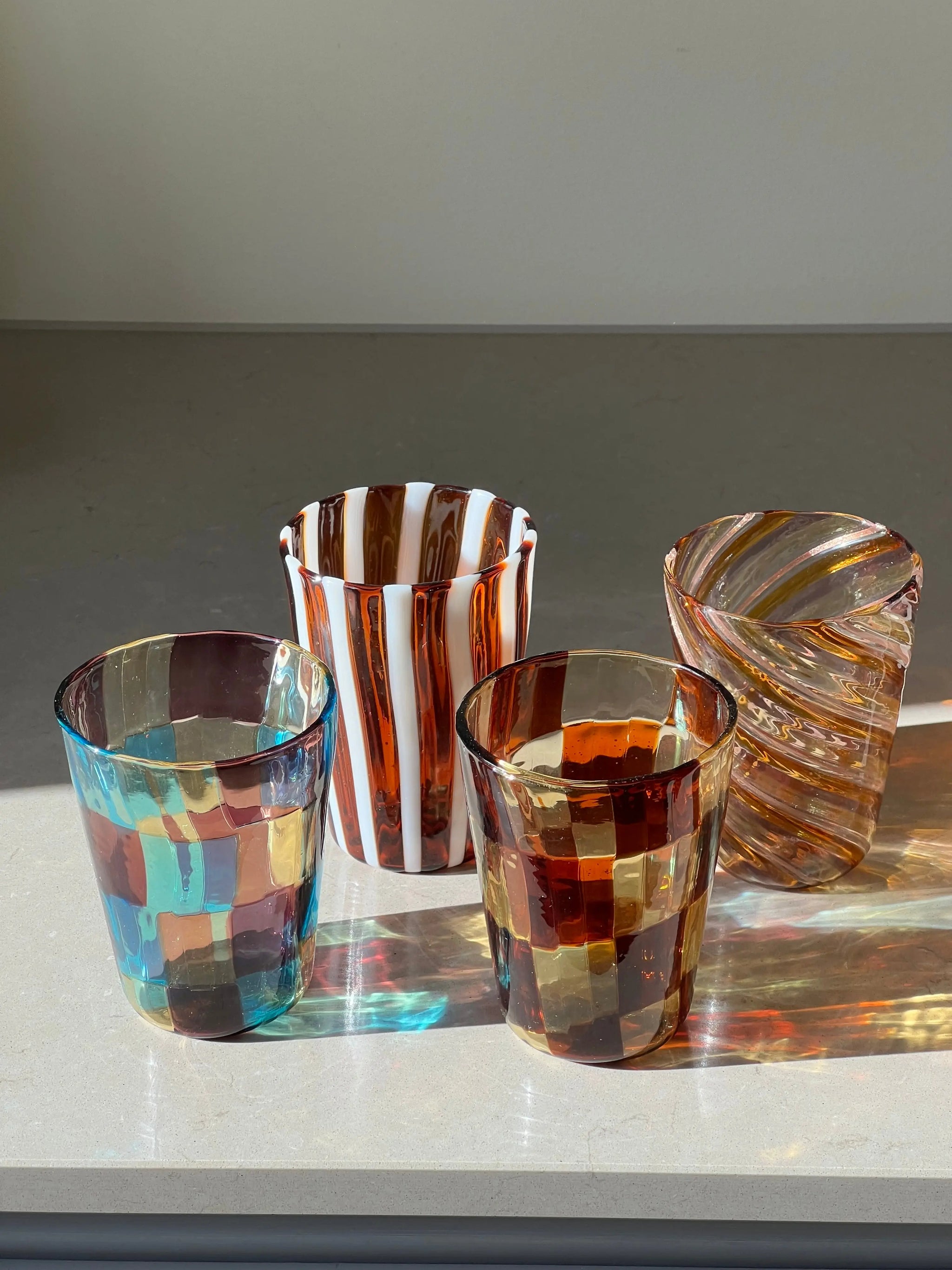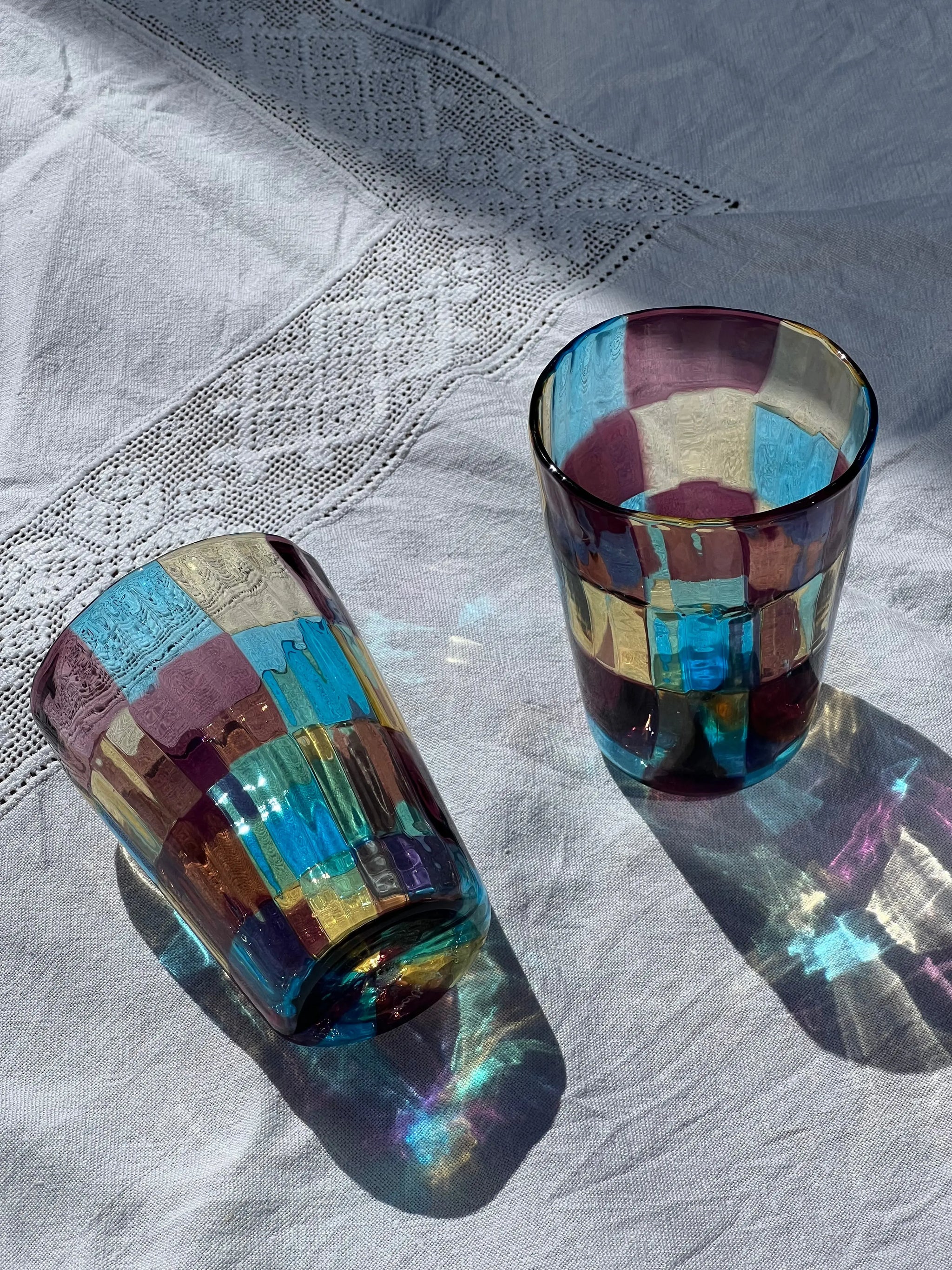 De smukke glas har et dynamisk mønster med skaktern i lyseblå, ametyst og lysegul. Det findes også med lysebrun/karamelbrune og mørkebrune skaktern. Farvesammensætningen tilføjer et unikt og raffineret touch til ethvert måltid eller sammenkomst. Glassene forhandles eksklusivt hos Studio Hafnia i Danmark.