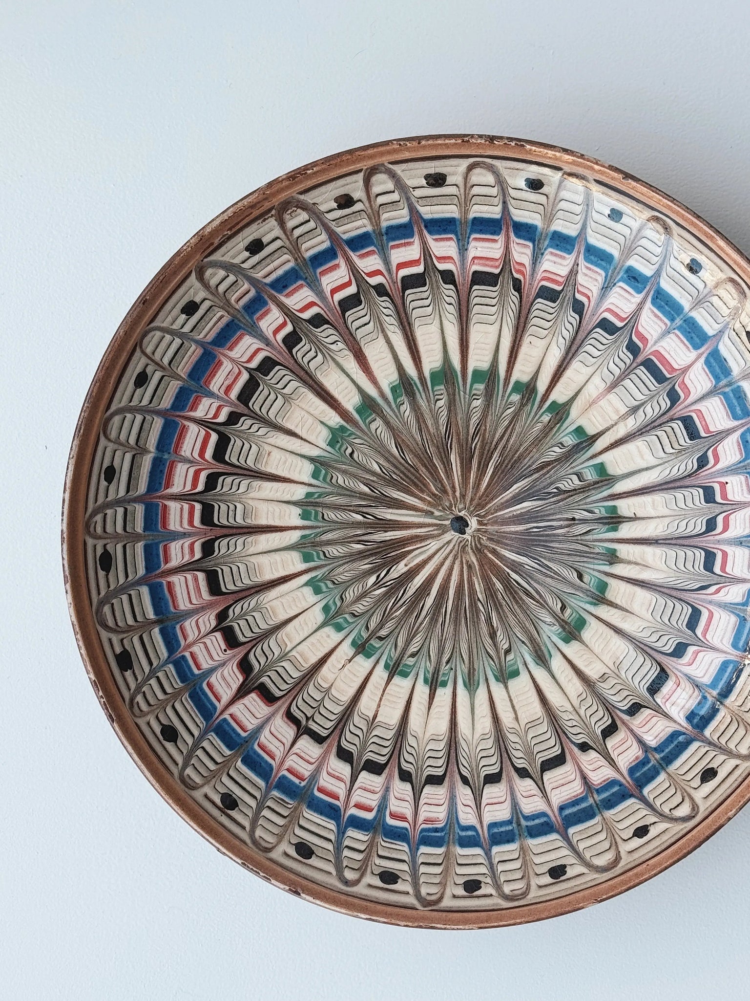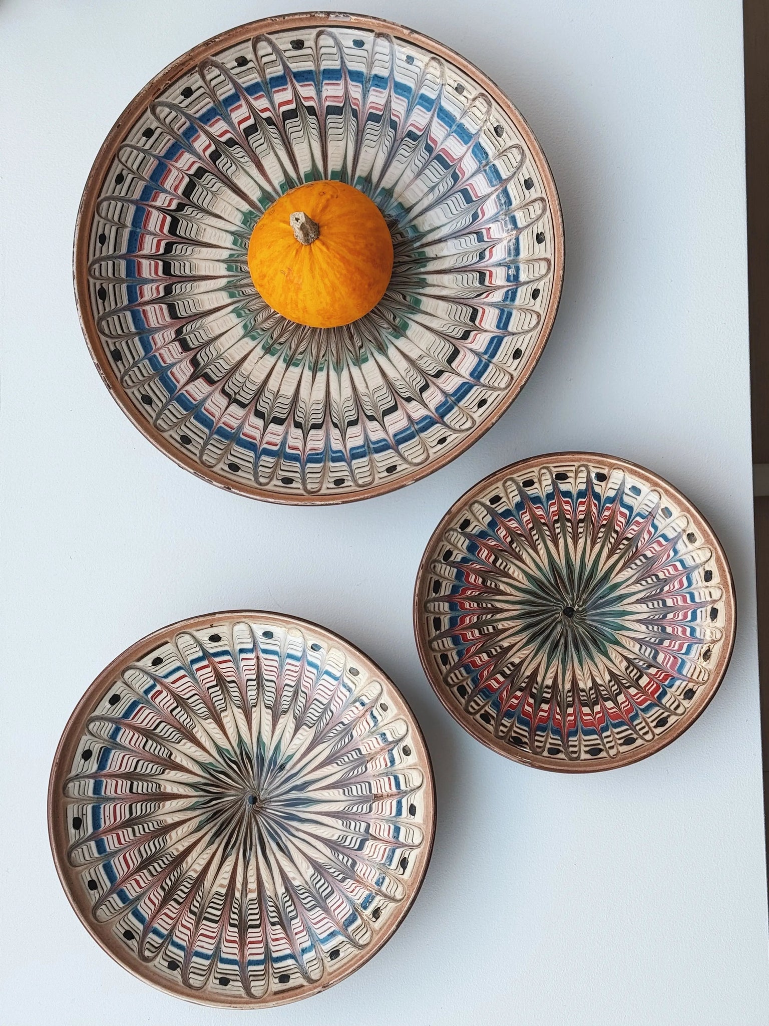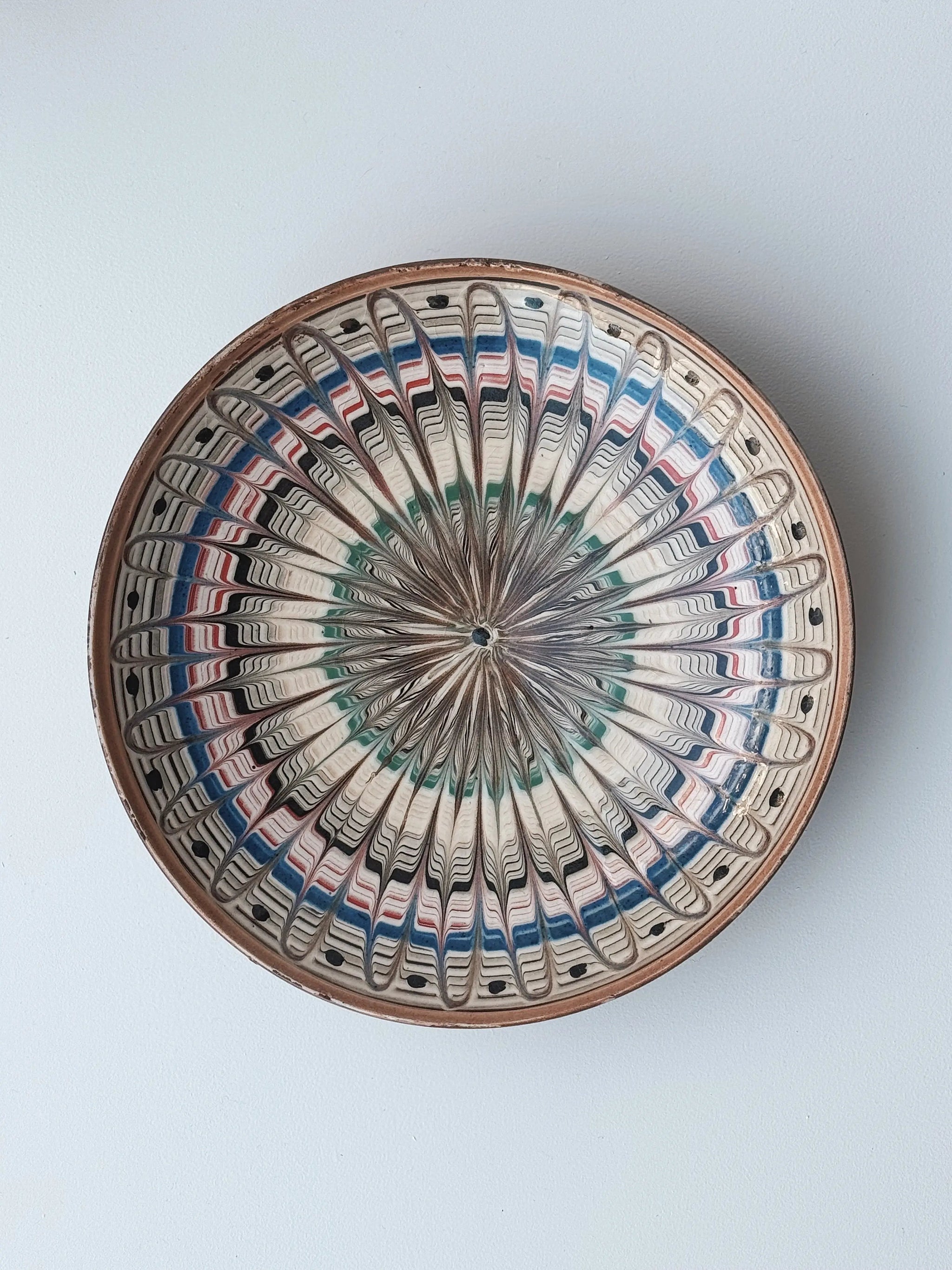 Smuk og dekorativ keramik tallerken/fad fra den rumænske by Horezu. Tallerkenen er skabt af dygtige lokale håndværkere og er omhyggeligt hånddrejet og håndmalet, hvilket giver den en unik karakter og skønhed. Ikke to tallerkener er helt ens, og teknikken er så enestående, at den er blevet optaget som en del af UNESCO’s verdensarv.