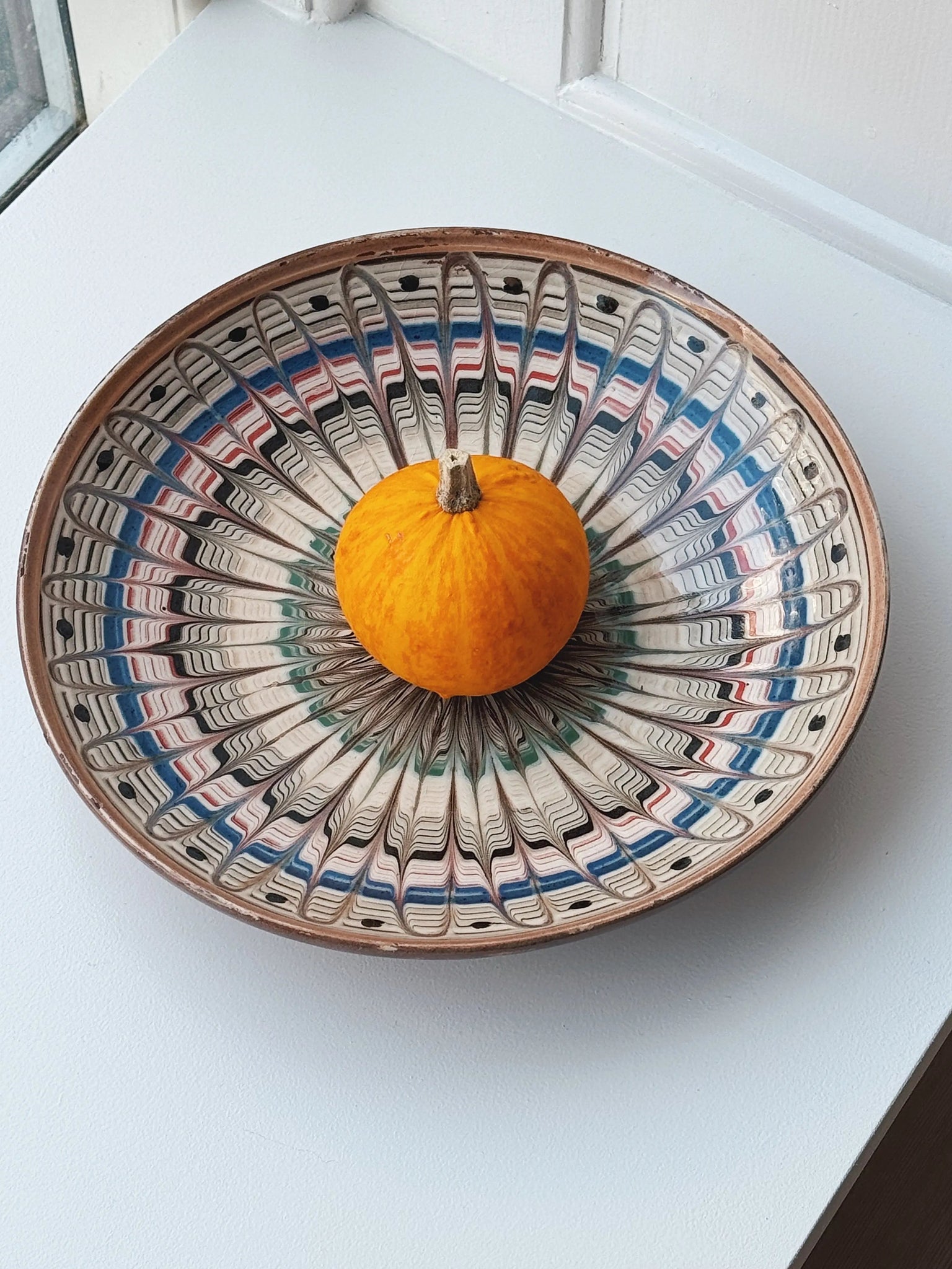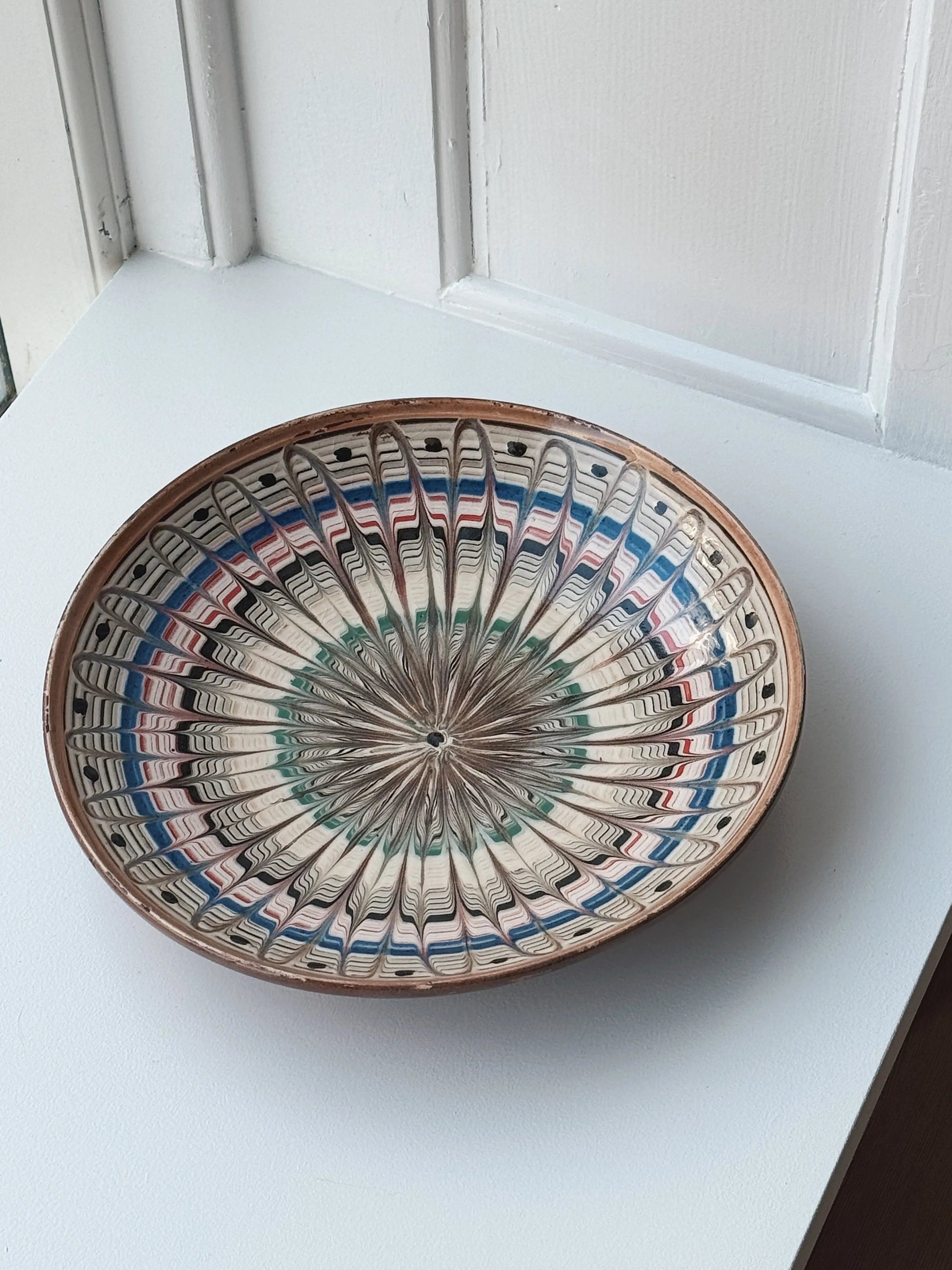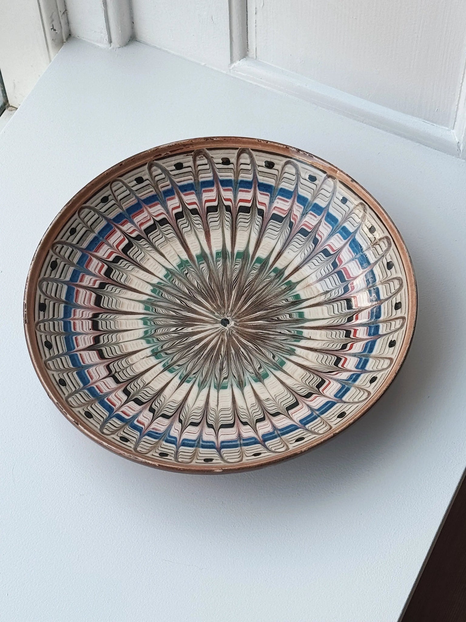 Smuk og dekorativ keramik tallerken/fad fra den rumænske by Horezu. Tallerkenen er skabt af dygtige lokale håndværkere og er omhyggeligt hånddrejet og håndmalet, hvilket giver den en unik karakter og skønhed. Ikke to tallerkener er helt ens, og teknikken er så enestående, at den er blevet optaget som en del af UNESCO’s verdensarv.