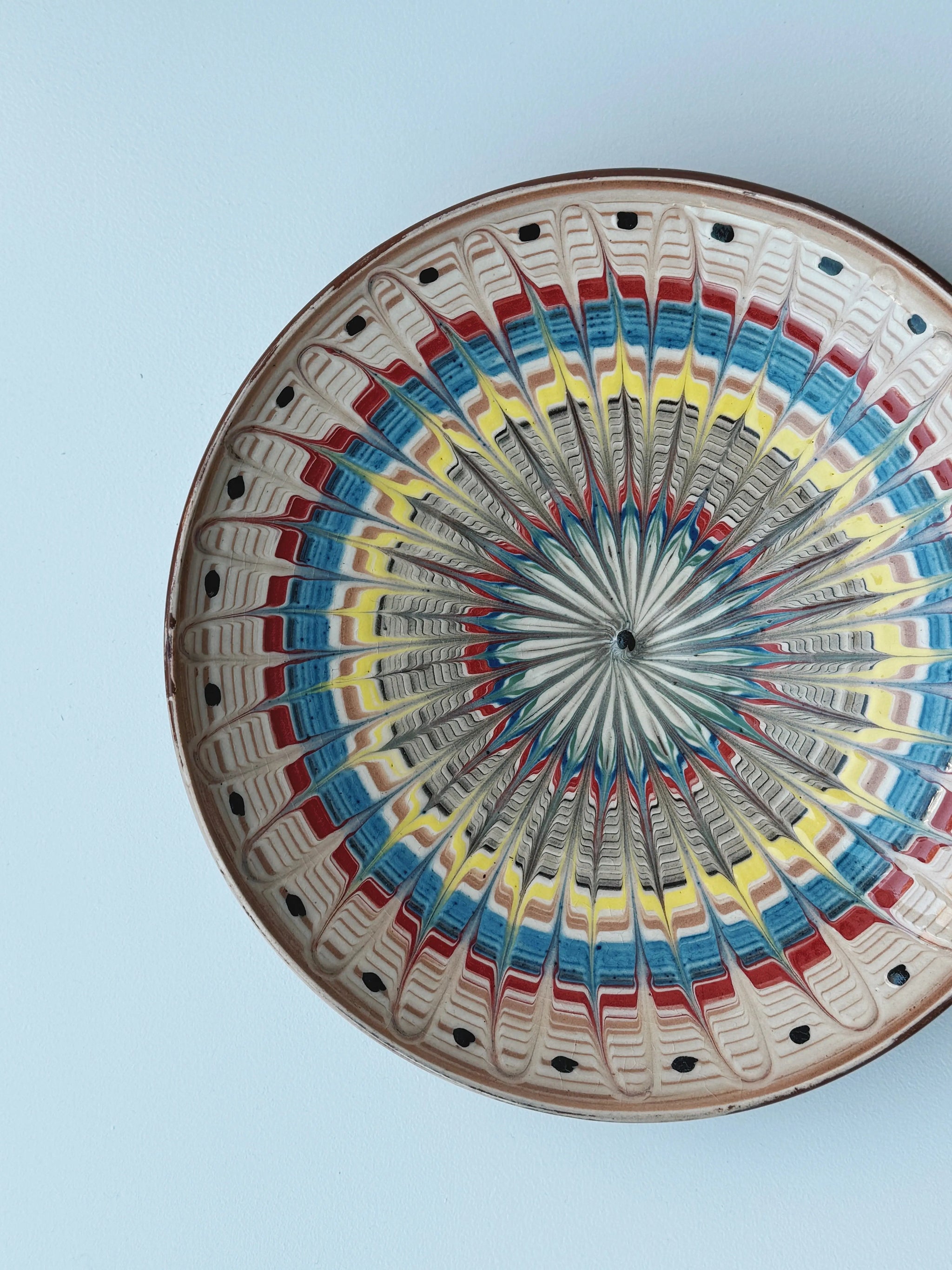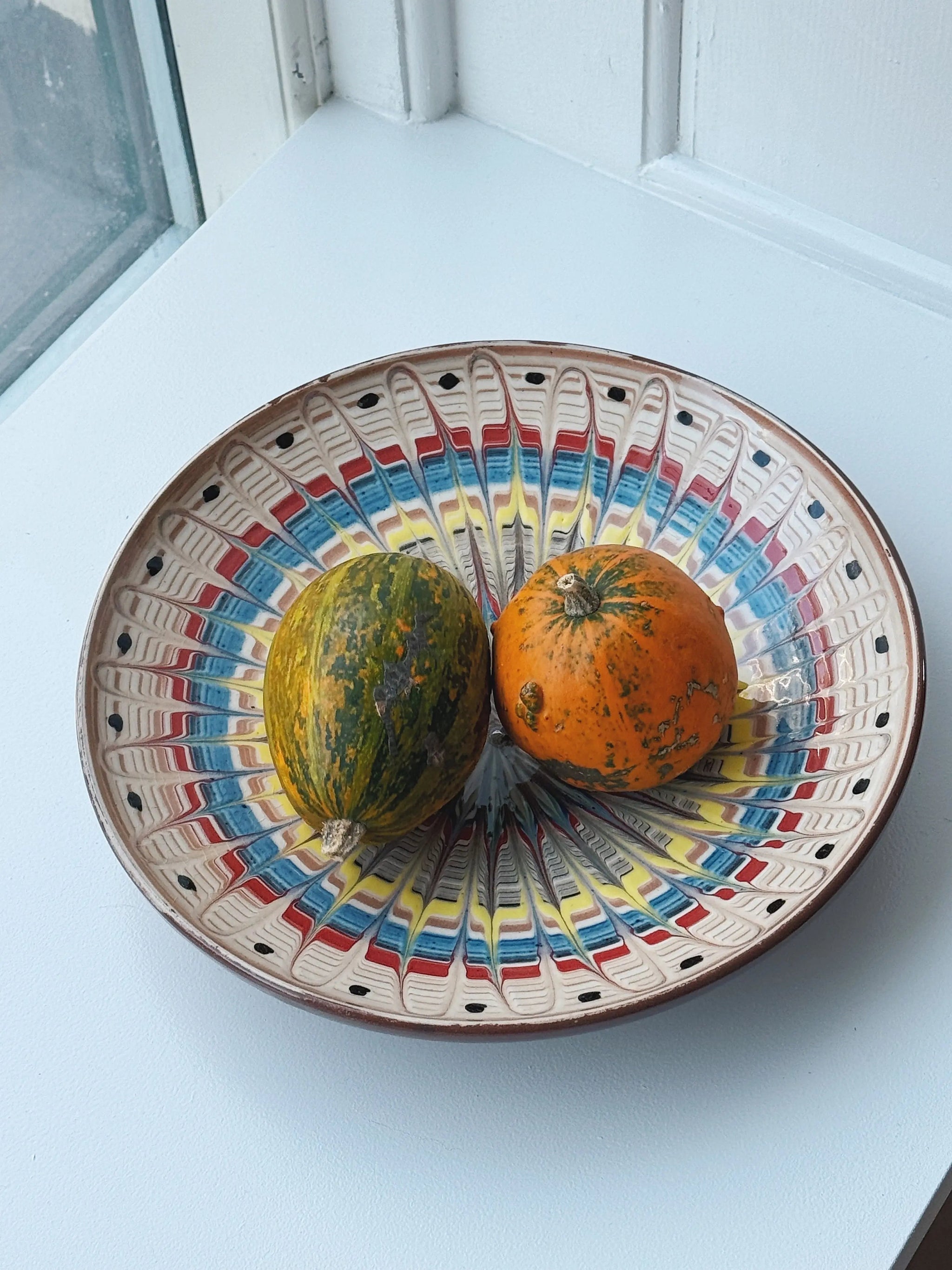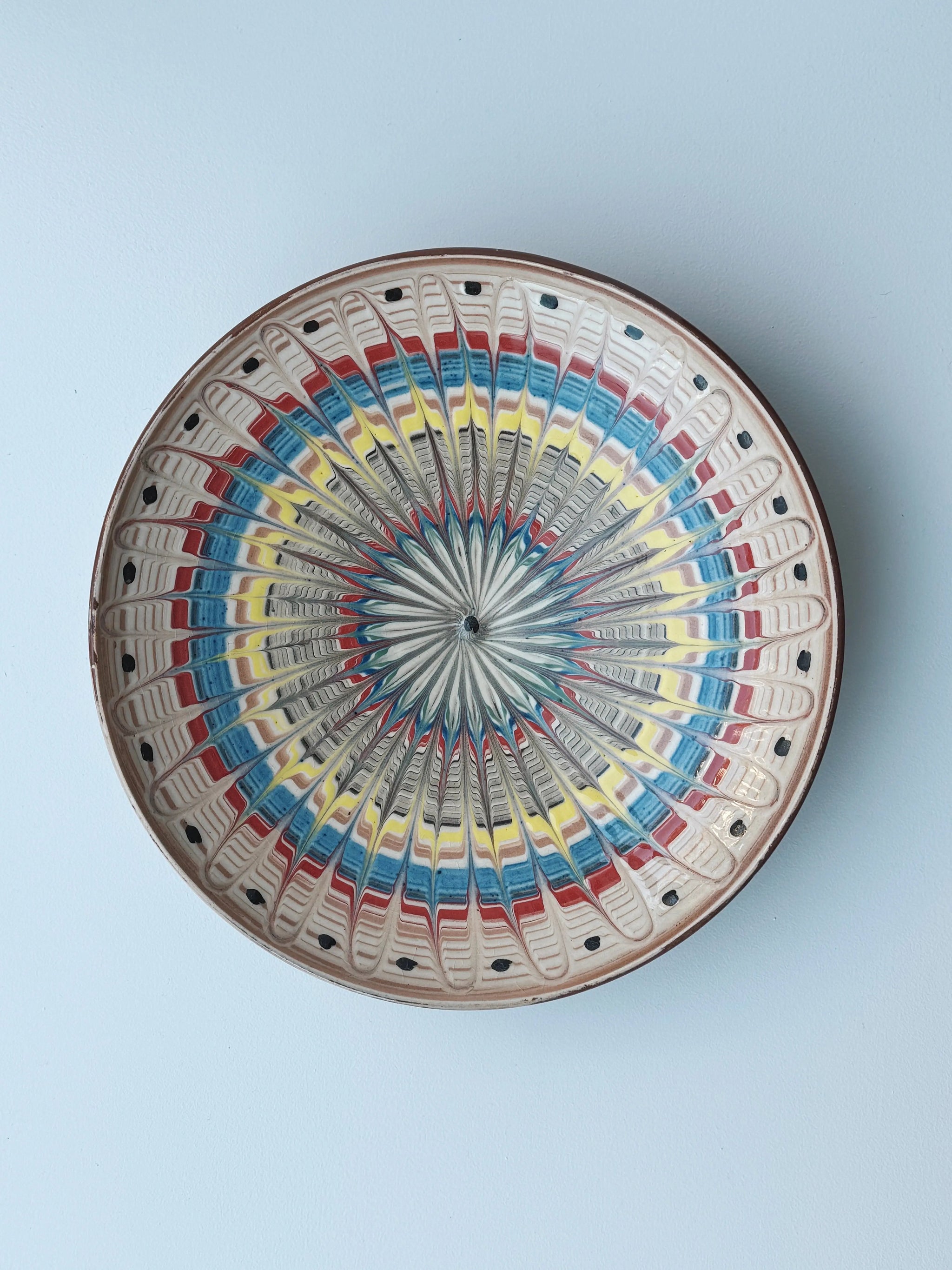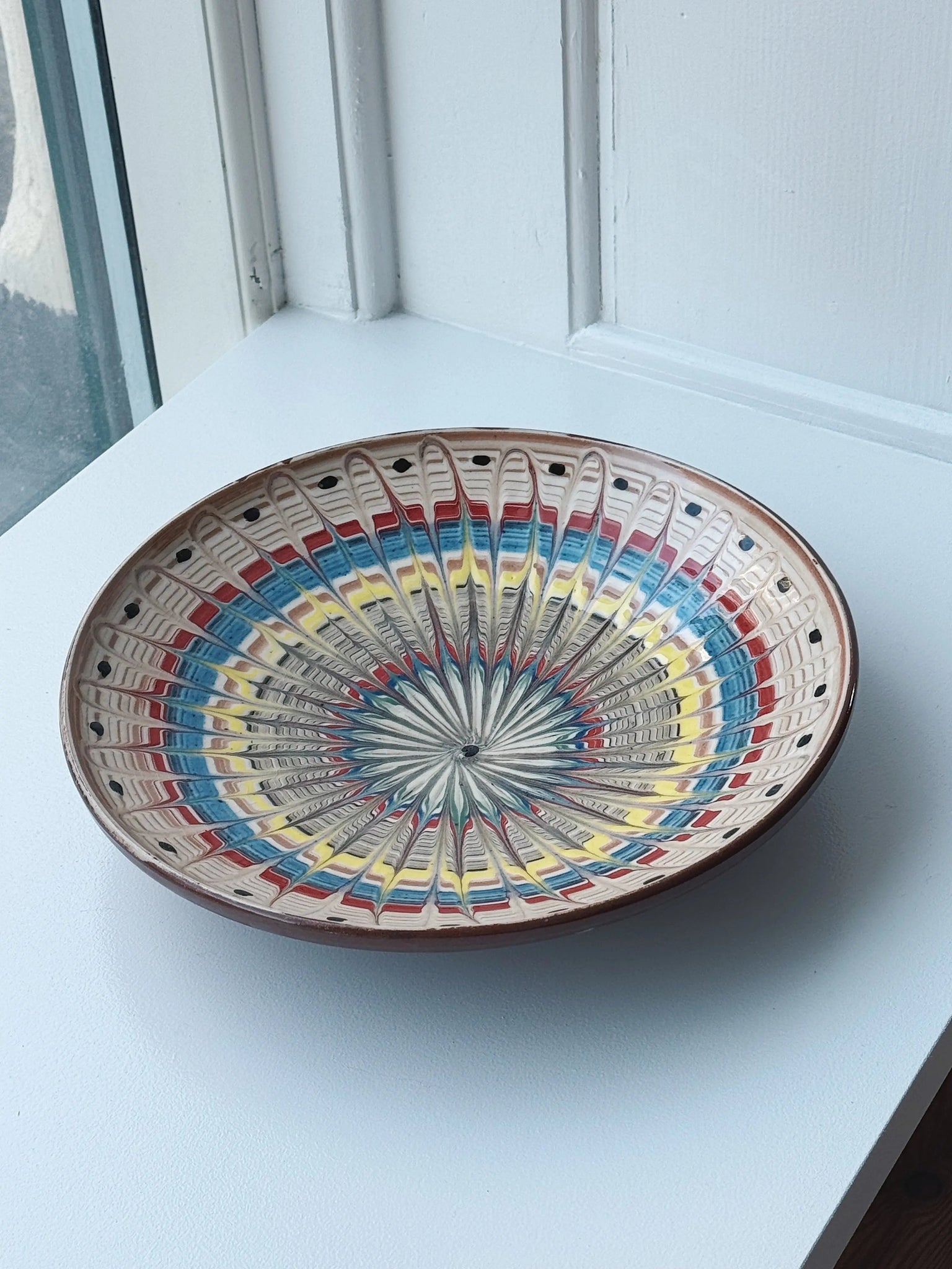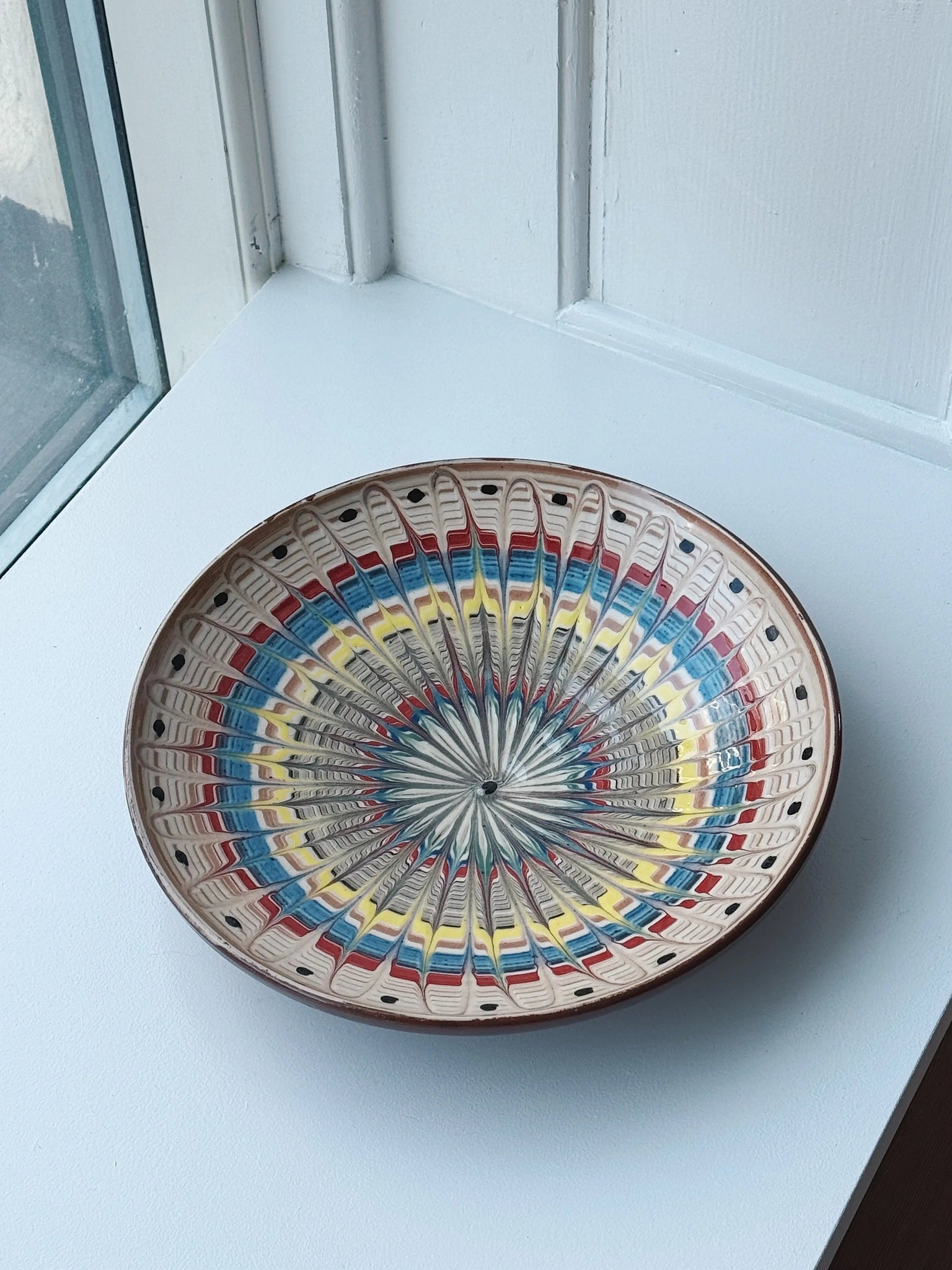 Smuk og dekorativ keramik tallerken/fad fra den rumænske by Horezu. Tallerkenen er skabt af dygtige lokale håndværkere og er omhyggeligt hånddrejet og håndmalet, hvilket giver den en unik karakter og skønhed. Ikke to tallerkener er helt ens, og teknikken er så enestående, at den er blevet optaget som en del af UNESCO’s verdensarv.