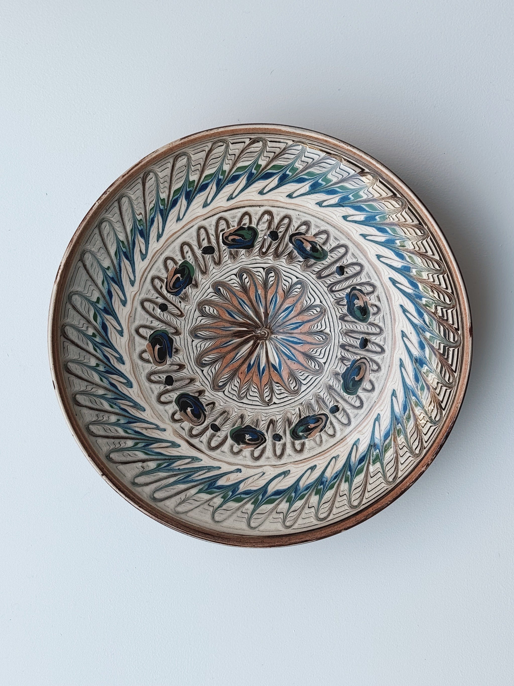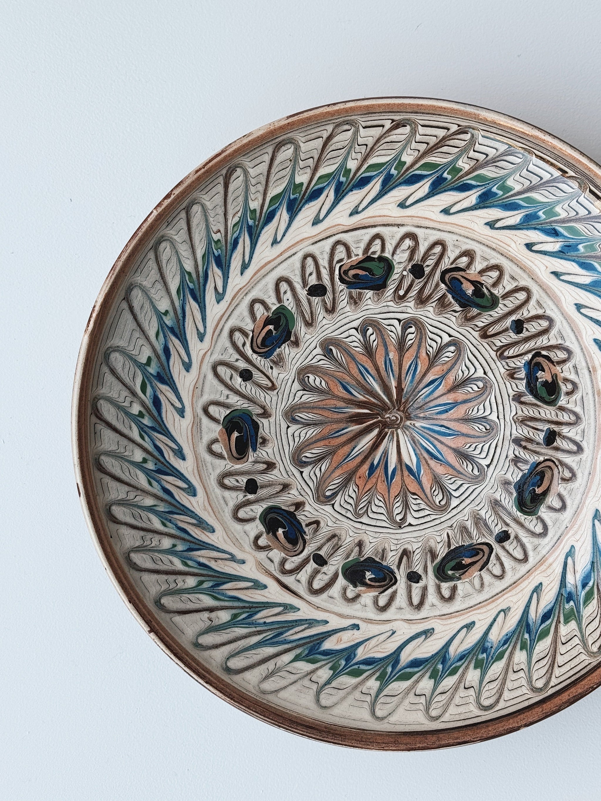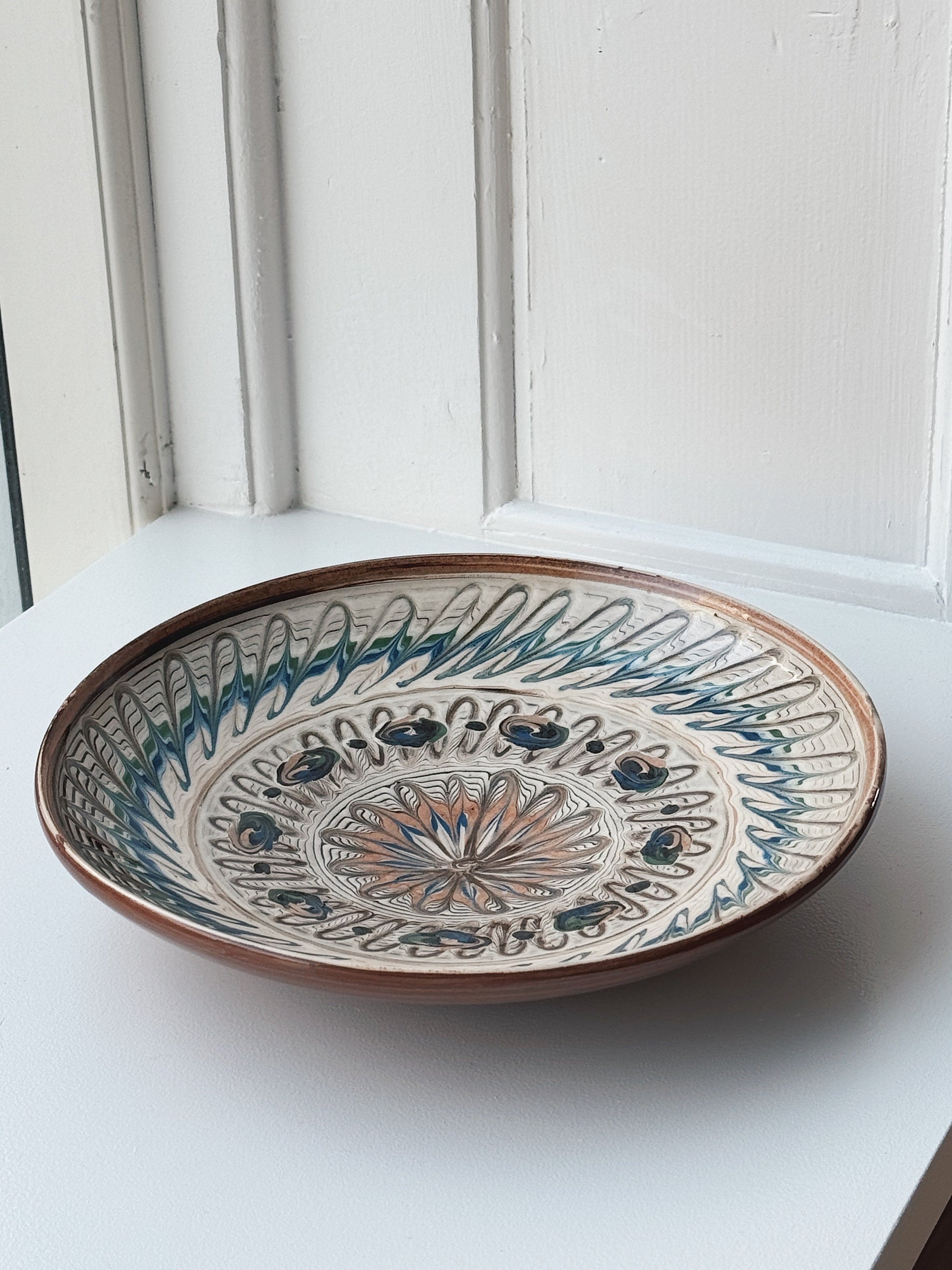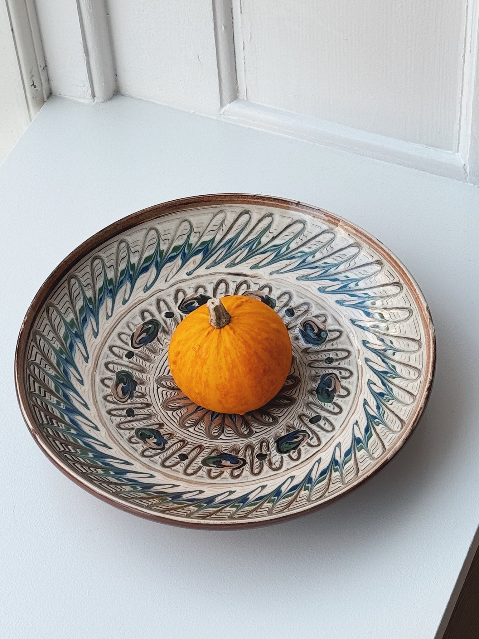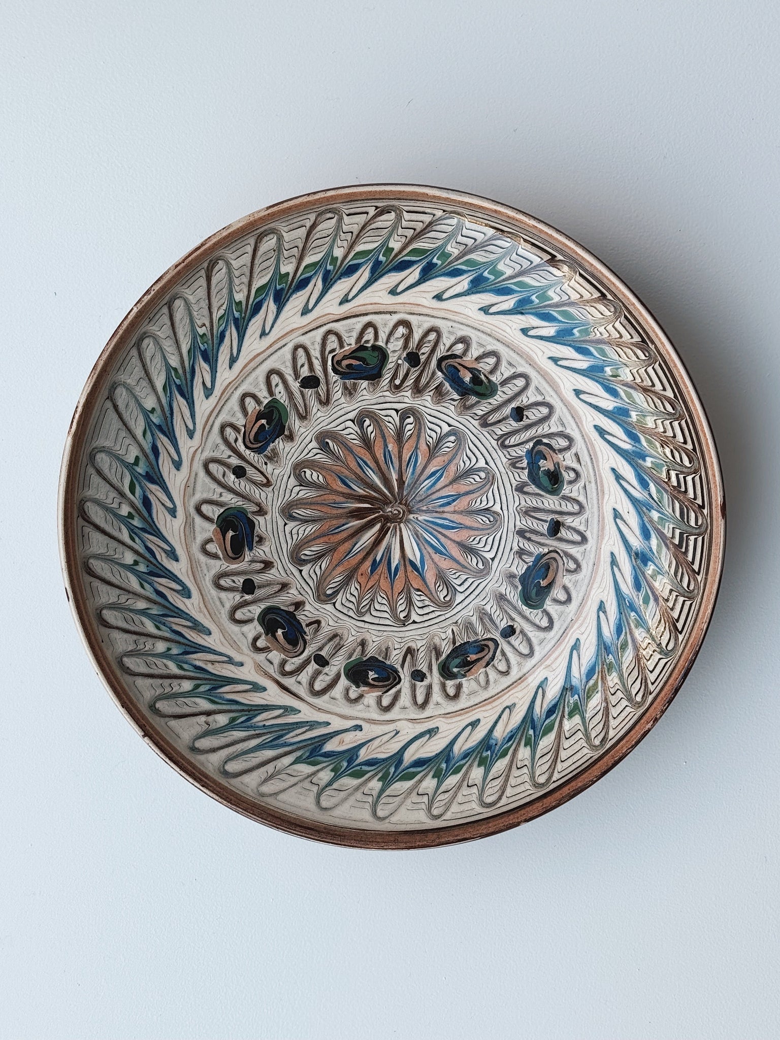 Smuk og dekorativ keramik tallerken/fad fra den rumænske by Horezu. Tallerkenen er skabt af dygtige lokale håndværkere og er omhyggeligt hånddrejet og håndmalet, hvilket giver den en unik karakter og skønhed. Ikke to tallerkener er helt ens, og teknikken er så enestående, at den er blevet optaget som en del af UNESCO’s verdensarv.