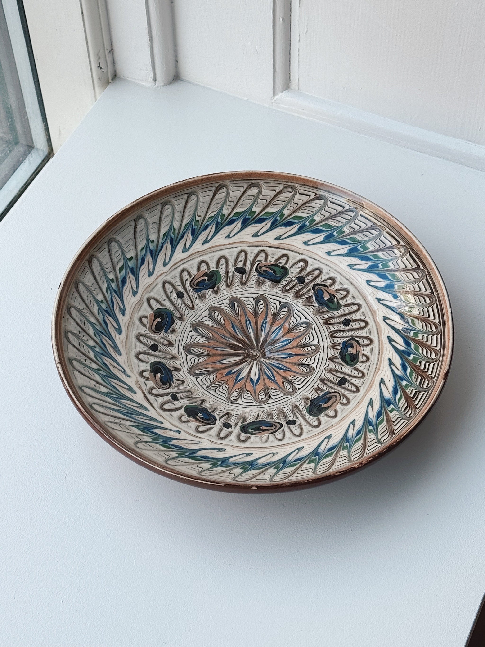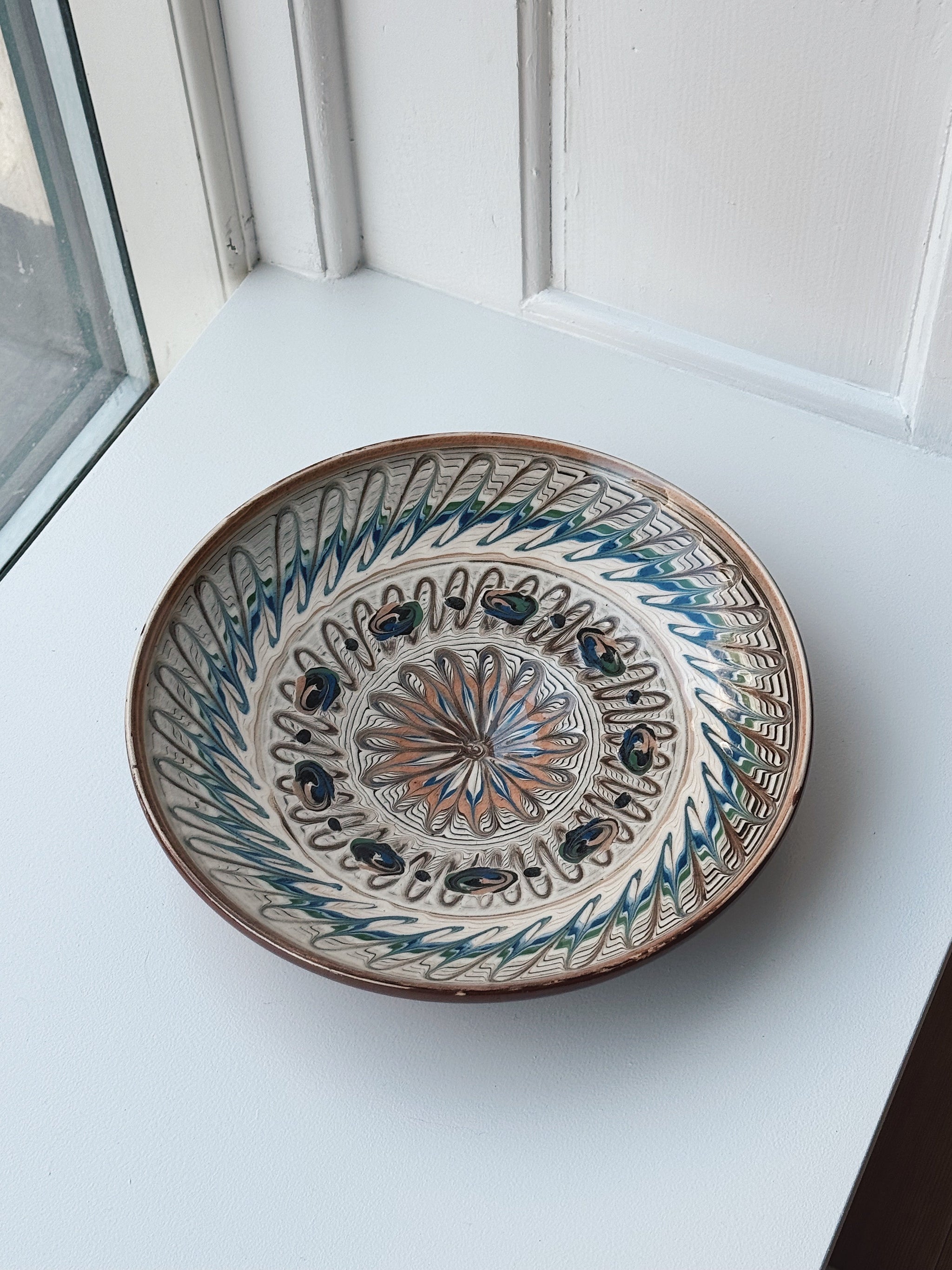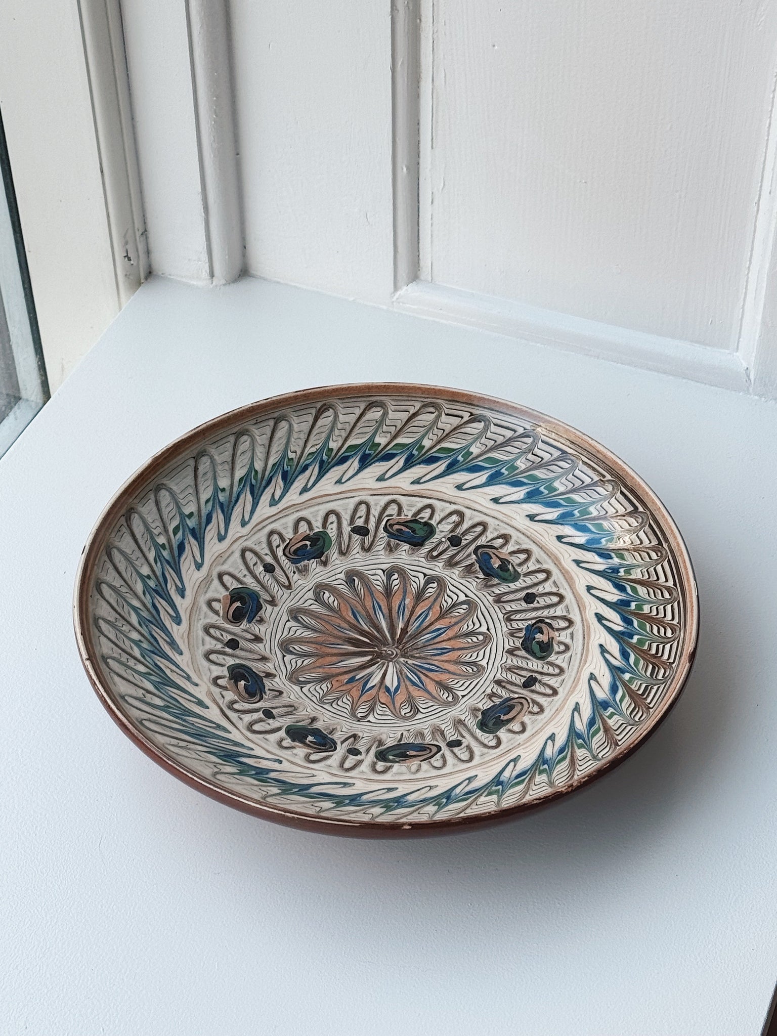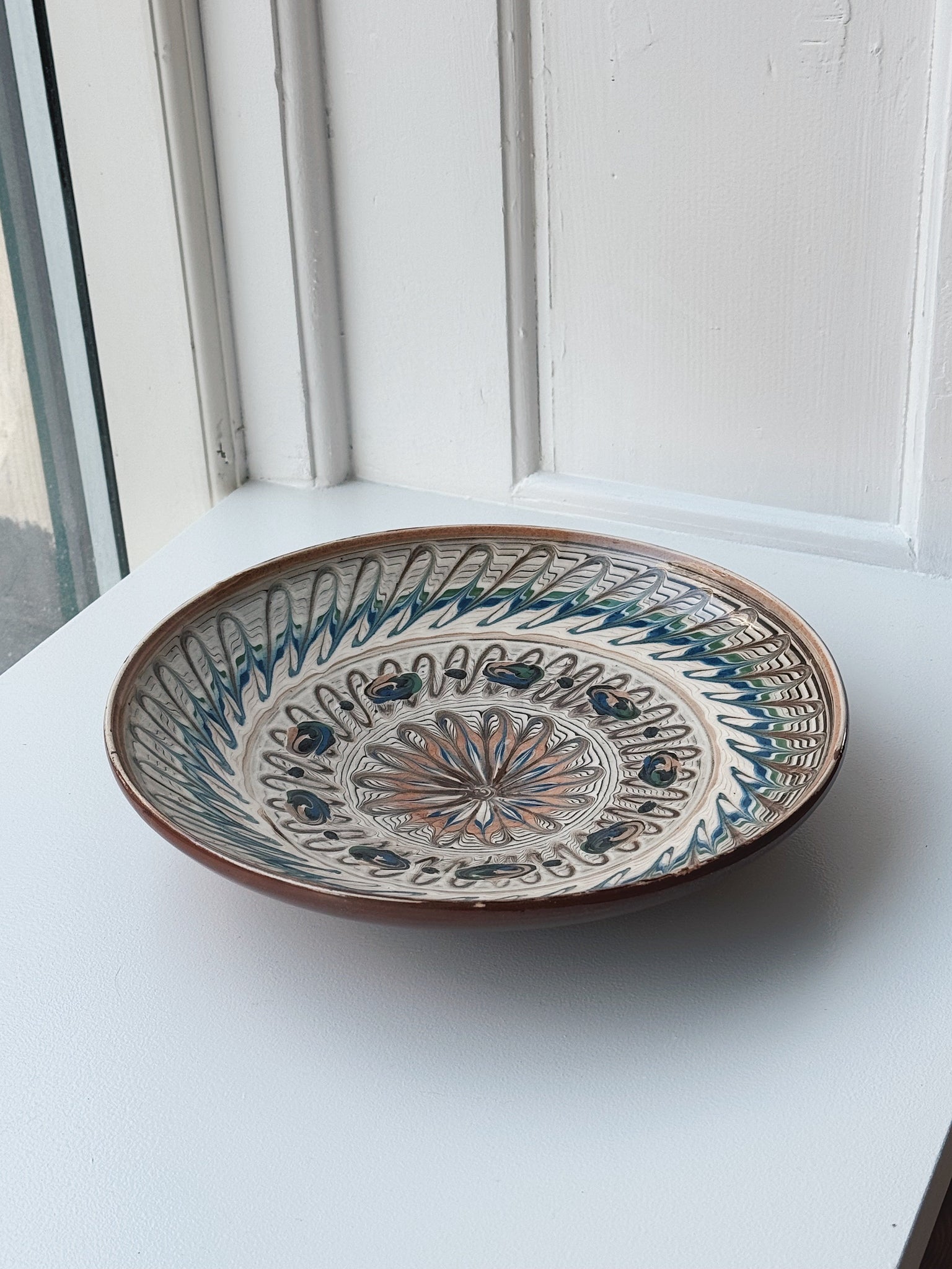 Smuk og dekorativ keramik tallerken/fad fra den rumænske by Horezu. Tallerkenen er skabt af dygtige lokale håndværkere og er omhyggeligt hånddrejet og håndmalet, hvilket giver den en unik karakter og skønhed. Ikke to tallerkener er helt ens, og teknikken er så enestående, at den er blevet optaget som en del af UNESCO’s verdensarv.
