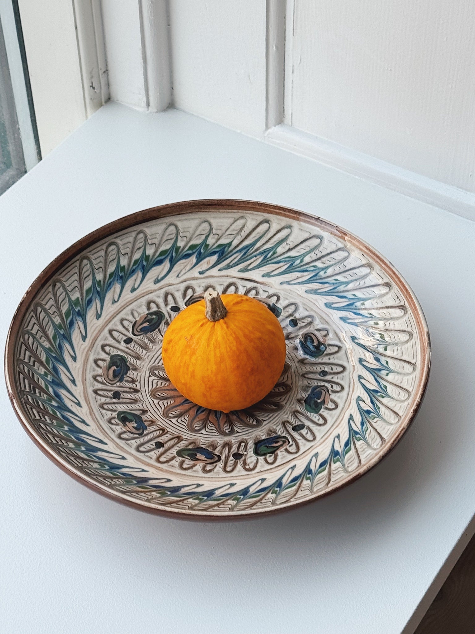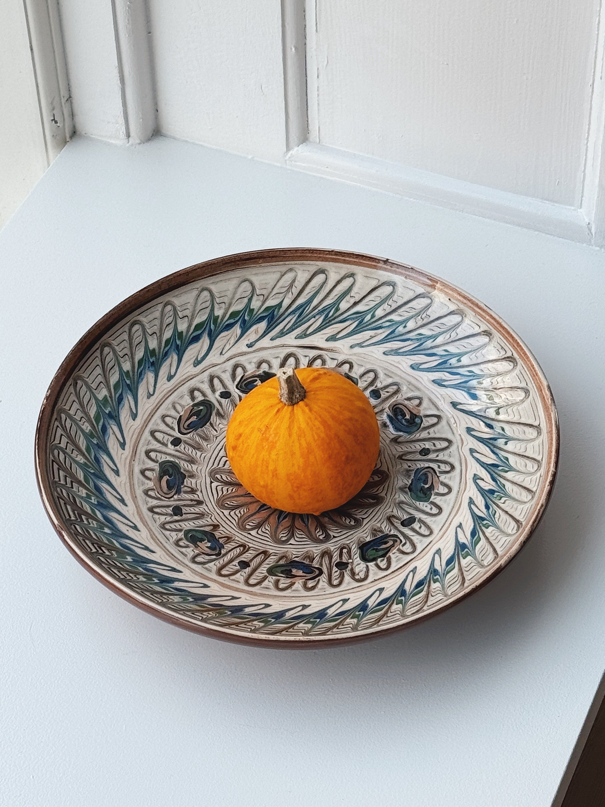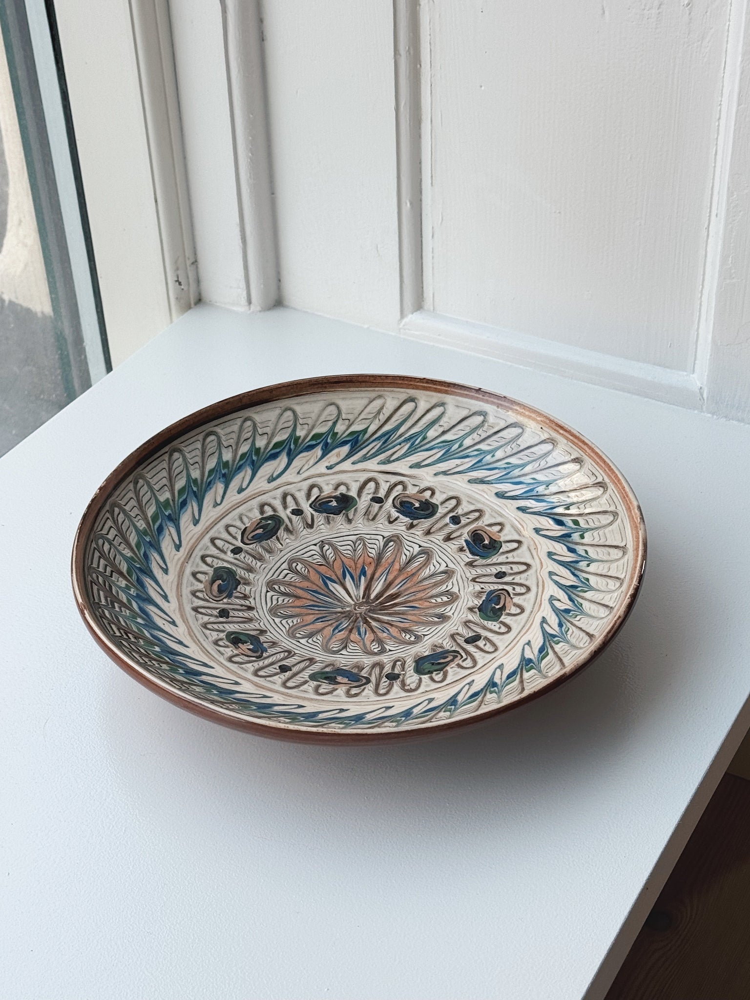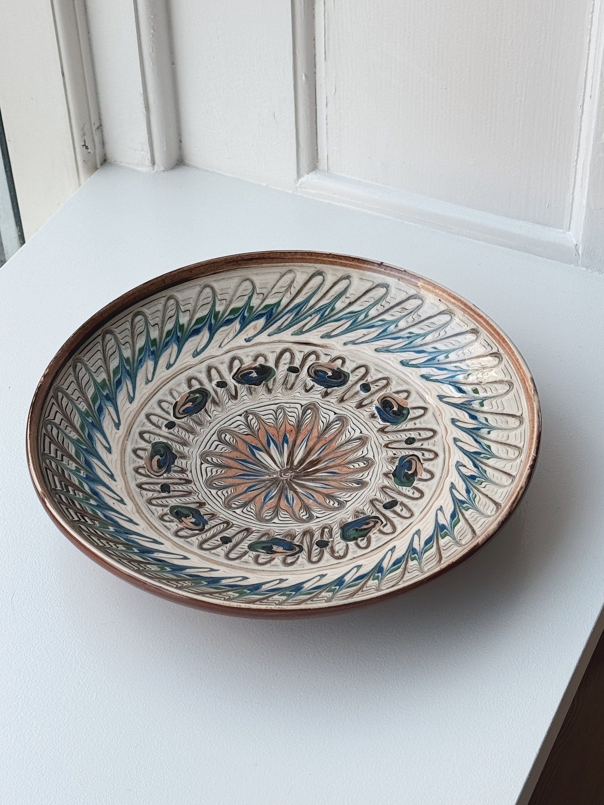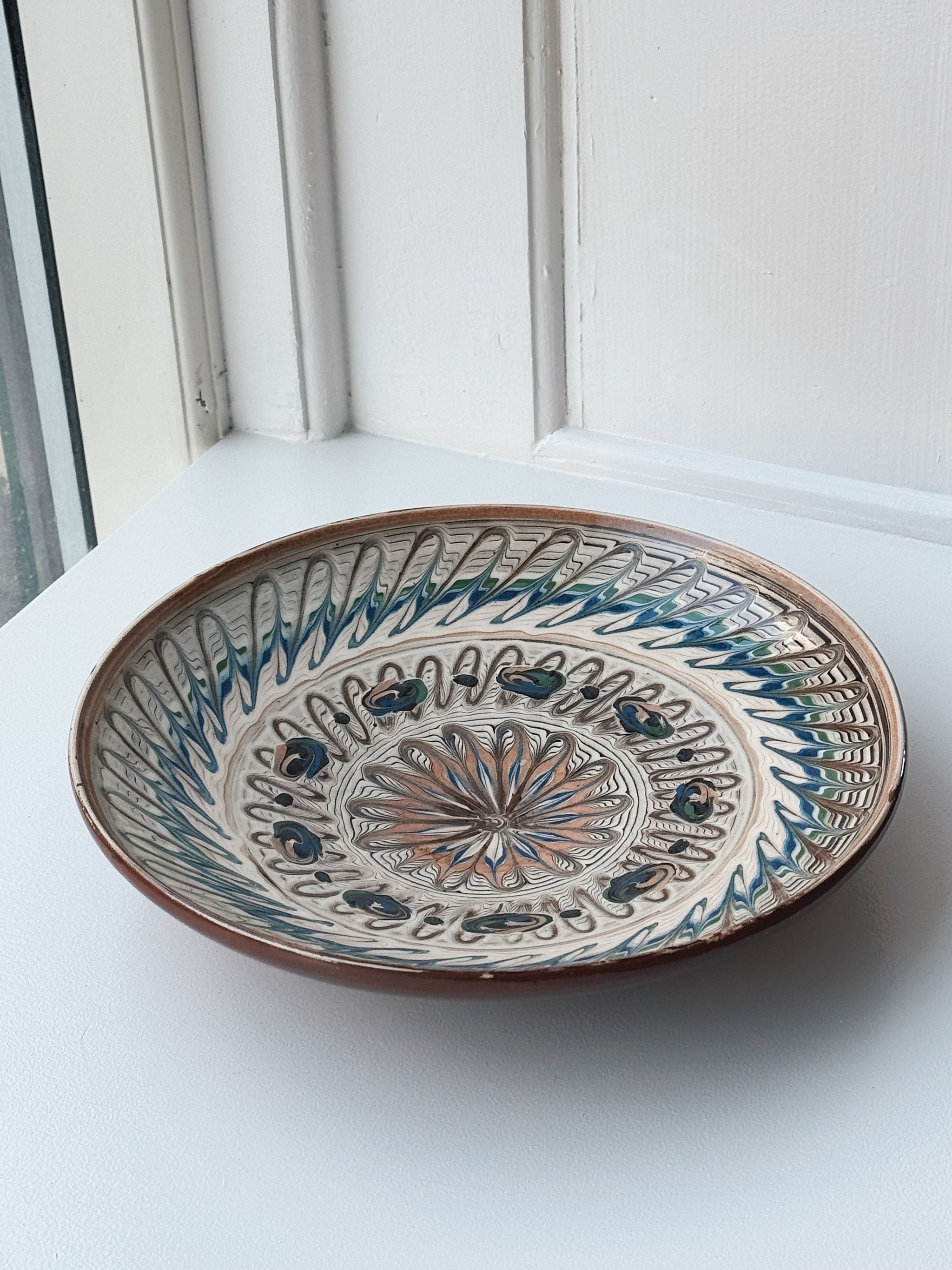 Smuk og dekorativ keramik tallerken/fad fra den rumænske by Horezu. Tallerkenen er skabt af dygtige lokale håndværkere og er omhyggeligt hånddrejet og håndmalet, hvilket giver den en unik karakter og skønhed. Ikke to tallerkener er helt ens, og teknikken er så enestående, at den er blevet optaget som en del af UNESCO’s verdensarv.