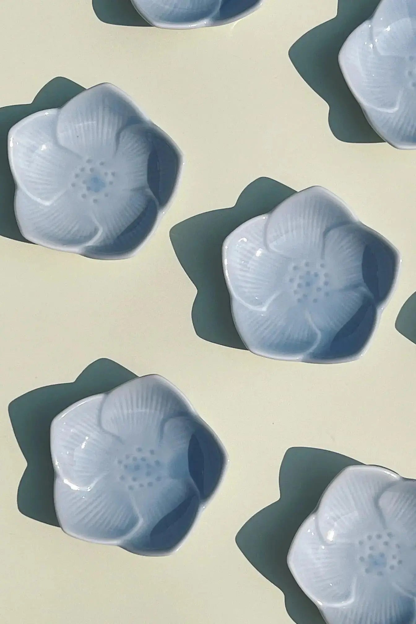 Lille, japansk blomsterformet tallerken/skål i lyseblå