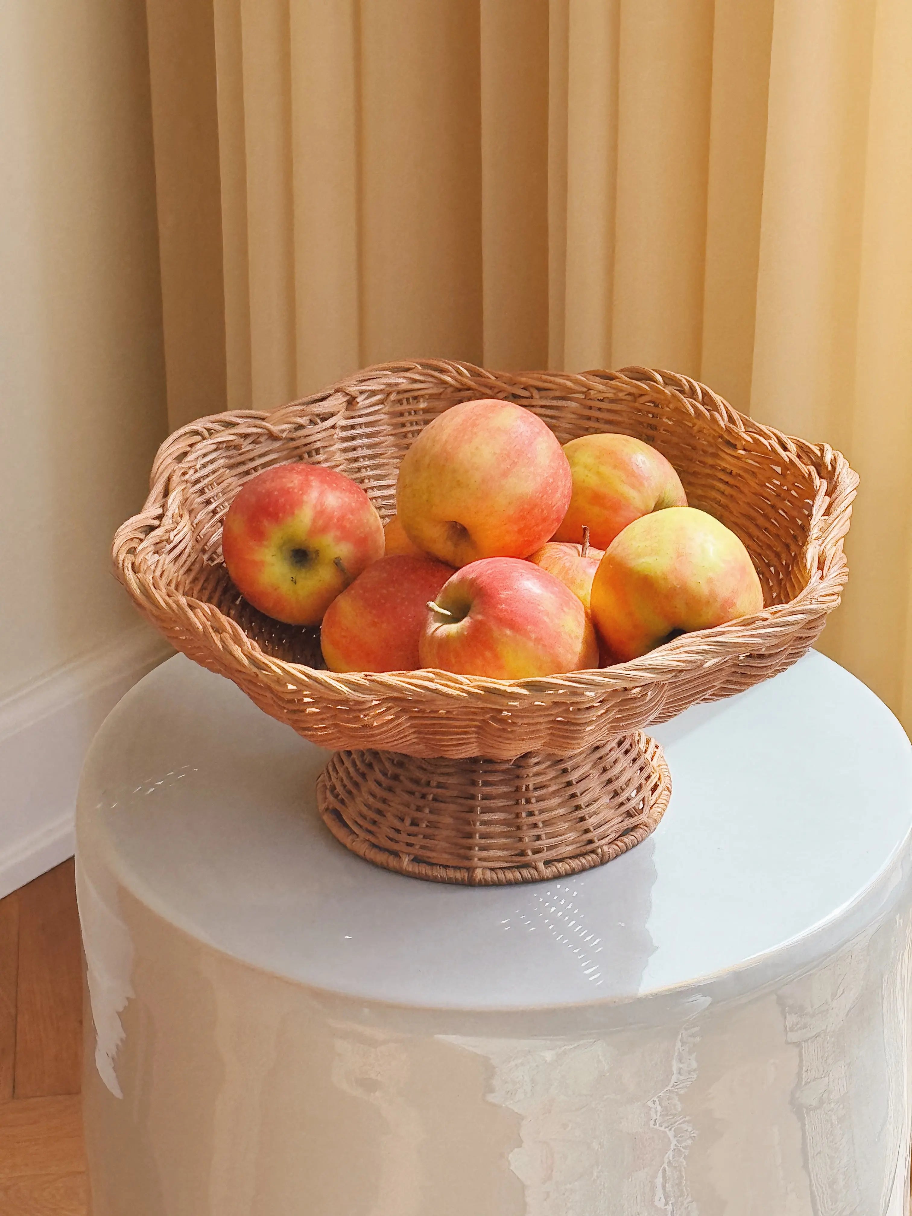 En dekorativ og funktionel skål i naturfarvet rattan – løftet elegant på en fod og med bløde, bølgede kanter. Denne håndflettede skål er ideel som frugtfad, centerpiece på spisebordet eller som base for dekorationer i stuen eller køkkenet.
